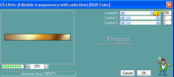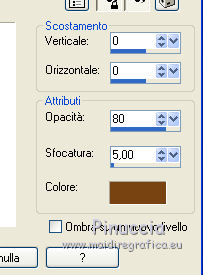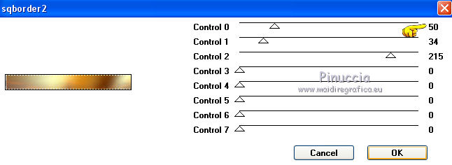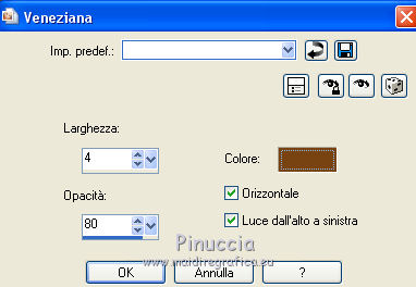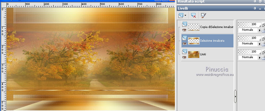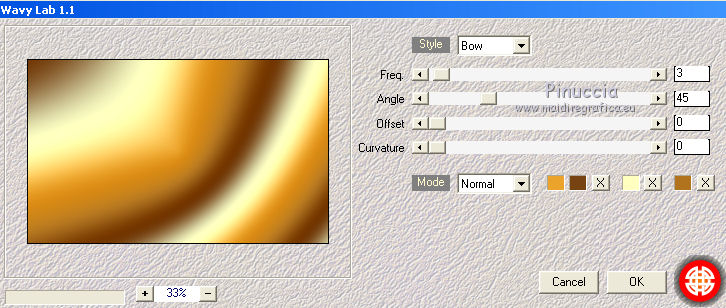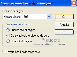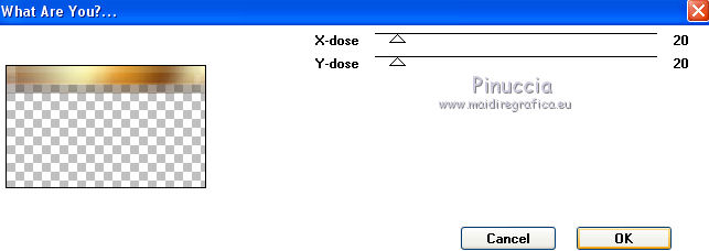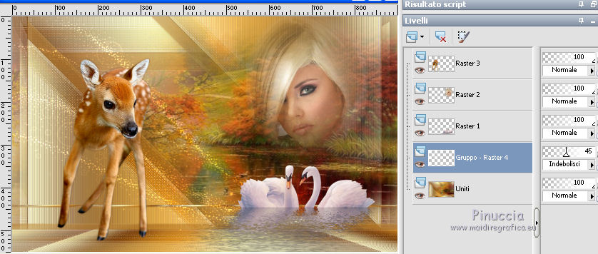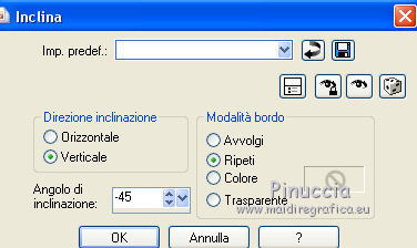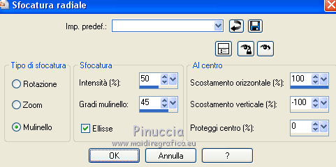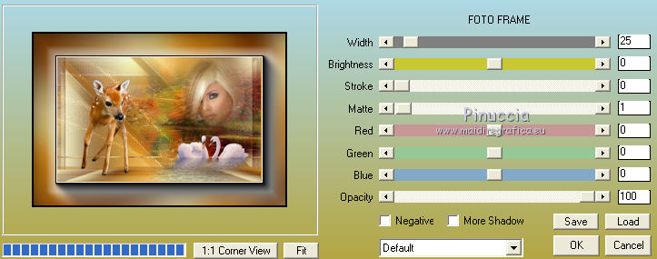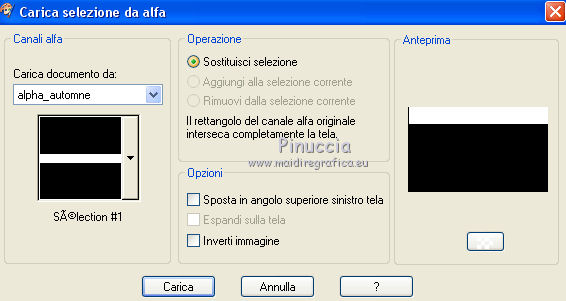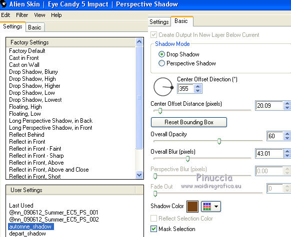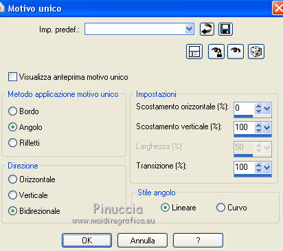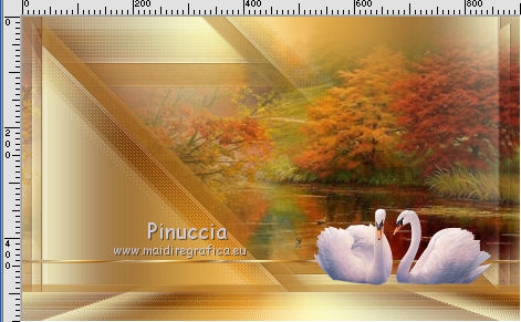Le vostre versioniOccorrente: Materiale qui Per la maschera grazie Narah. Il resto del materiale è di Saturnella. (in questa pagina trovi i links ai siti dei creatori di tubes) Filtri in caso di dubbi, ricorda di consultare la mia sezione filtri qui Filters Unlimited 2.0 qui Mehdi - Wavy Lab 1.1. qui AFS IMPORT - sqborder2 qui Carolaine adn Sensibility - CS-LDots qui Alien Skin Eye Candy 5 Impact - Perspective Shadow qui Toadies - What are you qui Flaming pear - Flood qui Mura's Meister - Perspective Tiling qui AAA Frames - Foto Frame qui I filtri AFS IMPORT e Toadies si possono usare da soli o importati in Filters Unlimited (come fare vedi qui) Se un filtro fornito appare con questa icona ![]() non esitare a cambiare modalità di miscelatura e opacità secondo i colori utilizzati. Metti il preset Cliccando sul file una o due volte (a seconda delle tue impostazioni), automaticamente il preset si installerà nella cartella corretta. perchè uno o due clic vedi qui Apri la maschere in PSP e minimizzala con il resto del materiale. Imposta il colore di primo piano con il colore 1 #784312, e il colore di sfondo con il colore 2 #eba32b. ![]() 1. Apri alpha_automne. Finestra>Duplica o sulla tastiera maiuscola+D per fare una copia. ![]() Chiudi l'originale. La copia, che sarà la base del tuo lavoro, non è vuota, ma contiene una selezione salvata sul canale alfa. Effetti>Plugins>Mehdi - Wavy Lab 1.1. Questo filtro crea gradienti con i colori della paletta; il primo è il colore di sfondo, il secondo quello di primo piano. Degli ultimi due colori creati dal filtro cambia il terzo colore con il colore 3 #ffffc0. ![]() Regola>Sfocatura>Sfocatura radiale. ![]() 3. Effetti>Effetti di bordo>Aumenta. 4. Livelli>Nuovo livello raster. Selezione>Seleziona tutto. Apri il tube sat_automne2 e vai a Modifica>Copia. Torna al tuo lavoro e vai a Modifica>Incolla nella selezione. Selezione>Deseleziona. 5. Effetti>Effetti di immagine>Motivo unico. ![]() 6. Regola>Messa a fuoco>Accentua messa a fuoco. Livelli>Unisci>Unisci visibile. 7. Selezione>Carica/Salva selezione>Carica selezione da canale alfa. La selezione #1 è subito disponibile. Devi soltanto cliccare Carica. ![]() Selezione>Innalza selezione a livello. Effetti>Plugins>AFS IMPORT - sqborder2. ![]() 8. Selezione>Modifica>Contrai - 10 pixels. ![]() Effetti>Plugins>Carolaine and Sensibility - CS-LDots. ![]() Selezione>Deseleziona. 9. Effetti>Plugins>Toadies - What are you. ![]() Regola>Messa a fuoco>Accentua messa a fuoco. 10. Livelli>Duplica. Immagine>Capovolgi. Immagine>Rifletti. Livelli>Unisci>Unisci giù. Effetti>Effetti 3D>Sfalsa ombra, colore scuro. ![]() 11. Livelli>Duplica. Effetti>Plugins>Mura's Meister - Perspective Tiling. ![]() 12. Attiva il livello sottostante. ![]() Livelli>Duplica. Effetti>Effetti geometrici>Inclina. ![]() 13. Effetti>Plugins>Alien Skin Eye Candy 5 Impact - Perspective Shadow. Seleziona il preset automne_shadow e ok. ![]() 14. Apri il tube deco e vai a Modifica>Copia. Torna al tuo lavoro e vai a Modifica>Incolla come nuovo livello. Effetti>Effetti 3D>Sfalsa ombra, con i settaggi precedenti. Modifica>Ripeti Sfalsa ombra. 15. Apri il tube sat_automne5 e vai a Modifica>Copia. Torna al tuo lavoro e vai a Modifica>Incolla come nuovo livello. Immagine>Ridimensiona, al 75%, tutti i livelli non selezionato. Tasto K sulla tastiera per attivare lo strumento Puntatore ![]() e imposta Posizione X: 315,00 e Posizione Y: -20,00 ![]() Tasto M per deselezionare lo strumento. Livelli>Unisci>Unisci visibile. 16. Apri il tube cygnes e vai a Modifica>Copia. Torna al tuo lavoro e vai a Modifica>Incolla come nuovo livello. Immagine>Ridimensiona, al 40%, tutti i livelli non selezionato. Regola>Messa a fuoco>Metti a fuoco. Sposta il tube a destra.![]() 17. Effetti>Plugins>Flaming Pear - Flood. ![]() 18. Apri il tube visage e vai a Modifica>Copia. Torna al tuo lavoro e vai a Modifica>Incolla come nuovo livello. Immagine>Ridimensiona, al 45%, tutti i livelli non selezionato. 19. Effetti>Effetti 3D>Sfalsa ombra, con i settaggi precedenti. Posiziona correttamente il tube in alto a destra.20. Apri il tube biche e vai a Modifica>Copia. Torna al tuo lavoro e vai a Modifica>Incolla come nuovo livello. Immagine>Rifletti. Immagine>Ridimensiona, 2 volte al 75%, tutti i livelli non selezionato. Sposta il tube a sinistra.21. Effetti>Effetti 3D>Sfalsa ombra, con i settaggi precedenti. 22. Attiva il livello di sfondo. Livelli>Nuovo livello raster. Imposta il colore di primo piano con il colore bianco #ffffff. Riempi il livello con il colore bianco.Livelli>Nuovo livello maschera>Da immagine. Apri il menu sotto la finestra di origine e vedrai la lista dei files aperti. Seleziona la maschera NarahsMask_1508. ![]() Immagine>Rifletti. Livelli>Unisci>Unisci gruppo. Cambia la modalità di miscelatura di questo livello in Indebolisci, e abbassa l'opacità al 45%. ![]() 23. Per i bordi: imposta nuovamente il colore di primo piano con il colore #784312. ![]() Immagine>Aggiungi bordatura, 1 pixel, simmetriche, colore di primo piano. Immagine>Aggiungi bordatura, 3 pixels, simmetriche, colore di sfondo. Immagine>Aggiungi bordatura, 1 pixel, simmetriche, colore di primo piano. Immagine>Aggiungi bordatura, 10 pixels, simmetriche, colore bianco. Immagine>Aggiungi bordatura, 1 pixel, simmetriche, colore di primo piano. Immagine>Aggiungi bordatura, 25 pixels, simmetriche, colore bianco. Immagine>Aggiungi bordatura, 1 pixel, simmetriche, colore di primo piano. Immagine>Aggiungi bordatura, 5 pixels, simmetriche, colore bianco. Immagine>Aggiungi bordatura, 1 pixel, simmetriche, colore di primo piano. 24. Selezione>Seleziona tutto. Immagine>Aggiungi bordatura, 60 pixels, simmetriche, colore di sfondo. Selezione>Inverti. Effetti>Plugins>Mehdi - Wavy Lab, con i settaggi precedenti. ![]() 25. Effetti>Effetti di trama>Veneziana, colore scuro. ![]() 26. Effetti>Plugins>AAA Frames - Foto Frame. ![]() Selezione>Deseleziona. 27. Apri il tube titre e vai a Modifica>Copia. Torna al tuo lavoro e