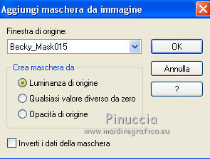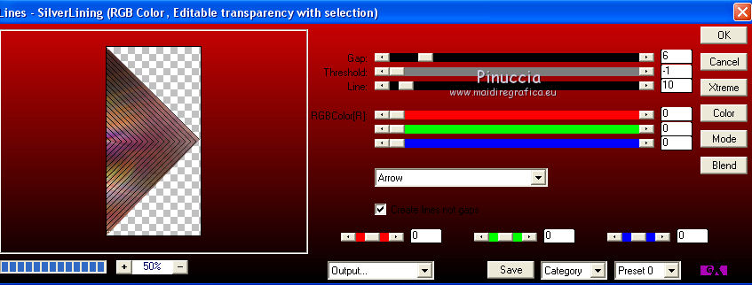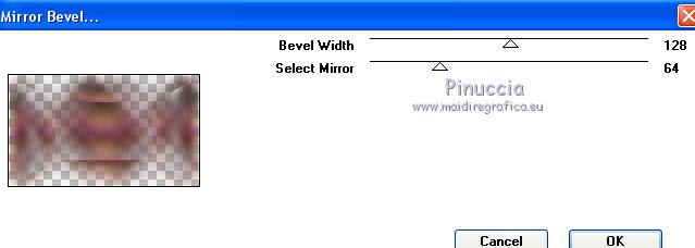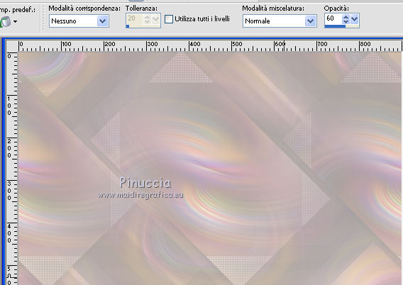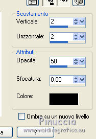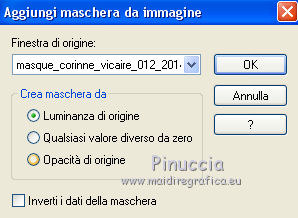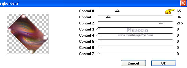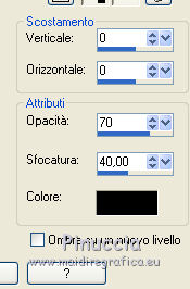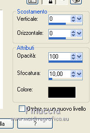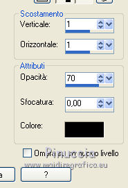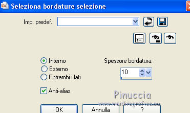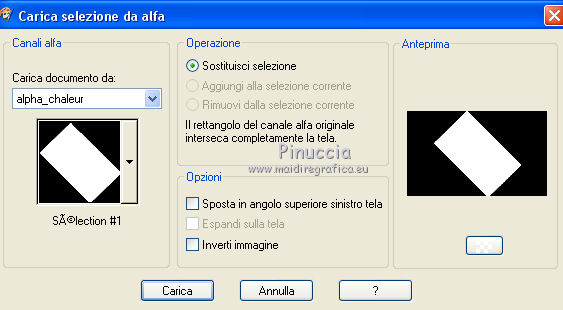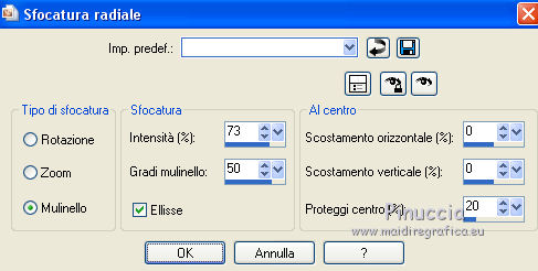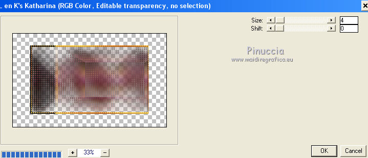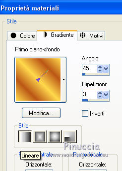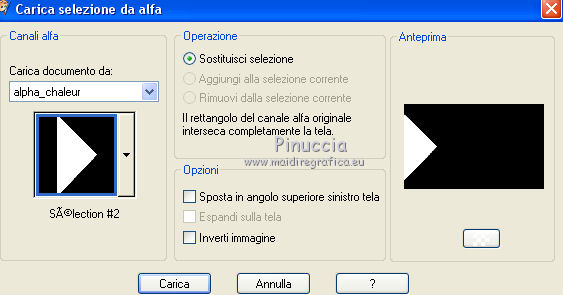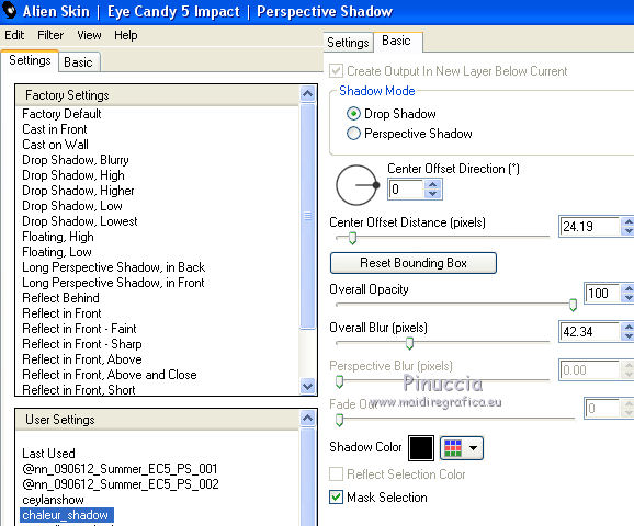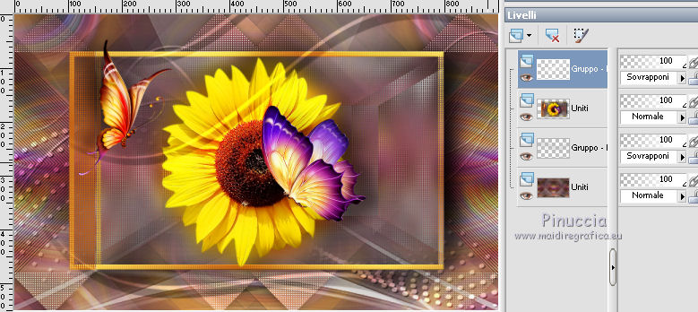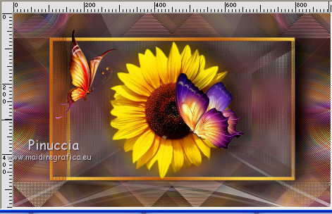 Le vostre versioniOccorrente: Materiale qui Per le maschere grazie Becky, Corinne Vicaire e Butterfly. Il resto del materiale è di Saturnella. (in questa pagina trovi i links ai siti dei creatori di tubes) Filtri in caso di dubbi, ricorda di consultare la mia sezione filtri qui Filters Unlimited 2.0 qui AFS IMPORT - sqborder2 qui AP 01 [Innovations] - Lines SilverLining qui Alf's Border FX - Mirror Bevel qui L&K's - L&K's Katharina qui Alien Skin Eye Candy 5 Impact - Perspective Shadow qui I filtri VM Instant Art si possono usare da soli o importati in Filters Unlimited (come fare vedi qui) Se un filtro fornito appare con questa icona ![]() non esitare a cambiare modalità di miscelatura e opacità secondo i colori utilizzati. Metti il preset Cliccando sul file una o due volte (a seconda delle tue impostazioni), automaticamente il preset si installerà nella cartella corretta. perchè uno o due clic vedi qui Apri le maschere in PSP e minimizzale con il resto del materiale. Colori utilizzati ![]() 1. Apri alpha_chaleur. Finestra>Duplica, o sulla tastiera tasto della maiuscola+D per fare una copia. ![]() Chiudi l'originale. La copia, che sarà la base del tuo lavoro, non è vuota, ma contiene le selezioni salvate sul canale alfa. Rinomina il livello "Raster 1". Selezione>Seleziona tutto. Apri il frattale somany.jpg e vai a Modifica>Copia. Torna al tuo lavoro e vai a Modifica>Incolla nella selezione. Selezione>Deseleziona. 2. Regola>Sfocatura>Sfocatura radiale. ![]() Effetti>Effetti di bordo>Aumenta di più. 3. Livelli>Duplica. Livelli>Nuovo livello maschera>Da immagine. Apri il menu sotto la finestra di origine e vedrai la lista dei files aperti. Seleziona la maschera Becky_Mask015. ![]() Effetti>Effetti di bordo>Aumenta. Livelli>Unisci>Unisci gruppo. Non preoccuparti se non vedi la differenza. E' normale. 4. Effetti>Effetti 3D>Sfalsa ombra. ![]() ![]() 5. Livelli>Duplica. Immagine>Ruota per gradi - 45 gradi a sinistra. ![]() Livelli>Duplica. Immagine>Rifletti. Livelli>Unisci>Unisci giù. 6. Effetti>Effetti di immagine>Motivo unico, con i settaggi standard. ![]() 7. Attiva il livello di sfondo. Selezione>Carica/Salva selezione>Carica selezione da canale alfa. La selezione #1 è subito disponibile. Devi soltanto cliccare Carica. ![]() Selezione>Innalza selezione a livello. Livelli>Disponi>Porta in alto. 8. Effetti>Plugins>AFS IMPORT - sqborder2. ![]() Selezione>Deseleziona. 9. Effetti>Effetti di immagine>Motivo unico. ![]() 10. Effetti>Effetti 3D>Sfalsa ombra. ![]() 11. Imposta il colore di primo piano con il colore bianco. Livelli>Nuovo livello raster. Abbassa l'opacità dello strumento Riempimento a 60 e riempi il livello con il colore bianco.![]() Livelli>Nuovo livello maschera>Da immagine. Apri il menu sotto la finestra di origine Seleziona la maschera masque_corinne_vicaire_012_2014 ![]() Effetti>Effetti di bordo>Aumenta. Livelli>Unisci>Unisci gruppo. Cambia la modalità di miscelatura di questo livello in Sovrapponi. 12. Effetti>Effetti 3D>Sfalsa ombra, con i settaggi precedenti. Livelli>Unisci>Unisci giù. Livelli>Duplica. Immagine>Rifletti. Abbassa l'opacità di questo livello al 50%. Livelli>Unisci>Unisci giù. Modifica>Copia. 13. Selezione>Carica/Salva selezione>Carica selezione da canale alfa. Apri il menu delle selezioni e carica la selezione #2. ![]() Selezione>Innalza seleziona livello. 14. Effetti>Plugins>AP 01 [Innovations] - Lines SilverLining. ![]() Selezione>Deseleziona. 15. Livelli>Duplica. Immagine>Rifletti. Livelli>Unisci>Unisci giù. Livelli>Unisci>Unisci visibile. 16. Livelli>Nuovo livello raster. Selezione>Carica/Salva selezione>Carica selezione da canale alfa. Apri il menu delle selezioni e carica la selezione #3. ![]() Modifica>Incolla nella selezione (l'immagine copiata al punto 12). ![]() Regola>Sfocatura>Sfocatura gaussiana - raggio 20. ![]() 16. Effetti>Plugins>Alf's Border FX - Mirror Bevel, con i settaggi standard. ![]() Selezione>Modifica>Seleziona bordature selezione. ![]() Imposta il colore di primo piano con il colore 1 #91cf8c, e il colore di sfondo con il colore 2 #5b6513. ![]() Passa il colore di primo piano a Gradiente di primo piano/sfondo, stile Lineare. ![]() Riporta l'opacità dello strumento Riempimento a 100. Riempi la selezione con il gradiente.18. Effetti>Effetti 3D>Smusso a incasso. ![]() Selezione>Deseleziona. 19. Effetti>Plugins>L&K's - L&K's Katharina. ![]() 20. Apri il tube del girasole sat_tour01 e vai a Modifica>Copia. Torna al tuo lavoro e vai a Modifica>Incolla come nuovo livello. Immagine>Ridimensiona, al 60%, tutti i livelli non selezionato. Posiziona correttamente il tube.21. Livelli>Duplica. Attiva il livello sottostante dell'originale. Regola>Sfocatura>Sfocatura gaussiana, con i settaggi precedenti. Cambia la modalità di miscelatura di questo livello in Moltiplica. 22. Attiva il livello superiore. Apri il tube sat_pap03 e vai a Modifica>Copia. Torna al tuo lavoro e vai a Modifica>Incolla come nuovo livello. Immagine>Ridimensiona, 1 volta al 50% e 1 volta all'80%, tutti i livelli non selezionato. Regola>Messa a fuoco>Metti a fuoco. Posiziona correttamente il tube, vedi il mio esempio.23. Effetti>Effetti 3D>Sfalsa ombra. ![]() 24. Chiudi il livello di sfondo. Livelli>Unisci>Unisci visibile. Effetti>Plugins>Alien Skin Eye Candy 5 Impact - Perspective Shadow, seleziona il preset chaleur_shadow e ok. ![]() Riapri il livello di sfondo e rimani posizionato sul livello Uniti. 25. Apri il tube sat_pap02 e vai a Modifica>Copia. Torna al tuo lavoro e vai a Modifica>Incolla come nuovo livello. Immagine>Rifletti. Immagine>Ridimensiona, 1 volta al 50% e una volta al 70%, tutti i livelli non selezionato. 26. Effetti>Effetti 3D>Sfalsa ombra. ![]() Posiziona correttamente il tube.![]() Livelli>Unisci>Unisci giù. 27. Livelli>Nuovo livello raster. Imposta nuovamente il colore di primo piano con il colore bianco. Riempi il livello con il colore di primo piano.Livelli>Nuovo livello maschera>Da immagine. Apri il menu sotto la finestra di origine e