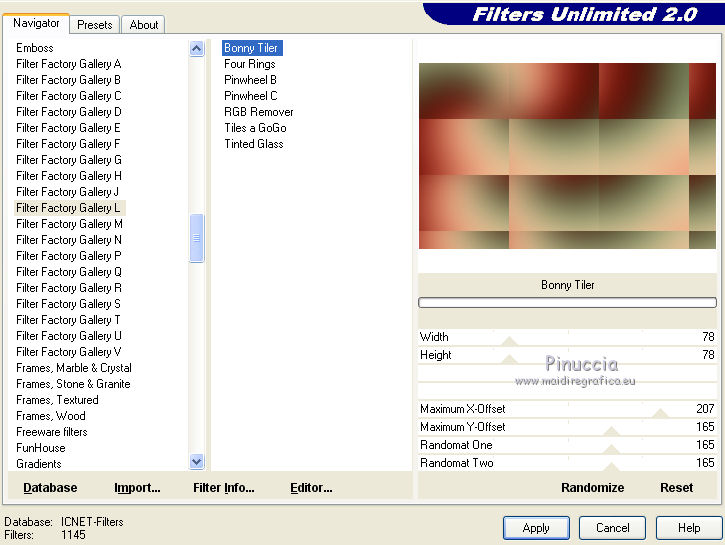 3. Effetti>Plugins>Filter Factory Gallery L - Bonny Tiler, con i settaggi standard.