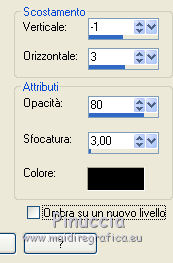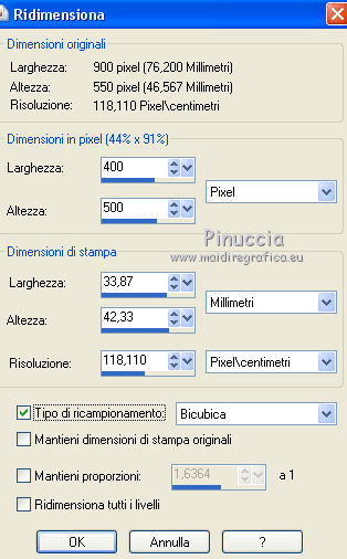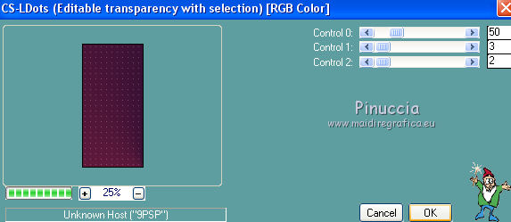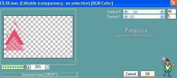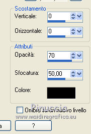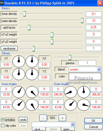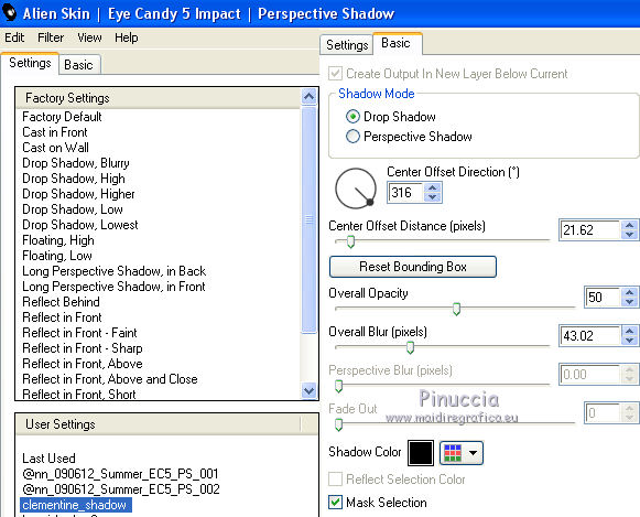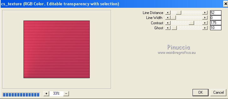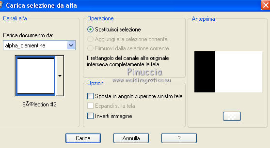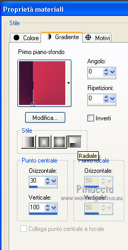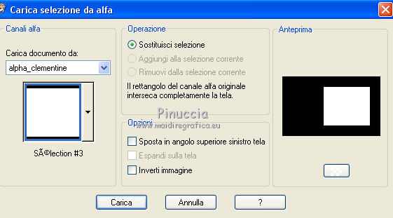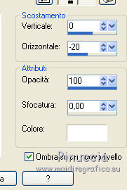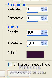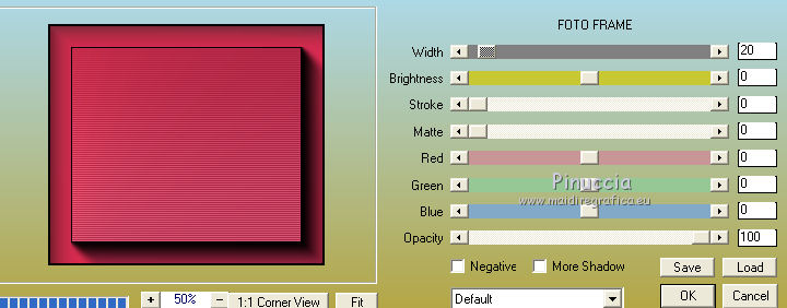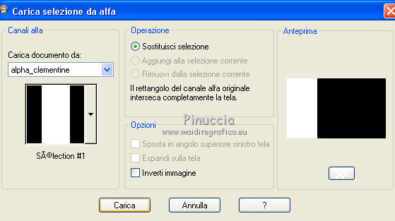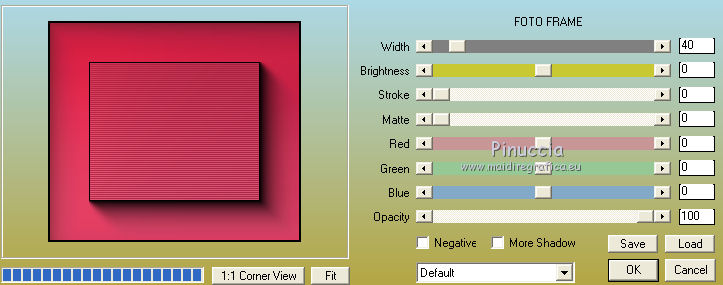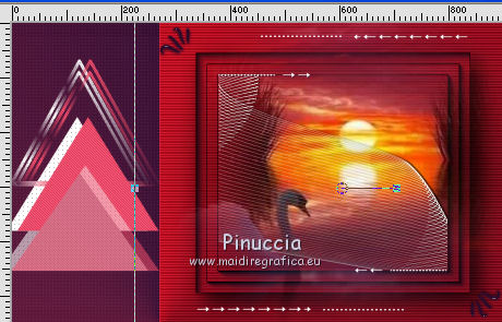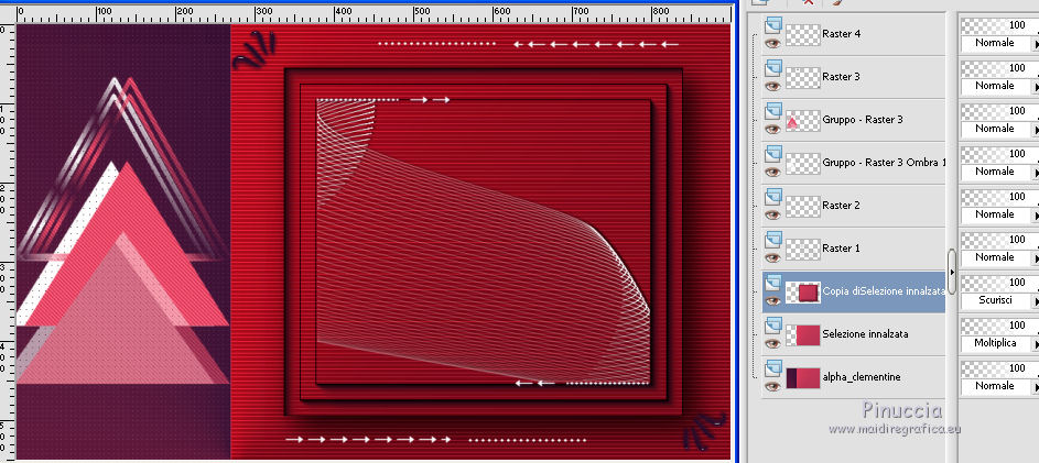 Occorrente: Materiale qui Per la maschera grazie Narah. Il resto del materiale è di Saturnella (in questa pagina trovi i links ai siti dei creatori di tubes) Filtri in caso di dubbi, ricorda di consultare la mia sezione filtri qui Carolaine and Sensibility - CS-LDots, CS-Texture, CS-DLines qui Dragonfly - Sinedot 2 qui AP 01 Innovations - Lines SilverLining qui Alien Skin Eye Candy 5 Impact - Perspective Shadow qui AAA Frames - Foto Frame qui ![]() non esitare a cambiare modalità di miscelatura e opacità secondo i colori utilizzati. Nelle ultime versioni di PSP non c'è il gradiente di primo piano/sfondo (Corel_06_029) Puoi usare i gradienti delle versioni precedenti. Trovi qui i gradienti Corel X. Metti il preset Cliccando sul file una o due volte (a seconda delle tue impostazioni), automaticamente il preset si installerà nella cartella corretta. perchè uno o due clic vedi qui Apri la maschera in PSP e minimizzala con il resto del materiale 1. Imposta il colore di primo piano con il colore #d23351, e il colore di sfondo con #391134. ![]() Passa il colore di primo piano a Gradiente di primo piano/sfondo, stile Radiale. ![]() Apri alpha_clementine. Finestra>Duplica, o sulla tastiera tasto della maiuscola+D per fare una copia. ![]() Chiudi l'originale. La copia, che sarà la base del tuo lavoro, non è vuota, ma contiene le selezioni salvate sul canale alfa. Rinomina il livello Raster 1. Riempi l'immagine trasparente con il gradiente.2. Selezione>Carica/Salva selezione>Carica selezione da canale alfa. La selezione sélection#1 è subito disponibile. Devi soltanto cliccare Carica. ![]() Effetti>Plugins>Carolaine and Sensibility - CS-LDots, con i settaggi standard. ![]() Selezione>Deseleziona. 3. Selezione>Carica/Salva selezione>Carica selezione da canale alfa. Apri il menu delle selezioni e carica sélection#2. ![]() Effetti>Plugins>Carolaine and Sensibility - CS-Texture. ![]() Selezione>Innalza selezione a livello. Selezione>Deseleziona. Cambia la modalità di miscelatura di questo livello in Moltiplica, o altro. 4. Livelli>Duplica. Immagine>Ridimensiona, all'80%, tutti i livelli non selezionato. Effetti>Effetti di immagine>Scostamento. ![]() 5. Selezione>Seleziona tutto. Selezione>Mobile. Selezione>Immobilizza. Effetti>Plugins>AAA Frames - Foto Frame. ![]() 6. Ripeti Effetti>Plugins>AAA Frames - Foto Frame, width 20. ![]() Cambia la modalità di miscelatura di questo livello in Scurisci. Selezione>Deseleziona. 7. Effetti>Plugins>Alien Skin Eye Candy 5 Impact - Perspective Shadow. Seleziona il preset clementine_shadow e ok. ![]() 8. Livelli>Nuovo livello raster. Selezione>Carica/Salva selezione>Carica selezione da canale alfa. Apri il menu delle selezioni e carica sélection#3. ![]() Effetti>Plugins>Dragonfly - Sinedot 2. ![]() Se hai problemi con il filtro, copia/incolla nella selezione il file calque(sinedot), che trovi nel materiale. Selezione>Deseleziona. 9. Effetti>Effetti 3D>Sfalsa ombra, colore di sfondo. ![]() 10. Apri il tube deco1 e vai a Modifica>Copia. Torna al tuo lavoro e vai a Modifica>Incolla come nuovo livello. Tasto K per attivare lo strumento Puntatore ![]() e imposta Posizione X: 378,00 e Posizione Y: 91,00. ![]() Tasto M per deselezionare lo strumento. Effetti>Effetti 3D>Sfalsa ombra, colore di sfondo. ![]() 11. Livelli>Nuovo livello raster. Passa il colore di primo piano a Colore Riempi con il colore chiaro di primo piano.Livelli>Nuovo livello maschera>Da immagine. Apri il menu sotto la finestra d'origine e vedrai la lista dei files aperti. Seleziona la maschera Narah_Mask_1291. ![]() Immagine>Ridimensiona 400 x 500 pixels, mantieni proporzioni e tutti i livelli non selezionato ![]() Livelli>Unisci>Unisci gruppo. 12. Effetti>Effetti di immagine>Scostamento. ![]() 13. Effetti>Plugins>Carolaine and Sensibility - CS-DLines. ![]() 14. Effetti>Effetti 3D>Sfalsa ombra, colore bianco, ombra su nuovo livello selezionato. ![]() 15. Sul livello dell'ombra: Effetti>Plugins>AP 01 Innovations - Lines SilverLining. ![]() Attiva il livello superiore. 16. Apri il tube deco 2 e vai a Modifica>Copia. Torna al tuo lavoro e vai a Modifica>Incolla come nuovo livello. Tasto K per attivare lo strumento Puntatore ![]() e imposta Posizione X: 266,00 e Posizione Y: 5,00. ![]() Tasto M per deselezionare lo strumento. 17. Effetti>Effetti 3D>Sfalsa ombra, colore di sfondo. ![]() 18. Apri il tube deco3 e vai a Modifica>Copia. Torna al tuo lavoro e vai a Modifica>Incolla come nuovo livello. Tasto K per attivare lo strumento Puntatore ![]() e imposta Posizione X: 339,00 e Posizione Y: 21,00. ![]() Tasto M per deselezionare lo strumento. 19. Attiva il livello Copia di selezione innalzata. ![]() Apri il tube del paesaggio e vai a Modifica>Copia. Torna al tuo lavoro e vai a Modifica>Incolla come nuovo livello. Posiziona correttamente il tube sul riquadro a destra![]() Selezione>Carica/Salva selezione>Carica selezione da canale alfa. Apri il menu delle selezioni e carica nuovamente sélection#3. ![]() Selezione>Inverti. Premi sulla tastiera il tasto CANC. Selezione>Deseleziona. 20. Immagine>Aggiungi bordatura, 1 pixel, simmetriche, colore di sfondo. Immagine>Aggiungi bordatura, 2 pixels, simmetriche, colore di primo piano. Immagine>Aggiungi bordatura, 1 pixels, simmetriche, colore di sfondo. Immagine>Aggiungi bordatura, 10 pixels, simmetriche, colore bianco. Immagine>Aggiungi bordatura, 1 pixel, simmetriche, colore di sfondo. Immagine>Aggiungi bordatura, 2 pixels, simmetriche, colore di primo piano. Immagine>Aggiungi bordatura, 1 pixels, simmetriche, colore di sfondo. Immagine>Aggiungi bordatura, 20 pixels, simmetriche, colore bianco. Immagine>Aggiungi bordatura, 1 pixel, simmetriche, colore di sfondo. Immagine>Aggiungi bordatura, 2 pixels, simmetriche, colore di primo piano. Immagine>Aggiungi bordatura, 1 pixels, simmetriche, colore di sfondo. Immagine>Aggiungi bordatura, 40 pixels, simmetriche, colore bianco. Immagine>Aggiungi bordatura, 1 pixel, simmetriche, colore di sfondo. Immagine>Aggiungi b