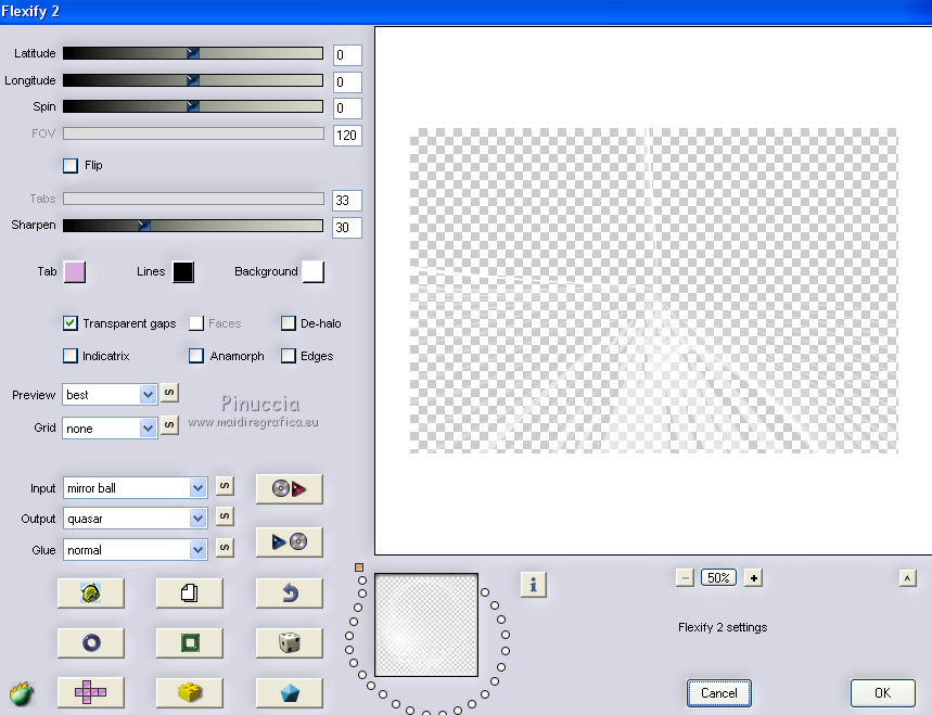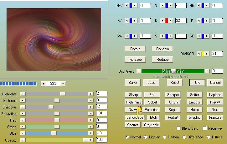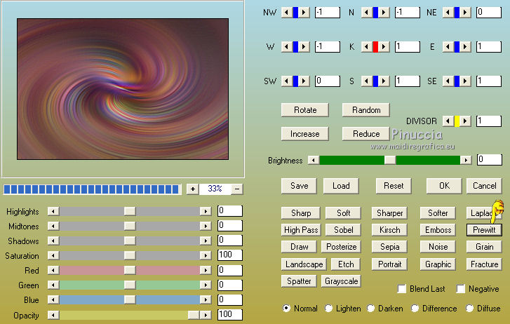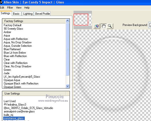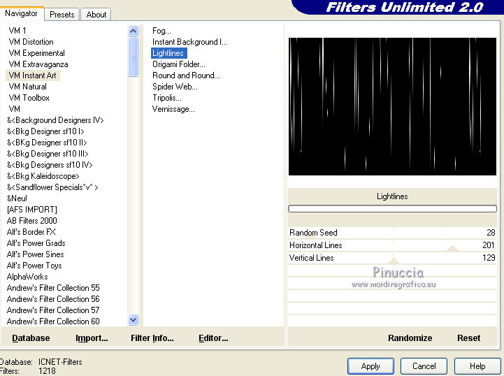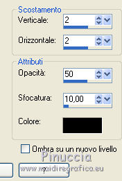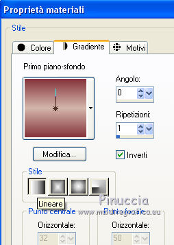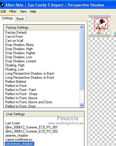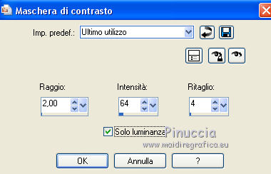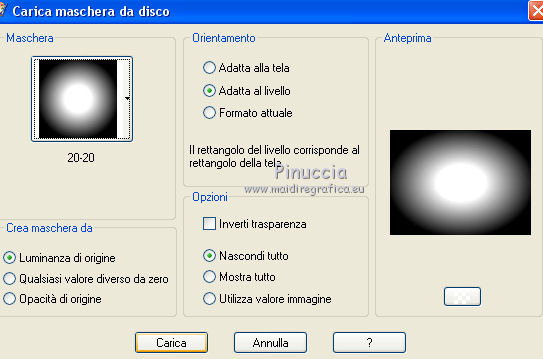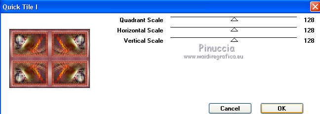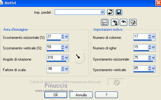 Occorrente: Materiale qui Grazie per Adita per la maschera. Il resto del materiale è di Saturnella. (in questa pagina trovi i links ai siti dei creatori di tubes) Filtri in caso di dubbi, ricorda di consultare la mia sezione filtri qui Filters Unlimited 2.0 qui VM Instant Art - Lightlines qui Transparency - Eliminate Black qui Flaming Pear - Flexify 2 qui Graphics Plus - Quick Tile I qui Alien Skin Eye Candy 5 Impact - Glass, Perspective Shadow qui AAA Filters - Custom qui I filtri Graphics Plus si possono usare da soli o importati in Filters Unlimited (come fare vedi qui) Se un filtro fornito appare con questa icona ![]() non esitare a cambiare modalità di miscelatura e opacità secondo i colori utilizzati. Nelle ultime versioni di PSP non c'è il gradiente di primo piano/sfondo (Corel_06_029) Puoi usare i gradienti delle versioni precedenti. Trovi qui i gradienti Corel X. Metti i preset Cliccando sul file una o due volte (a seconda delle tue impostazioni), automaticamente il preset si installerà nella cartella corretta. perchè uno o due clic vedi qui Metti la maschera 20-20 nella cartella Maschere. Apri la maschera di Adita in PSP e minimizzala con il resto del materiale Imposta il colore di primo piano con il colore chiaro #d4b6ab, e il colore di sfondo con il colore scuro #85343b. ![]() 1. Apri alpha_croisade. Finestra>Duplica, o sulla tastiera tasto della maiuscola+D per fare una copia. ![]() Chiudi l'originale. La copia, che sarà la base del tuo lavoro, non è vuota, ma contiene le selezioni salvate sul canale alfa. Rinomina il livello Raster 1. 2. Selezione>Seleziona tutto. Apri l'immagine image1 e vai a Modifica>Copia. Torna al tuo lavoro e vai a Modifica>Incolla nella selezione. Selezione>Deseleziona. 3. Effetti>Effetti di immagine>Motivo unico. ![]() 4. Regola>Sfocatura>Sfocatura radiale. ![]() Effetti>Effetti di bordo>Aumenta di più. 5. Effetti>Plugins>AAA Filters - Custom - clicca su Prewitt e ok ![]() 6. Effetti>Plugins>AAA Filters - Custom - clicca su Landscape e ok ![]() 7- Livelli>Duplica. Effetti>Plugins>Filters Unlimited 2.0 - VM Instant Art - Lightlines. ![]() 8. Effetti>Plugins>Transparence - Eliminate Black. Cambia la modalità di miscelatura di questo livello in Sovrapponi. 9. Effetti>Effetti 3D>Sfalsa ombra ![]() 10. Apri l'immagine image2. Livelli>Innalza livello di sfondo. Livelli>Carica/Salva maschera>Carica maschera da disco. Cerca e carica la maschera 20-20. ![]() Livelli>Unisci>Unisci gruppo. Modifica>Copia. Torna al tuo lavoro e vai a Modifica>Incolla come nuovo livello. Immagine>Rifletti. Immagine>Capovolgi. Tasto K per attivare lo strumento Puntatore ![]() e imposta Posizione X: -139,00 e posizione Y: -54,00 ![]() Tasto M per deselezionare lo strumento. 11. Selezione>Carica/Salva selezione>Carica selezione da canale alfa La selezione sélection 1 è subito disponibile. Devi soltanto cliccare Carica. ![]() Livelli>Nuovo livello raster. Apri il tube del paesaggio e vai a Modifica>Copia. Torna al tuo lavoro e vai a Modifica>Incolla nella selezione. 12. Livelli>Nuovo livello raster. Effetti>Plugins>Alien Skin Eye Candy 5 Impact - Glass seleziona il preset constance_glass e ok ![]() Selezione>Deseleziona. Livelli>Unisci>Unisci giù - 2 volte. 13. Effetti>Plugins>Alien Skin Eye Candy 5 Impact - Perspective Shadow. Seleziona il preset Drop Shadow Blurry e ok. ![]() 14. Attiva il livello di sfondo. Imposta il colore di primo piano con il colore bianco. Livelli>Nuovo livello raster. Riempi il livello con il colore di primo piano.Livelli>Nuovo livello maschera>Da immagine. Apri il menu sotto la finestra di origine e vedrai la lista dei files aperti. Seleziona la maschera adita_mask_02. ![]() Effetti>Effetti di bordo>Aumenta. Livelli>Unisci>Unisci gruppo. Cambia la modalità di miscelatura di questo livello in Sovrapponi. 15. Effetti>Plugins>Flaming Pear - Flexify 2 ![]() 16. Effetti>Effetti 3D>Sfalsa ombra, con i settaggi precedenti. ![]() 17. Apri élément 1 e vai a Modifica>Copia. Torna al tuo lavoro e vai a Modifica>Incolla come nuovo livello. Tasto K per attivare lo strumento Puntatore ![]() e imposta Posizione X: 210,00 e posizione Y: -2,00 ![]() Tasto M per deselezionare lo strumento. 18. Imposta nuovamente il colore di primo piano con il colore iniziale #d4b6ab. ![]() Passa il colore di primo piano a Gradiente di primo piano/sfondo, stile Lineare. ![]() Immagine>Aggiungi bordatura, 1 pixel, simmetriche, colore di sfondo. Immagine>Aggiungi bordatura, 3 pixels, simmetriche, colore di primo piano. Immagine>Aggiungi bordatura, 1 pixel, simmetriche, colore di sfondo. Selezione>Seleziona tutto. Immagine>Aggiungi bordatura, 15 pixels, simmetriche, colore bianco. Selezione>Inverti. Effetti>Effetti di riflesso>Motivi. ![]() Selezione>Deseleziona. 19. Immagine>Aggiungi bordatura, 5 pixels, simmetriche, colore bianco. Immagine>Aggiungi bordatura, 2 pixels, simmetriche, colore di sfondo. Selezione>Seleziona tutto. Immagine>Aggiungi bordatura, 30 pixels, simmetriche, colore bianco. Selezione>Inverti. Effetti>Effetti di riflesso>Motivi, con i settaggi precedenti. ![]() Selezione>Deseleziona. 20. Immagine>Aggiungi bordatura, 5 pixels, simmetriche, bianco. Immagine>Aggiungi bordatura, 2 pixels, simmetriche, colore di sfondo. Selezione>Seleziona tutto. Immagine>Aggiungi bordatura, 50 pixels, simmetriche, colore bianco. Selezione>Inverti. Riempi la selezione con il gradiente.Effetti>Effetti di trama>Veneziana. ![]() Effetti>Plugins>Graphics Plus - Quick Tile I, con i settaggi standard. ![]() 21. Selezione>Inverti. Efetti>Effetti 3D>Sfalsa ombra. ![]() Modifica>Ripeti Sfalsa ombra. Selezione>Deseleziona. 22. Apri il tube della donna e vai a Modifica>Copia. Torna al tuo lavoro e vai a Modifica>Incolla come nuovo livello. Posiziona correttamente il tube.Effetti>Plugins>Alien Skin Eye Candy 5 Impact - Perspective Shadow seleziona il preset constance_shadow e ok ![]() 23. Apri il tube titre e vai a Modifica>Copia. Torna al tuo lavoro e vai a Modifica>Incolla come nuovo livel