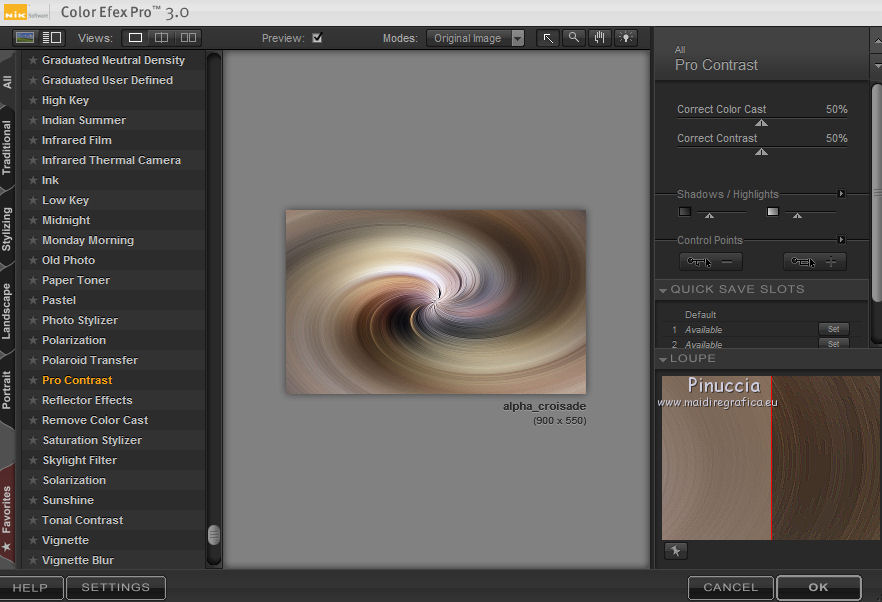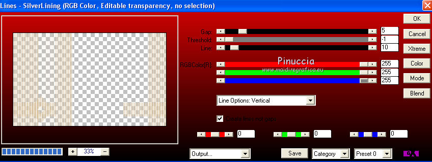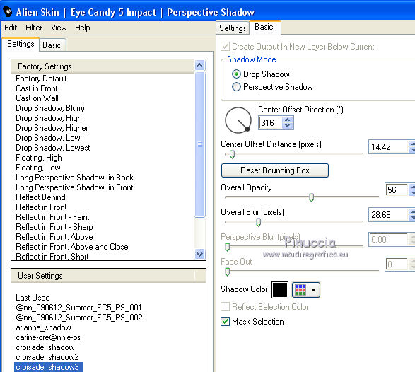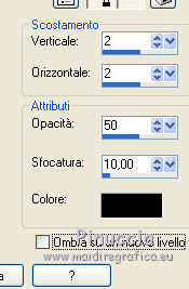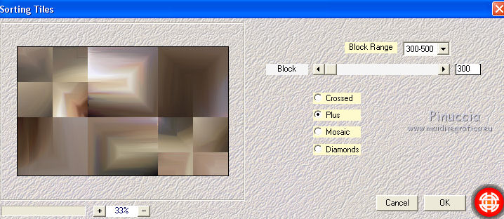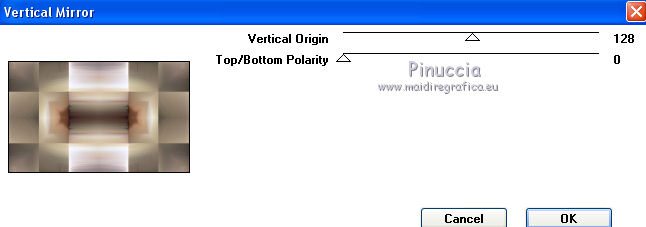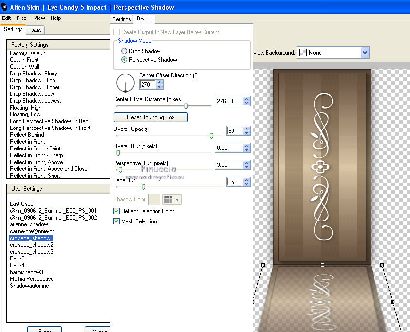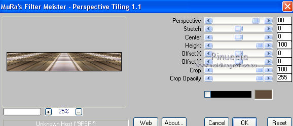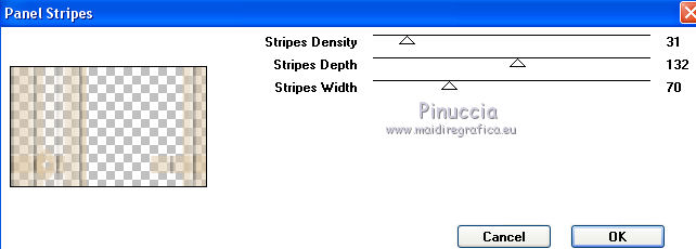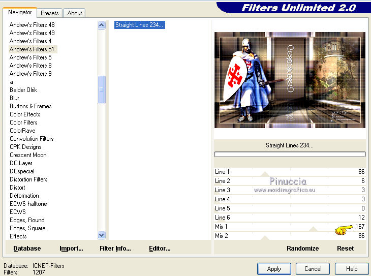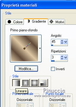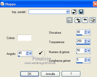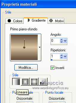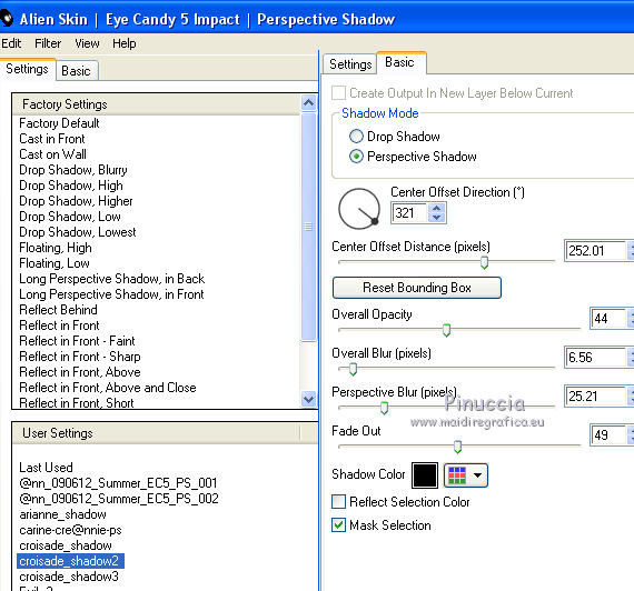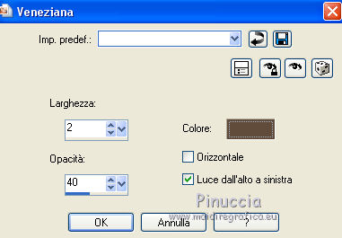 Occorrente: Materiale qui Grazie per i tubes Silvie e Thafs, per la maschera Adita. Il resto del materiale è di Saturnella. (in questa pagina trovi i links ai siti dei creatori di tubes) Filtri in caso di dubbi, ricorda di consultare la mia sezione filtri qui Filters Unlimited 2.0 qui Mehdi - Sorting Tiles qui Mura's Meister - Perspective Tiling qui Nik Software - Color Efex qui AP 01 [Innovations] - Lines SilverLining qui Andrew's Filter 51 - Straight lines 234 qui Graphics Plus - Cross Shadow, Vertical Mirror, Panel stripes qui Alien Skin Eye Candy 5 Impact - Perspective Shadow qui AAA Frames - Foto Frame qui I filtri Graphics Plus e Andrew's si possono usare da soli o importati in Filters Unlimited (come fare vedi qui) Se un filtro fornito appare con questa icona ![]() non esitare a cambiare modalità di miscelatura e opacità secondo i colori utilizzati. Nelle ultime versioni di PSP non c'è il gradiente di primo piano/sfondo (Corel_06_029) Puoi usare i gradienti delle versioni precedenti. Trovi qui i gradienti Corel X. Metti i preset Cliccando sul file una o due volte (a seconda delle tue impostazioni), automaticamente il preset si installerà nella cartella corretta. perchè uno o due clic vedi qui Apri la maschera in PSP e minimizzala con il resto del materiale Imposta il colore di primo piano con il colore chiaro #dcc6a3, e il colore di sfondo con il colore scuro #614b3a. ![]() Passa il colore di primo piano a Gradiente di primo piano/sfondo, stile Lineare. ![]() 1. Apri alpha_croisade. Finestra>Duplica, o sulla tastiera tasto della maiuscola+D per fare una copia. ![]() Chiudi l'originale. La copia, che sarà la base del tuo lavoro, non è vuota, ma contiene le selezioni salvate sul canale alfa. Rinomina il livello Raster 1. Riempi l'immagine trasparente con il gradiente.2. Livelli>Nuovo livello raster. Selezione>Seleziona tutto. Apri il tube sat_croisade01 e vai a Modifica>Copia. Torna al tuo lavoro e vai a Modifica>Incolla nella selezione. Selezione>Deseleziona. 3. Effetti>Effetti di immagine>Motivo unico, con i settaggi standard. ![]() Livelli>Unisci>Unisci giù. 4. Regola>Sfocatura>Sfocatura radiale. ![]() Effetti>Effetti di bordo>Aumenta di più. 5. Effetti>Plugins>Nik Solftware - Color Efex Pro - Pro Contrast ![]() 6. Effetti>Plugins>Mehdi - Sorting Tiles. ![]() Effetti>Effetti di bordo>Aumenta. 7. Effetti>Effetti di riflesso>Specchio rotante. ![]() 8. Effetti>Plugins>Graphics Plus - Vertical Mirror. ![]() 9. Passa il colore di primo piano a Colore. Livelli>Nuovo livello raster. Riempi il livello con il colore di primo piano.Livelli>Nuovo livello maschera>Da immagine. Apri il menu sotto la finestra di origine e vedrai la lista dei files aperti. Seleziona la maschera aditacreations_mask_49. ![]() Livelli>Unisci>Unisci gruppo. 10. Effetti>Plugins>AP 01 [Innovations] - Lines SilverLining. ![]() 11. Effetti>Plugins>Graphics Plus - Panel Stripes, con i settaggi standard. ![]() 12. Effetti>Effetti di riflesso>Specchio rotante, con i settaggi precedenti. ![]() Cambia la modalità di miscelatura di questo livello in Moltiplica. Livelli>Unisci>Unisci giù. 13. Passa il colore di primo piano a Gradiente e cambia i settaggi ![]() Livelli>Nuovo livello raster. Selezione>Carica/Salva selezione>Carica selezione da canale alfa. La selezione sélection#1 è subito disponibile. Devi soltanto cliccare Carica. ![]() Riempi la selezione con il gradiente.Effetti>Effetti di trama>Veneziana, colore di sfondo. ![]() 14. Effetti>Plugins>AAA Frames - Foto Frame. ![]() Selezione>Deseleziona. 15. Apri il tube deco01 e vai a Modifica>Copia. Torna al tuo lavoro e vai a Modifica>Incolla come nuovo livello. Non spostarlo. E' già ben posizionato al centro dell'immagine. 16. Effetti>Effetti 3D>Sfalsa ombra, colore nero. ![]() Livelli>Unisci>Unisci giù. Effetti>Effetti 3D>Sfalsa ombra, colore nero. ![]() 17. Attiva il livello di sfondo. Selezione>Carica/Salva selezione>Carica selezione da canale alfa. Apri il menu delle selezioni e carica sélection#2 . ![]() Selezione>Innalza selezione a livello. Mantieni selezionato. Effetti>Plugins>Mura's Meister - Perspective Tiling, con i settaggi standard. ![]() Selezione>Deseleziona. Effetti>Effetti 3D>Sfalsa ombra, con i settaggi precedenti. 18. Attiva nuovamente il livello di sfondo. Apri il tube di Silvie e vai a Modifica>Copia. Torna al tuo lavoro e vai a Modifica>Incolla come nuovo livello. Immagine>Ridimensiona, all'80%, tutti i livelli non selezionato. Spostalo in alto a destra.Io ho abbassato l'opacità di questo livello al 60%. 19. Attiva il livello superiore (il livello con il deco). Immagine>Ridimensiona, al 100% x 73%, mantieni proporzioni e tutti i livelli non selezionati. ![]() 20. Effetti>Plugins>Alien Skin Eye Candy 5 Impact - Perspective Shadow. Seleziona il preset croisade_shadow e ok. ![]() 21. Apri il tube del cavaliere di Thafs e vai a Modifica>Copia. Torna al tuo lavoro e vai a Modifica>Incolla come nuovo livello. Immagine>Rifletti. Immagine>Ridimensiona, al 75%, tutti i livelli non selezionato (non dimenticare di selezionare Mantieni proporzioni) Sposta il tube a sinistra.Effetti>Plugins>Alien Skin Eye Candy 5 Impact - Perspective Shadow. Seleziona il preset croisade_shadow2 e ok. ![]() Di nuovo Effetti>Plugins>Alien Skin Eye Candy 5 Impact - Perspective Shadow. Seleziona il preset croisade_shadow3 e ok. ![]() 22. Attiva il livello di sfondo. Modifica>Copia. Immagine>Aggiungi bordatura, 1 pixel, simmetriche, colore di sfondo. Immagine>Aggiungi bordatura, 3 pixels, simmetriche, colore di primo piano. Immagine>Aggiungi bordatura, 1 pixel, simmetriche, colore di sfondo. Selezione>Seleziona tutto. Immagine>Aggiungi bordatura, 30 pixels, simmetriche, colore bianco. Selezione>Inverti. Modifica>Incolla nella selezione. Effetti>Plugins>Filters Unlimited 2.0 - Andrew's Filters 51 - Straight lines 234. ![]() Selezione>Deseleziona. 23. Immagine>Aggiungi bordatura, 1 pixel, simmetriche, colore di sfondo. Immagine>Aggiungi bordatura, 3 pixels, simmetriche