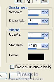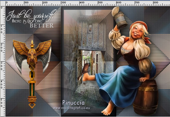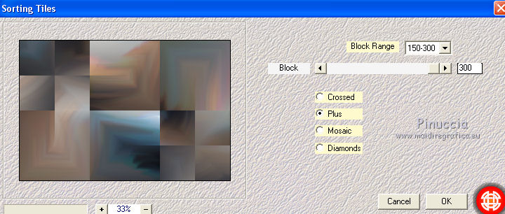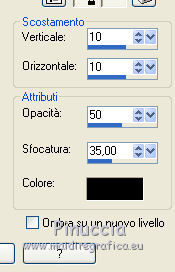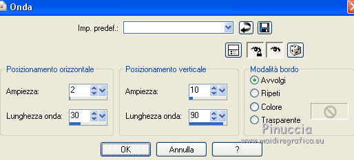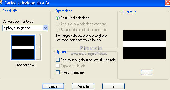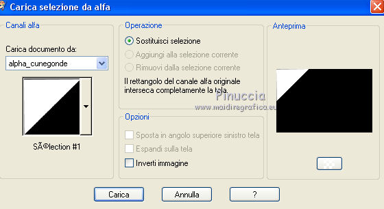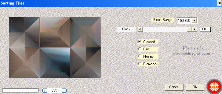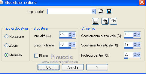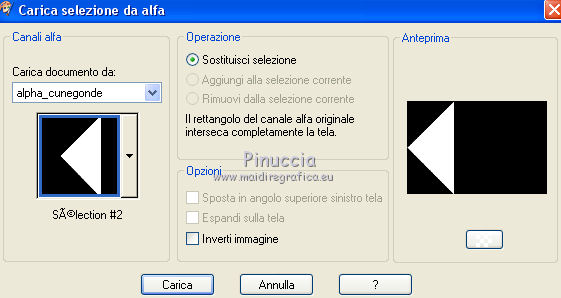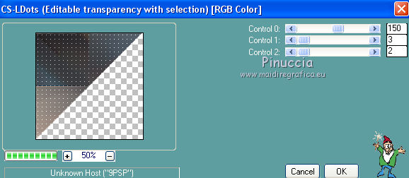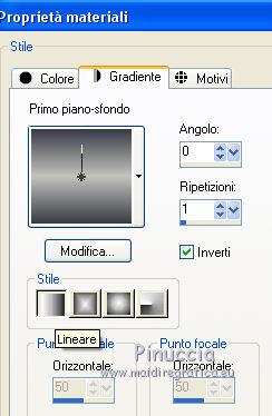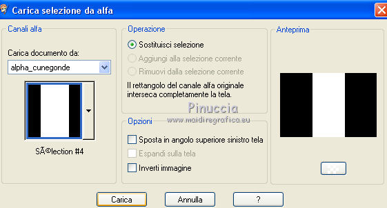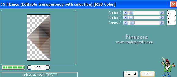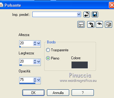 Occorrente: Materiale qui Tutto il materiale è di Saturnella. (in questa pagina trovi i links ai siti dei creatori di tubes) Filtri in caso di dubbi, ricorda di consultare la mia sezione filtri qui Mehdi - Sorting Tile qui Carolaine and Sensibility - CS-LDots, CS-HLines qui Alien Skin Eye Candy 5 Impact - Perspective Shadow qui ![]() non esitare a cambiare modalità di miscelatura e opacità secondo i colori utilizzati. Nelle ultime versioni di PSP non c'è il gradiente di primo piano/sfondo (Corel_06_029) Puoi usare i gradienti delle versioni precedenti. Trovi qui i gradienti Corel X. Metti il preset Cliccando sul file una o due volte (a seconda delle tue impostazioni), automaticamente il preset si installerà nella cartella corretta. perchè uno o due clic vedi qui Apri le maschere in PSP e minimizzale con il resto del materiale. 1. Imposta il colore di primo piano con il colore chiaro #c3c2bf, e il colore di sfondo con il colore scuro #393c45. ![]() Passa il colore di primo piano a Gradiente di primo piano/sfondo, stile Lineare. ![]() 2. Apri alpha_cunegonde. Finestra>Duplica, o sulla tastiera tasto della maiuscola+D per fare una copia. ![]() Chiudi l'originale. La copia, che sarà la base del tuo lavoro, non è vuota, ma contiene le selezioni salvate sul canale alfa. Rinomina il livello Raster 1. Riempi l'immagine trasparente con il gradiente.3. Livelli>Nuovo livello raster. Selezione>Seleziona tutto. Apri il tube della donna e vai a Modifica>Copia. Torna al tuo lavoro e vai a Modifica>Incolla nella selezione. Selezione>Deseleziona. 4. Effetti>Effetti di immagine>Motivo unico, con i settaggi standard. ![]() 5. Regola>Sfocatura>Sfocatura radiale. ![]() Effetti>Effetti di bordo>Aumenta di più. Livelli>Unisci>Unisci giù. 6. Effetti>Plugins>Mehdi - Sorting Tiles. ![]() 7. Ripeti Effetti>Plugins>Mehdi - Sorting Tile - Crossed selezionato. ![]() Effetti>Effetti di bordo>Aumenta. 8. Selezione>Carica/Salva selezione>Carica selezione da canale alfa. La selezione #1 è subito disponibile. Devi soltanto cliccare Carica. ![]() Selezione>Innalza selezione a livello. 9. Effetti>Plugins>Carolaine and Sensibility - CS-LDots ![]() Selezione>Deseleziona. 10. Livelli>Duplica. Immagine>Rifletti. Livelli>Unisci>Unisci giù. 11. Livelli>Duplica. Immagine>Capovolgi. Livelli>Unisci>Unisci giù. 12. Effetti>Effetti 3D>Sfalsa ombra ![]() 13. Attiva il livello di sfondo. Selezione>Carica/Salva selezione>Carica selezione da canale alfa. Apri il menu delle selezioni e carica la selezione #2. ![]() Selezione>Innalza selezione a livello. 14. Effetti>Plugins>Carolaine and Sensibility - CS-HLines - 2 volte con i seguenti settaggi. ![]() Selezione>Deseleziona. 15. Livelli>Duplica. Immagine>Rifletti. Livelli>Unisci>Unisci giù. 16. Effetti>Effetti 3D>Sfalsa ombra, con i settaggi precedenti. Cambia la modalità di miscelatura di questo livello in Luce netta. 17. Livelli>Nuovo livello raster. Selezione>Carica/Salva selezione>Carica selezione da canale alfa. Apri il menu delle selezioni e carica la selezione #3. ![]() Riempi la selezione con il gradiente.18. Effetti>Effetti artistici>Mezzitoni. ![]() Selezione>Deseleziona. 19. Effetti>Effetti di distorsione>Onda. ![]() 20. Effetti>Effetti di distorsione>Stringi. ![]() Cambia la modalità di miscelatura di questo livello in Moltiplica, e abbassa l'opacità al 36%. Oggetti>Allinea>Inferiore o attiva lo strumento Puntatore ![]() lascia Posizione X a 0,00 e imposta Posizione Y: 439,00. ![]() 21. Attiva il livello di sfondo. Selezione>Carica/Salva selezione>Carica selezione da canale alfa. Apri il menu delle selezioni e carica la selezione #4. ![]() Selezione>Innalza selezione a livello. Apri il tube del paesaggio e vai a Modifica>Copia. Torna al tuo lavoro e vai a Modifica>Incolla nella selezione. 22. Effetti>Effetti 3D>Pulsante, colore scuro. ![]() Selezione>Deseleziona. 23. Effetti>Effetti 3D>Sfalsa ombra. ![]() Ripeti l'Effetto Sfalsa ombra, orizzontale -5. ![]() 24. Attiva il livello superiore. Attiva nuovamente il tube della donna e vai a Modifica>Copia. Torna al tuo lavoro e vai a Modifica>Incolla come nuovo livello. Immagine>Ridimensiona, al 78%, tutti i livelli non selezionato. Regola>Messa a fuoco>Metti a fuoco. Sposta il tube a destra.25. Effetti>Plugins>Alien Skin Eye Candy 5 Impact - Perspective Shadow. Seleziona il preset cunegonde_shadow e ok. ![]() 26. Apri il wordart e vai a Modifica>Copia. Torna al tuo lavoro e vai a Modifica>Incolla come nuovo livello. Immagine>Ridimensiona, al 50%, tutti i livelli non selezionato. Immagine>Immagine negativa. Spostalo in alto a sinistra.Effetti>Effetti 3D>Sfalsa ombra. ![]() 27. Apri il tube sat_tot01 e vai a Modifica>Copia. Torna al tuo lavoro e vai a Modifica>Incolla come nuovo livello. Immagine>Ridimensiona, al 50%, tutti i livelli non selezionato. Regola>Messa a fuoco>Metti a fuoco. Spostalo sotto il wordart![]() Effetti>Plugins>Alien Skin Eye Candy 5 Impact - Perspective Shadow, con i settaggi precedenti. 28. Immagine>Aggiungi bordatura, 1 pixel, simmetriche, colore di sfondo. Immagine>Aggiungi bordatura, 3 pixels, simmetriche, colore di primo piano. Immagine>Aggiungi bordatura, 1 pixel, simmetriche, colore di sfondo. Immagine>Aggiungi bordatura, 25 pixels, simmetriche, colore bianco. Immagine>Aggiungi bordatura, 2 pixels, simmetriche, colore di sfondo. 29. Selezione>Seleziona tutto. Immagine>Aggiungi bordatura, 50 pixels, simmetriche, colore bianco. Effetti>Effetti 3D>Sfalsa ombra. ![]() Selezione>Deseleziona. 30. Apri il tube coin e vai a Modifica>Copia. Torna al tuo lavoro e vai a Modifica>Incolla come nuovo livello. Non spostarlo. Firma il tuo lavoro su un nuovo livello. Immagine>Aggiungi bordatura, 1 pixel, simmetriche, colore di sfondo. Immagine>Ridimensiona, 900 pixels di larghezza, tutti i livelli selezionato. Regola>Messa a fuoco>Maschera di contrasto. ![]() Salva in formato jpg. ![]() Le vostre versioni Grazie ![]() Olimpia ![]() Puoi scrivermi per qualsiasi problema, o dubbio, se trovi un link che non fun