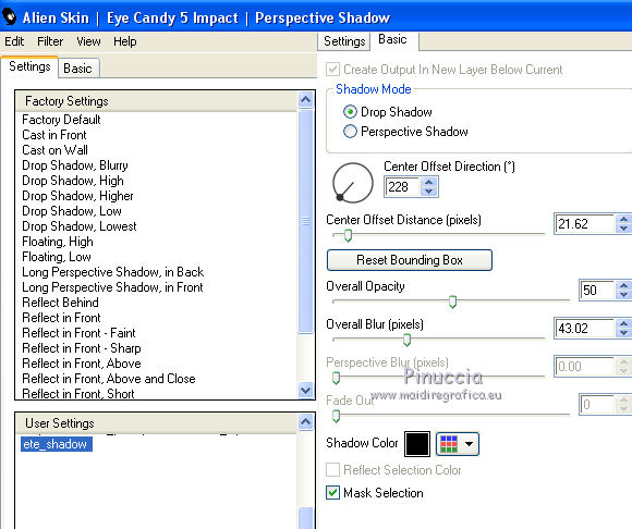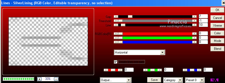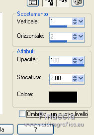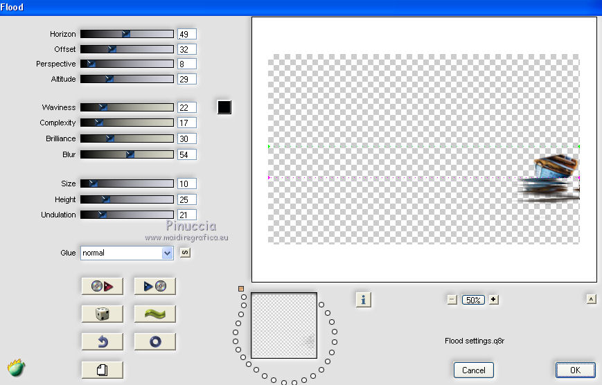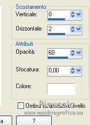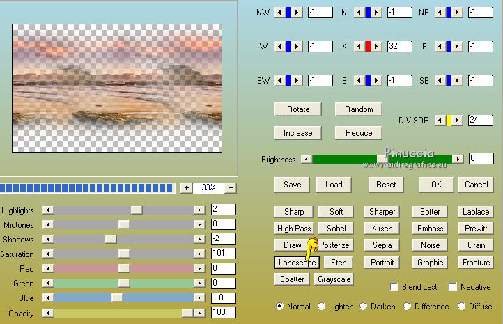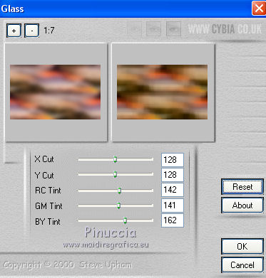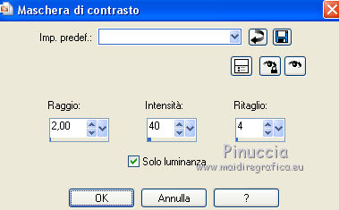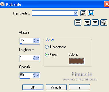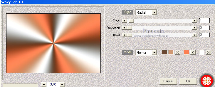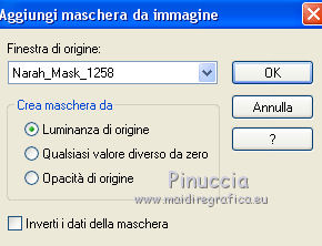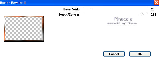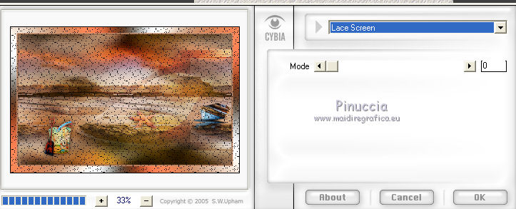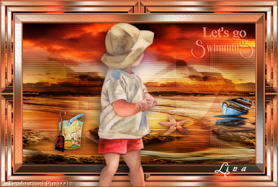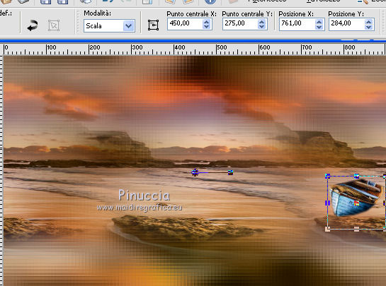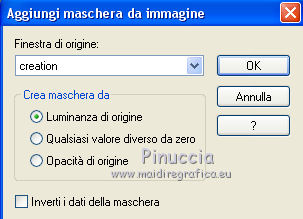 Occorrente: Materiale qui Grazie: per il wordart Yoka, per le maschere Tine e Narah. Il resto del materiale è di Saturnella (in questa pagina trovi i links ai siti dei creatori di tubes) Filtri in caso di dubbi, ricorda di consultare la mia sezione filtri qui Filters Unlimited 2.0 qui Cybia - Screenworks qui Cybia - Mezzy qui Flaming Pear - Flood qui Mehdi - Wavy Lab 1.1 qui Graphics Plus - Button Beveler 2, Quick Tile I qui Alien Skin Eye Candy 5 Impact - Perspective Shadow qui AAA Filters - Custom qui I filtri Cybia e Graphics Plus si possono usare da soli o importati in Filters Unlimited (come fare vedi qui) Se un filtro fornito appare con questa icona ![]() non esitare a cambiare modalità di miscelatura e opacità secondo i colori utilizzati. Metti il preset Cliccando sul file una o due volte (a seconda delle tue impostazioni), automaticamente il preset si installerà nella cartella corretta. perchè uno o due clic vedi qui Apri le maschere in PSP e minimizzale con il resto del materiale 1. Apri una nuova immagine trasparente 900 x 550. Selezione>Seleziona tutto. Apri l'immagine image_fond e vai a Modifica>Copia. Torna al tuo lavoro e vai a Modifica>Incolla nella selezione. Selezione>Deseleziona. 2. Effetti>Effetti di immagine>Motivo unico, con i settaggi standard. ![]() 3. Regola>Sfocatura>Sfocatura gaussiana - raggio 20. ![]() 4. Effetti>Plugins>Cybia - Mezzy ![]() Adatta ai tuoi colori, sperimentando i valori red (RC), green (GM) e blue (BY). Effetti>Effetti di bordo>Aumenta. 5. Livelli>Nuovo livello raster. Selezione>Seleziona tutto. Apri il tube del paesaggio e vai a Modifica>Copia. Torna al tuo lavoro e vai a Modifica>Incolla nella selezione. Selezione>Deseleziona. Livelli>Duplica. Livelli>Unisci>Unisci giù. 6. Effetti>Effetti di immagine>Motivo unico, fianco a fianco. ![]() 7. Effetti>Plugins>AAA Filters - Custom - Landscape. ![]() 8. Apri il tube della barca e vai a Modifica>Copia. Torna al tuo lavoro e vai a Modifica>Incolla come nuovo livello. Immagine>Ridimensiona, al 50%, tutti i livelli non selezionato. Tasto K per attivare lo strumento Puntatore ![]() e imposta Posizione X: 761,00 e Posizione Y: 284,00. ![]() Tasto M per deselezionare lo strumento. 9. Effetti>Plugins>Flaming Pear - Flood. ![]() 10. Apri il tube deco_02 e vai a Modifica>Copia. Torna al tuo lavoro e vai a Modifica>Incolla come nuovo livello. Immagine>Ridimensiona, al 40%, tutti i livelli non selezionato. Regola>Messa a fuoco>Metti a fuoco. 11. Effetti>Effetti 3D>Sfalsa ombra. ![]() 12. Apri il tube deco_1 e vai a Modifica>Copia. Torna al tuo lavoro e vai a Modifica>Incolla come nuovo livello. Immagine>Ridimensiona, 1 volta al 30% e 1 volta al 70%, tutti i livelli non selezionato. Effetti>Effetti 3D>Sfalsa ombra, con i settaggi precedenti. Posiziona i tubes come nel mio esempio.13. Imposta il colore di primo piano con il colore bianco. Livelli>Nuovo livello raster. Riempi il livello con il colore bianco.Livelli>Nuovo livello maschera>Da immagine. Apri il menu sotto la finestra di origine e vedrai la lista dei files aperti. Seleziona la maschera creation_tine. ![]() Livelli>Duplica. Livelli>Unisci>Unisci gruppo. 14. Effetti>Plugins>AP 01 Innovations - Lines SilverLining. ![]() Cambia la modalità di miscelatura di questo livello in Sovrapponi, e abbassa l'opacità al 50%. 15. Livelli>Nuovo livello raster. Riempi il livello con il colore bianco.Livelli>Nuovo livello maschera>Da immagine. Apri il menu sotto la finestra di origine e seleziona la maschera Narah_Mask_1258 ![]() Immagine>Rifletti. Livelli>Unisci>Unisci gruppo. 16. Effetti>Effetti 3D>Sfalsa ombra. ![]() 17. Effetti>Plugins>AP 01 Innovations - Lines SilverLining. ![]() Effetti>Effetti 3D>Sfalsa ombra, con i settaggi precedenti. 18. Imposta il colore di primo piano con #d19772, e il colore di sfondo con #6a4731. ![]() Immagine>Aggiungi bordatura, 2 pixels, simmetriche, colore di sfondo. Immagine>Aggiungi bordatura, 4 pixels, simmetriche, colore di primo piano. Selezione>Seleziona tutto. Immagine>Aggiungi bordatura, 25 pixels, simmetriche, colore bianco. Selezione>Inverti. Effetti>Plugins>Mehdi - Wavy Lab 1.1. Questo filtro lavora con i colori della paletta: il primo è il colore di sfondo, il secondo quello di primo piano; cambia gli altri due colori creati dal filtro: il terzo con il colore #fc7f51 e il quarto con il colore bianco. ![]() 19. Effetti>Plugins>Cybia - Screenworks - Lace Screen ![]() Selezione>Innalza selezione a livello. 20. Effetti>Effetti 3D>Pulsante, colore di sfondo. ![]() 21. Effetti>Plugins>Graphics Plus - Button Beveler 2. ![]() 22. Selezione>Inverti. Effetti>Effetti 3D>Sfalsa ombra. ![]() Selezione>Deseleziona. 23. Immagine>Aggiungi bordatura, 2 pixels, simmetriche, colore di sfondo. Immagine>Aggiungi bordatura, 4 pixels, simmetriche, colore di primo piano. Selezione>Seleziona tutto. Immagine>Aggiungi bordatura, 50 pixels, simmetriche, colore bianco. Selezione>Inverti. Modifica>Incolla nella selezione. 24. Effetti>Plugins>Graphics Plus - Quick Tile I, con i settaggi standard. ![]() 25. Selezione>Inverti. Effetti>Effetti 3D>Sfalsa ombra, con i settaggi precedenti. Selezione>Deseleziona. 26. Apri il tube del bambino e vai a Modifica>Copia. Torna al tuo lavoro e vai a Modifica>Incolla come nuovo livello. Immagine>Rifletti. Posiziona correttamente il tube.Effetti>Plugins>Alien Skin Eye Candy 5 Impact - Perspective Shadow. Seleziona il preset été_shadow e ok. ![]() 27. Apri il wordart di Yoka e vai a Modifica>Copia. Torna al tuo lavoro e vai a Modifica>Incolla come nuovo livello. Immagine>Ridimensiona, al 70%, tutti i livelli non selezionato. Applica sul testo il colore scuro, con lo strumento Sostituzione colore ![]() o nelle versioni più recenti Cambio colore ![]() 28. Effetti>Effetti 3D>Sfalsa ombra, colore bianco. ![]() 29. Firma il tuo lavoro su un nuovo livello. Immagine>Aggiungi bordatura, 1 pixel, simmetriche, colore nero. Immagine>Ridimensiona, 900 pixels di larghezza, tutti i livelli selezionato. Regola>Messa a fuoc