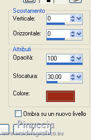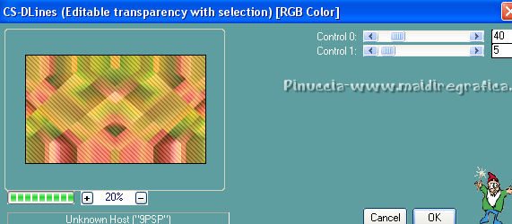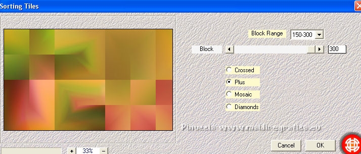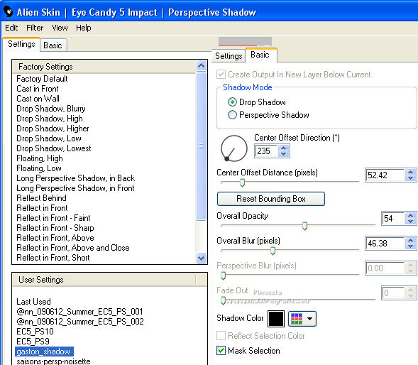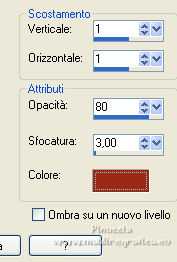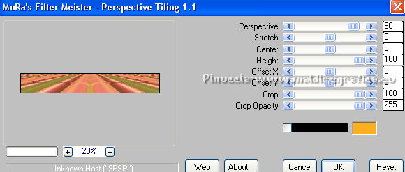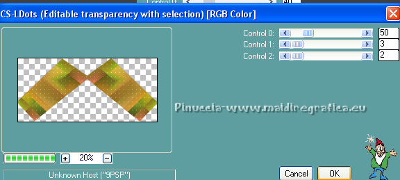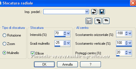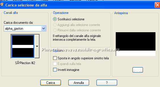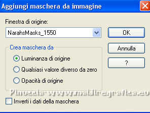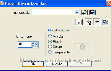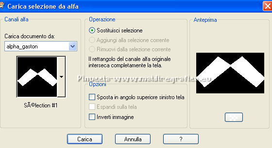 Le vostre versioniOccorrente: Materiale qui Per le maschere grazie Narah. Il resto del materiale è di Saturnella. (in questa pagina trovi i links ai siti dei creatori di tubes) Filtri in caso di dubbi, ricorda di consultare la mia sezione filtri qui Filters Unlimited 2.0 qui Plugin Galaxy - Instant Mirror qui Mehdi - Wavy Lab 1.1. qui Mehdi - Sorting Tiles qui Simple - Diamonds qui Carolaine and Sensibility - CS-LDots, CS-DLines qui Alien Skin Eye Candy 5 Impact - Perspective Shadow qui Mura's Meister - Perspective Tiling qui I filtri Simnple si possono usare da soli o importati in Filters Unlimited (come fare vedi qui) Se un filtro fornito appare con questa icona ![]() non esitare a cambiare modalità di miscelatura e opacità secondo i colori utilizzati. Metti il preset Cliccando sul file una o due volte (a seconda delle tue impostazioni), automaticamente il preset si installerà nella cartella corretta. perchè uno o due clic vedi qui Apri le maschere in PSP e minimizzale con il resto del materiale. Imposta il colore di primo piano con #9d2a17, e il colore di sfondo con #ffae1d. ![]() 1. Apri alpha_gaston. Finestra>Duplica o sulla tastiera maiuscola+D per fare una copia. ![]() Chiudi l'originale. La copia, che sarà la base del tuo lavoro, non è vuota, ma contiene le selezioni salvate sul canale alfa. 2. Effetti>Plugins>Mehdi - Wavy Lab 1.1. Questo filtro crea gradienti con i colori della paletta; il primo è il colore di sfondo, il secondo quello di primo piano. Degli ultimi due colori creati dal filtro cambia il terzo colore con il colore 3 #48a42c, e il quarto colore con il colore 4 #f2937d. ![]() 3. Regola>Sfocatura>Sfocatura radiale. ![]() Effetti>Effetti di bordo>Aumenta di più. 4. Effetti>Plugins>Mehdi - Sorting Tiles. ![]() Effetti>Effetti di bordo>Aumenta. 5. Effetti>Plugins>Simple - Diamonds. 6. Livelli>Duplica. Effetti>Effetti geometrici>Prospettiva orizzontale. ![]() 7. Effetti>Plugins>Plugin Galaxy - Instant Mirror. ![]() 8. Selezione>Carica/Salva selezione>Carica selezione da canale alfa. La selezione #1 è subito disponibile. Devi soltanto cliccare Carica. ![]() Selezione>Innalza selezione a livello. 9. Effetti>Plugins>Carolaine and Sensibility - CS-LDots, con i settaggi standard ![]() 10. Selezione>Inverti. Attiva il livello sottostante, copia di Raster 1. Effetti>Plugins>Carolaine and Sensibility - CS-DLines, con i settaggi standard ![]() Selezione>Deseleziona. 11. Apri il tube sat_rue01 e vai a Modifica>Copia. Torna al tuo lavoro e vai a Modifica>Incolla come nuovo livello. Spostalo a sinistra.12. Apri il tube sat_rue02 e vai a Modifica>Copia. Torna al tuo lavoro e vai a Modifica>Incolla come nuovo livello. Livelli>Duplica. Livelli>Unisci>Unisci giù. Spostalo a destra.13. Livelli>Unisci>Unisci giù (i due paesaggi saranno sullo stesso livello) Regola>Messa a fuoco>Accentua messa a fuoco. Io ho abbassato l'opacità al 45%, a te decidere. 14. Attiva il livello Copia di Raster 1. Livelli>Unisci>Unisci giù. Rimani posizionato su questo livello. 15. Selezione>Carica/Salva selezione>Carica selezione da canale alfa. Apri il menu delle selezioni e carica la selezione #2. ![]() Selezione>Innalza selezione a livello. Effetti>Plugins>Mura's Meister - Perspective Tiling. ![]() Selezione>Deseleziona. 16. Attiva lo strumento Bacchetta magica , sfumatura 40,e clicca nella parte trasparente in alto per selezionarla. ![]() Clicca 4-5 volte sulla tastiera il tasto CANC ![]() Selezione>Deseleziona. Livelli>Disponi>Porta in alto. 17. Livelli>Nuovo livello raster. Imposta il colore di sfondo con il colore bianco. Riempi il livello con il colore bianco.Livelli>Nuovo livello maschera>Da immagine. Apri il menu sotto la finestra d'origine e vedrai la lista dei files aperti. Seleziona la maschera NarahsMask_1550. ![]() Livelli>Duplica. Livelli>Unisci>Unisci gruppo. Immagine>Capovolgi. 18. Tasto K sulla tastiera per attivare lo strumento Puntatore ![]() e imposta Posizione X: -1,00 e Posizione Y: -132,00 ![]() Tasto M per deselezionare lo strumento. Effetti>Effetti 3D>Sfalsa ombra, colore di primo piano #9d2a17. ![]() Cambia la modalità di miscelatura di questo livello in Luminanza (esistente) e abbassa l'opacità al 70%. 19. Livelli>Nuovo livello raster. Riempi il livello con il colore bianco.Livelli>Nuovo livello maschera>Da immagine. Apri il menu sotto la finestra d'origine e seleziona la maschera NarahsMask_1560. ![]() Effetti>Effetti di bordo>Aumenta. Livelli>Unisci>Unisci gruppo. Strumento Puntatore ![]() e imposta Posizione X: -90,00 e Posizione Y: -60,00 ![]() Tasto M per deselezionare lo strumento. 20. Effetti>Effetti 3D>Sfalsa ombra, colore di primo piano, con i settaggi precedenti. ![]() 21. Apri il tube sat_37 e vai a Modifica>Copia. Torna al tuo lavoro e vai a Modifica>Incolla come nuovo livello. Sposta il tube a sinistra.Regola>Messa a fuoco>Metti a fuoco. 22. Effetti>Plugins>Alien Skin Eye Candy 5 Impact - Perspective Shadow. Seleziona il preset gaston_shadow e ok. ![]() 23. Apri il tube sat_38 e vai a Modifica>Copia. Torna al tuo lavoro e vai a Modifica>Incolla come nuovo livello. Immagine>Ridimensiona, all'80%, tutti i livelli non selezionato. Sposta il tube a destra.24. Effetti>Plugins>Alien Skin Eye Candy 5 Impact - Perspective Shadow - preset gaston_shadow. 25. Apri il tube texte e vai a Modifica>Copia. Torna al tuo lavoro e vai a Modifica>Incolla come nuovo livello. Posiziona correttamente il testo.Effetti>Effetti 3D>Sfalsa ombra, con i settaggi precedenti. ![]() 26. Firma il tuo lavoro su un nuovo livello. Livelli>Unisci>Unisci visibile. 27. Modifica>Copia. Apri il tube cadre Attiva lo strumento Bacchetta magica ![]() (non dimenticare di riportare la sfumatura a 0, e clicca nella parte trasparente per selezionarla. Modifica>Incolla nella selezione. 28. Effetti>Effetti 3D>Sfalsa ombra, colore di primo piano #9d2a17. ![]() Selezione>Deseleziona. Livelli>Unisci>Unisci tutto. Immagine>Ridimensiona, 950 pixels di larghezza, tutti i livelli selezionato. Regola>Messa a fuo
