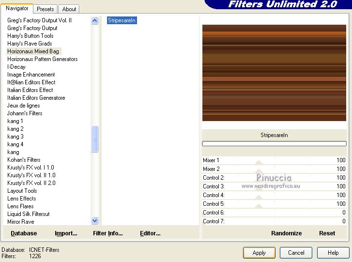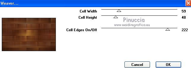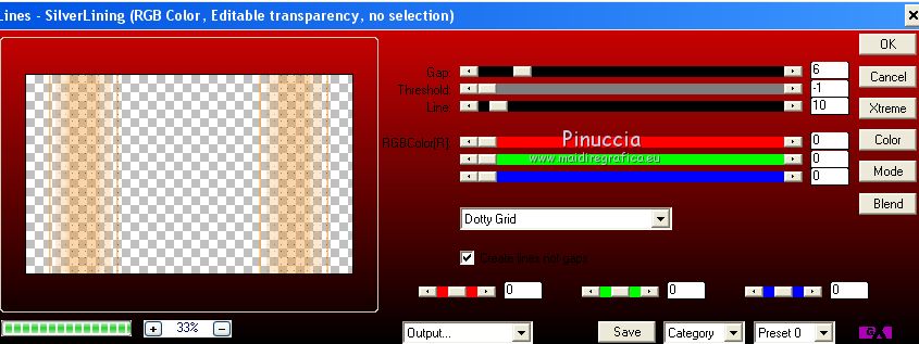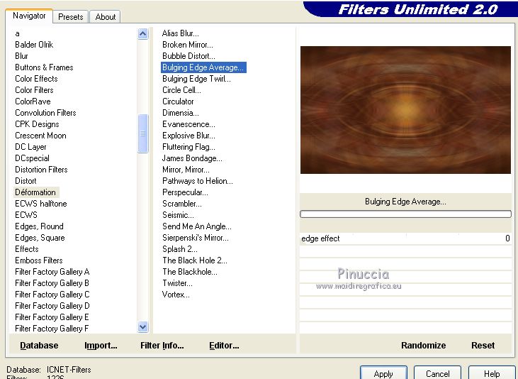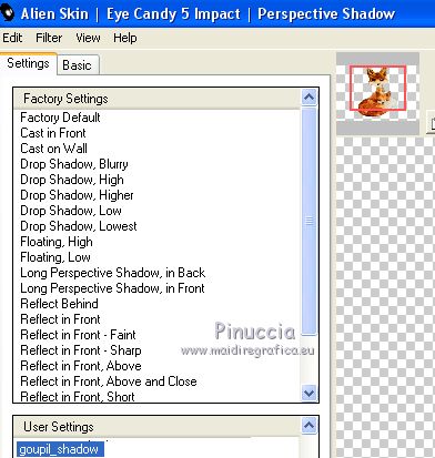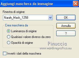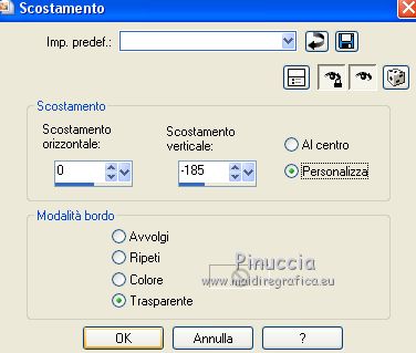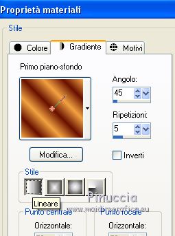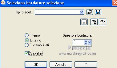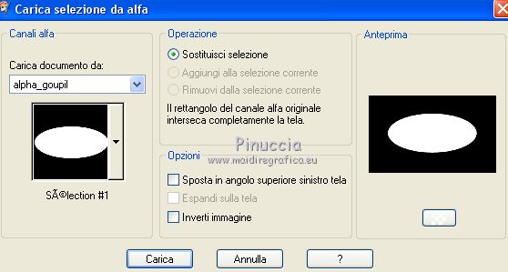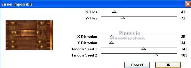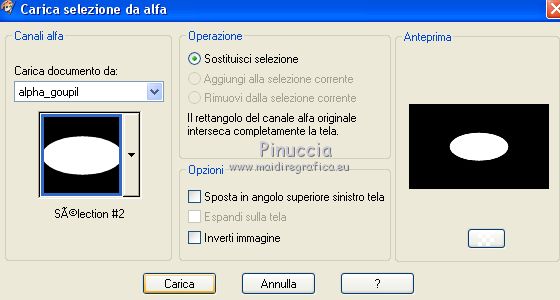 Occorrente: Materiale qui Per le maschere grazie Narah. Il resto del materiale è di Saturnella. (in questa pagina trovi i links ai siti dei creatori di tubes) Filtri in caso di dubbi, ricorda di consultare la mia sezione filtri qui Filters Unlimited 2.0 qui Déformation - Bulging Edge Average qui AP 01 [Innovations] - Lines SilverLining qui Toadies - Weaver qui VM Distortion - Vision impossible qui Alien Skin Eye Candy 5 Impact - Perspective Shadow, Glass qui Horizonaus Mixed - Bag Stripesareln qui I filtri Toadies, Horizonaus, Deformation e VM Distortion si possono usare da soli o importati in Filters Unlimited (come fare vedi qui) Se un filtro fornito appare con questa icona ![]() non esitare a cambiare modalità di miscelatura e opacità secondo i colori utilizzati. Nelle ultime versioni di PSP non c'è il gradiente di primo piano/sfondo (Corel_06_029) Puoi usare i gradienti delle versioni precedenti. Trovi qui i gradienti Corel X. Metti i preset Cliccando sul file una o due volte (a seconda delle tue impostazioni), automaticamente il preset si installerà nella cartella corretta. perchè uno o due clic vedi qui Apri le maschere in PSP e minimizzale con il resto del materiale Imposta il colore di primo piano con #f2a241, e il colore di sfondo con il colore #681001. ![]() 1. Apri alpha_goupil. Finestra>Duplica, o sulla tastiera tasto della maiuscola+D per fare una copia. ![]() Chiudi l'originale. La copia, che sarà la base del tuo lavoro, non è vuota, ma contiene le selezioni salvate sul canale alfa. Rinomina il livello Raster 1. 2. Selezione>Seleziona tutto. Apri l'immagine fond_goupil e vai a Modifica>Copia. Torna al tuo lavoro e vai a Modifica>Incolla come nuovo livello. Selezione>Deseleziona. 3. Regola>Sfocatura>Sfocatura radiale. ![]() Effetti>Effetti di bordo>Aumenta di più. 4. Livelli>Duplica. Effetti>Plugins>Filters Unlimited 2.0 - Déformation - Bulging Edge Average, con i settaggi standard. ![]() 5. Selezione>Carica/Salva selezione>Carica selezione da canale alfa La selezione sélection 1 è subito disponibile. Devi soltanto cliccare Carica. ![]() Selezione>Innalza selezione a livello. 6. Selezione>Modifica>Selezione bordature selezione. ![]() Riempi la selezione con il colore di primo piano.Selezione>Deseleziona. 7. Selezione>Carica/Salva selezione>Carica selezione da canale alfa Apri il menu delle selezioni e carica la selezione #2. ![]() Livelli>Nuovo livello raster. Apri il tube paysage fant_10 e vai a Modifica>Copia. Torna al tuo lavoro e vai a Modifica>Incolla nella selezione. Livelli>Unisci>Unisci giù. Effetti>Plugins>Alien Skin Eye Candy 5 Impact - Glass. Seleziona il preset goupil_glass e ok. ![]() 8. Effetti>Effetti 3D>Sfalsa ombra. ![]() Selezione>Deseleziona. Immagine>Ridimensiona, al 40%, tutti i livelli non selezionato. Chiudi questo livello per il momento. 9. Attiva il livello copia di raster 1. Imposta il colore di sfondo con il colore bianco. Livelli>Nuovo livello raster. Riempi il livello con il colore bianco.Livelli>Nuovo livello maschera>Da immagine. Apri il menu sotto la finestra di origine e vedrai la lista dei files aperti. Seleziona la maschera Narah_Mask_1258 ![]() Effetti>Effetti di bordo>Aumenta. Livelli>Unisci>Unisci gruppo. Livelli>Duplica. Immagine>Rifletti. Livelli>Unisci>Unisci giù. 10. Effetti>Plugins>AP 01 [Innovations] - Lines SilverLining. ![]() Effetti>Effetti 3D>Sfalsa ombra, con i settaggi precedenti. Cambia la modalità di miscelatura di questo livello in Sovrapponi, o altro. 11. Attiva il livello copia di Raster 1. Livelli>Unisci>Unisci giù. Effetti>Plugins>Toadies - Weaver, con i settaggi standard. ![]() Effetti>Effetti di bordo>Aumenta di più. 12. Livelli>Nuovo livello raster. Riempi il livello con il colore di primo piano.Livelli>Nuovo livello maschera>Da immagine. Apri il menu sotto la finestra di origine e seleziona la maschera Narah_Mask_14868 ![]() Livelli>Unisci>Unisci gruppo. 13. Effetti>Plugins>AP 01 [Innovations] - Lines SilverLining, con i settaggi precedenti ![]() 14. Effetti>Effetti 3D>Sfalsa ombra, con i settaggi precedenti. 15. Riapri e attiva il livello chiuso (la forma ovale con il paesaggio). Immagine>Ridimensiona, al 75%, tutti i livelli non selezionato. Regola>Messa a fuoco>Metti a fuoco. 16. Tasto K per attivare lo strumento Puntatore ![]() e imposta Posizione X: 65,00 e Posizione Y: 36,00. ![]() Tasto M per deselezionare lo strumento. 17. Effetti>Effetti 3D>Sfalsa ombra, con i settaggi precedenti. 18. Livelli>Duplica. Effetti>Effetti di immagine>Scostamento. ![]() 19. Livelli>Duplica. Effetti>Effetti di immagine>Scostamento, con i settaggi precedenti. Livelli>Unisci>Unisci giù, 2 volte. 20. Livelli>Duplica. Immagine>Rifletti. 21. Attiva il livello Raster 1. Modifica>Copia. 22. Riporta il colore di sfondo al colore iniziale. ![]() Passa il colore di primo piano a Gradiente di primo piano/sfondo, stile Lineare. ![]() Immagine>Aggiungi bordatura, 1 pixel, simmetriche, colore di sfondo. Immagine>Aggiungi bordatura, 3 pixels, simmetriche, colore di primo piano. Immagine>Aggiungi bordatura, 1 pixel, simmetriche, colore di sfondo. Selezione>Seleziona tutto Immagine>Aggiungi bordatura, 25 pixels, simmetriche, colore bianco. Selezione>Inverti. Riempi la selezione con il gradiente.Effetti>Plugins>Filters Unlimited 2.0 - VM Distortion - Vision impossible, con i settaggi standard. ![]() Effetti>Effetti di riflesso>Specchio rotante. ![]() Selezione>Inverti. Effetti>Effetti 3D>Sfalsa ombra, con i settaggi precedenti. Selezione>Deseleziona. 23. Immagine>Aggiungi bordatura, 1 pixel, simmetriche, colore di sfondo. Immagine>Aggiungi bordatura, 3 pixels, simmetriche, colore di primo piano. Immagine>Aggiungi bordatura, 1 pixel, simmetriche, colore di sfondo. Selezione>Seleziona tutto Immagine>Aggiungi bordatura, 50 pixels, simmetriche, colore bianco. Selezione>Inverti. Modifica>Incolla nella selezione (il tuo sfondo è in memoria). 24. Effetti>Plugins>Filters Unlimited 2.0 - Horizonaus - Mixed Bag, Stripesareln, con i setta