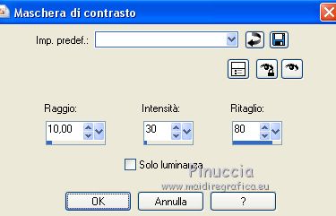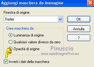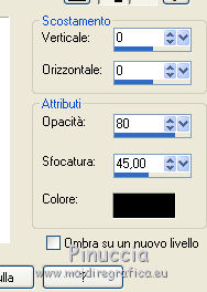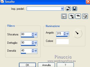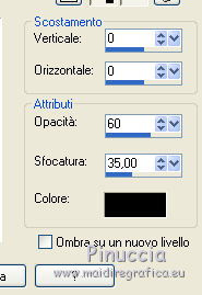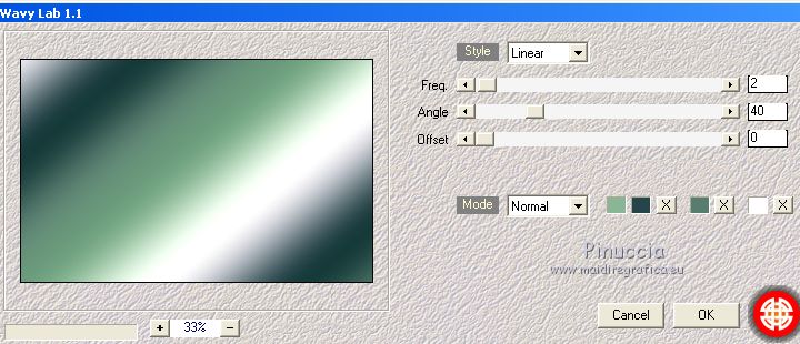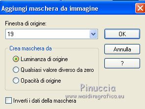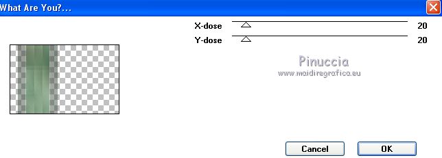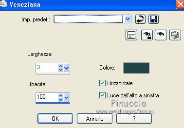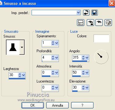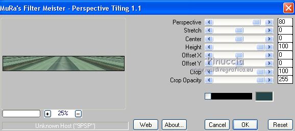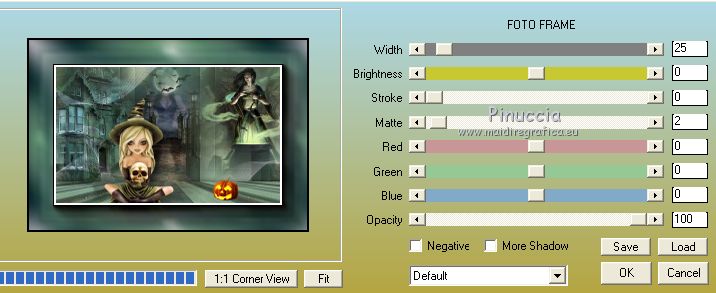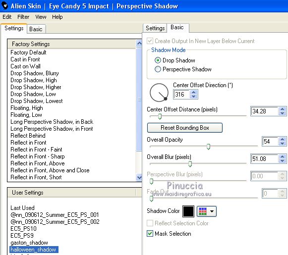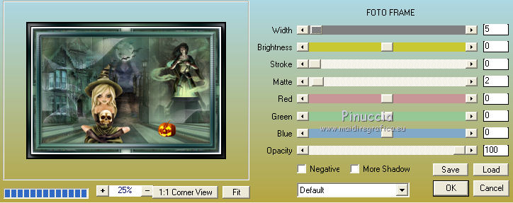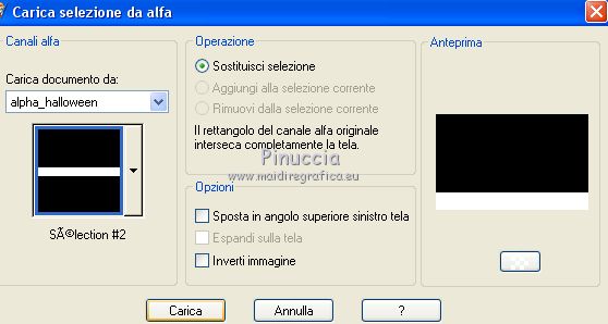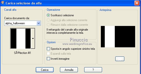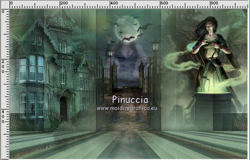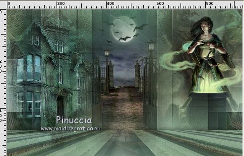 Le vostre versioniOccorrente: Materiale qui Due maschere trovate su Internet, ringrazio gli autori sconosciuti. Il resto del materiale è di Saturnella. (in questa pagina trovi i links ai siti dei creatori di tubes) Filtri in caso di dubbi, ricorda di consultare la mia sezione filtri qui Filters Unlimited 2.0 qui Toadies - What are you qui Mehdi - Wavy Lab 1.1. qui Alien Skin Eye Candy 5 Impact - Perspective Shadow qui Mura's Meister - Perspective Tiling qui Graphics Plus - Quick Tile I qui AAA Frames - Foto Frame qui I filtri Toadies e Graphcis Plus si possono usare da soli o importati in Filters Unlimited (come fare vedi qui) Se un filtro fornito appare con questa icona ![]() non esitare a cambiare modalità di miscelatura e opacità secondo i colori utilizzati. Nelle ultime versioni di PSP non c'è il gradiente di primo piano/sfondo (Corel_06_029) Puoi usare i gradienti delle versioni precedenti. Trovi qui i gradienti Corel X. Apri le maschere in PSP e minimizzale con il resto del materiale Imposta il colore di primo piano con il colore scuro #264548, e il colore di sfondo con il colore scuro #89b695. ![]() 1. Apri alpha_halloween. Finestra>Duplica o sulla tastiera maiuscola+D per fare una copia. ![]() Chiudi l'originale. La copia, che sarà la base del tuo lavoro, non è vuota, ma contiene le selezioni salvate sul canale alfa. Riempi l'immagine trasparente con il colore chiaro di primo piano.2. Effetti>Plugins>Mehdi - Wavy Lab 1.1. Questo filtro crea gradienti con i colori della paletta: il primo è il colore di sfondo, il secondo quello di primo piano. Degli ultimi due colori creati dal filtro, cambia il quarto con il colore bianco. ![]() 3. Regola>Sfocatura>Sfocatura gaussiana - raggio 40. ![]() 4. Selezione>Seleziona tutto. Apri il tube sat_hal22, cancella la firma e vai a Modifica>Copia. Minimizza il tube. Torna al tuo lavoro e vai a Modifica>Incolla nella selezione. Selezione>Deseleziona. 4. Effetti>Effetti di immagine>Motivo unico, con i settaggi standard. ![]() 5. Regola>Sfocatura>Sfocatura radiale. ![]() Effetti>Effetti di bordo>Aumenta di più - 2 volte. 6. Livelli>Duplica. Immagine>Rifletti. Cambia la modalità di miscelatura di questo livello in Luce diffusa. Livelli>Unisci>Unisci giù. 7. Apri il tube élément 1 e vai a Modifica>Copia. Torna al tuo lavoro e vai a Modifica>Incolla come nuovo livello. Abbassa l'opacità di questo livello al 30%. Livelli>Unisci>Unisci giù. 8. Imposta il colore di primo piano con il colore bianco. Livelli>Nuovo livello raster. Riempi il livello con il colore bianco.Livelli>Nuovo livello maschera>Da immagine. Apri il menu sotto la finestra d'origine e vedrai la lista dei files aperti. Seleziona la maschera 19. ![]() Effetti>Effetti di bordo>Aumenta. Livelli>Unisci>Unisci gruppo. Cambia la modalità di miscelatura di questo livello in Luminanza (esistente). 9. Effetti>Effetti 3D>Sfalsa ombra. ![]() Livelli>Unisci>Unisci visibile. 10. Selezione>Carica/Salva selezione>Carica selezione da canale alfa. La selezione #1 è subito disponibile. Devi soltanto cliccare Carica. ![]() Selezione>Innalza selezione a livello. Selezione>Deseleziona. 11. Imposta il colore di sfondo con il colore scuro. Effetti>Plugins>Toadies - What are you, con i settaggi standard. ![]() Effetti>Effetti di bordo>Aumenta. 12. Livelli>Duplica. Immagine>Rifletti. Livelli>Unisci>Unisci giù. Effetti>Effetti 3D>Sfalsa ombra, con i settaggi precedenti. Livelli>Unisci>Unisci visibile. 13. Selezione>Carica/Salva selezione>Carica selezione da canale alfa. Apri il menu delle selezioni e carica la selezione #2. ![]() Selezione>Innalza selezione a livello. 14. Effetti>Plugins>Mura's Meister - Perspective Tiling, con i settaggi standard. ![]() 1 15. Effetti>Effetti 3D>Sfalsa ombra, con i settaggi precedenti. Selezione>Deseleziona. 16. Apri il tube sat_mai02 e vai a Modifica>Copia. Torna al tuo lavoro e vai a Modifica>Incolla come nuovo livello. Immagine>Rifletti. Tasto K per attivare lo strumento Puntatore ![]() e imposta Posiziona X: e Posizione Y: ![]() Tasto M per deselezionare lo strumento. Regola>Messa a fuoco>Metti a fuoco. Cambia la modalità di miscelatura di questo livello in Luce netta. 17. Apri il tube sat_mai03 e vai a Modifica>Copia. Torna al tuo lavoro e vai a Modifica>Incolla come nuovo livello. E' al suo posto. Immagine>Ridimensiona, all'85%, tutti i livelli non selezionato. 18. Attiva nuovamente il tube sat_hal22 e vai a Modifica>Copia. Torna al tuo lavoro e vai a Modifica>Incolla come nuovo livello. Immagine>Ridimensiona, all'85%, tutti i livelli non selezionato. Sposta il tube a destra.![]() 19. Apri il tube sat_hal26 e vai a Modifica>Copia. Torna al tuo lavoro e vai a Modifica>Incolla come nuovo livello. Immagine>Ridimensiona, al 60%, tutti i livelli non selezionato. Posiziona correttamente il tube.Io ho cambiato la modalità di miscelatura in Luce diffusa, e ridotto l'opacità al 50%. ![]() 20. Apri il tube della zucca sat_hal08 e vai a Modifica>Copia. Torna al tuo lavoro e vai a Modifica>Incolla come nuovo livello. Immagine>Ridimensiona, a tuo piacimento (per me 3 volte al 70%, tutti i livelli non selezionato). Sposta il tube in basso a destra21. Apri il tube sat_hal05 e vai a Modifica>Copia. Torna al tuo lavoro e vai a Modifica>Incolla come nuovo livello. Immagine>Ridimensiona, al 60%, tutti i livelli non selezionato. Regola>Messa a fuoco>Metti a fuoco. Posiziona correttamente il tube.22. Effetti>Plugins>Alien Skin Eye Candy 5 Impact - Perspective Shadow. Seleziona il preset halloween_shadow e ok. ![]() 23. Attiva il livello di sfondo. Livelli>Nuovo livello raster. Riempi il livello con il colore bianco.Livelli>Nuovo livello maschera>Da immagine. Apri il menu sotto la finestra d'origine e seleziona la maschera Reflet. ![]() Effetti>Effetti di bordo>Aumenta. Immagine>Rifletti. Livelli>Unisci>Unisci gruppo. 24. Controlla che tutto sia correttamente posizionato. Livelli>Unisci>Unisci visibile. Per i bordi e per ripetere il filtro Wavy Lab: imposta nuovamente il colore
