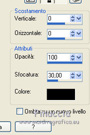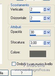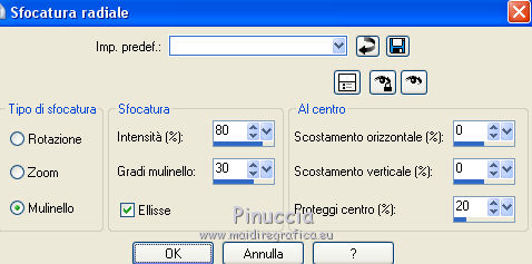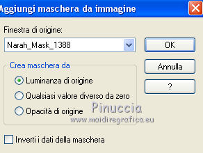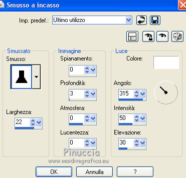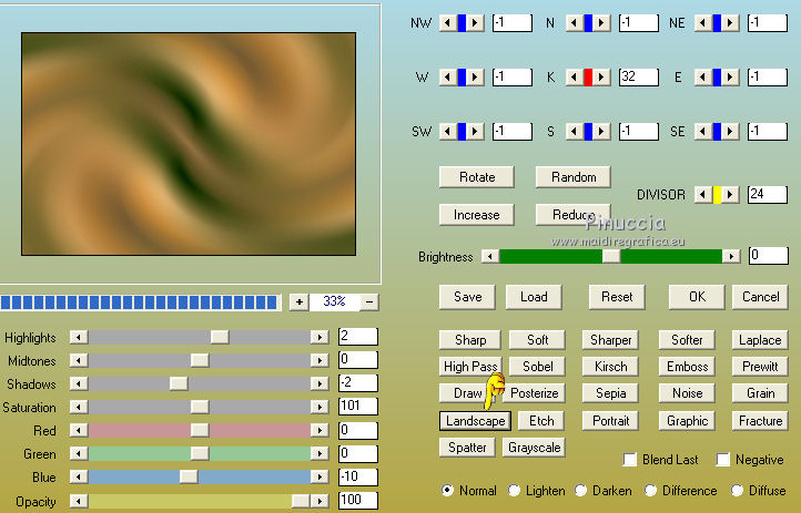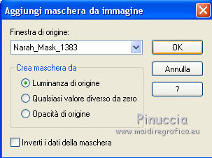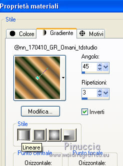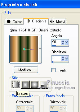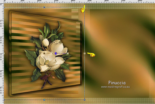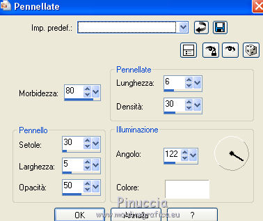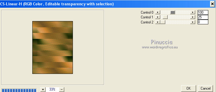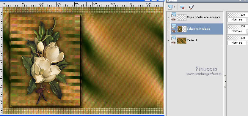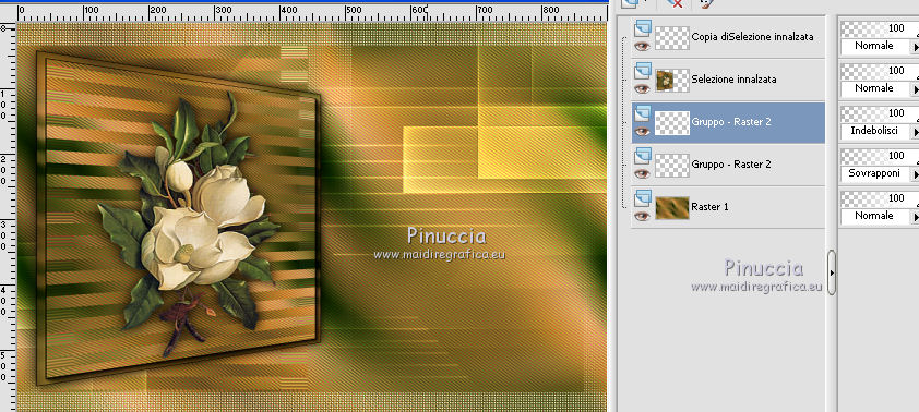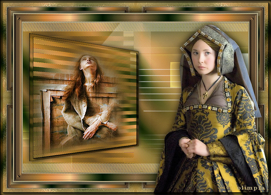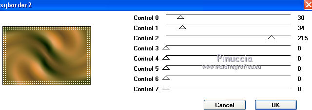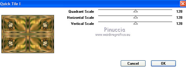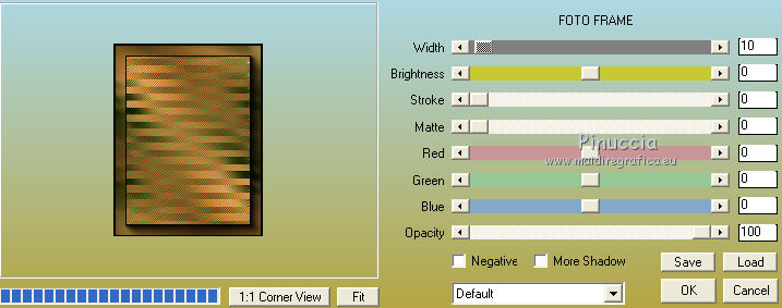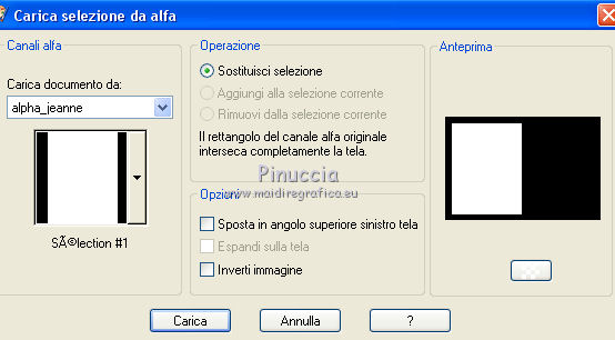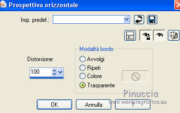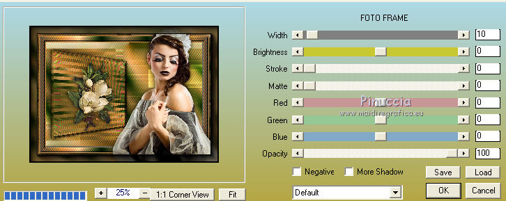 Occorrente: Materiale qui Grazie: per i tubes Alies e Patries, per le maschere Narah. (in questa pagina trovi i links ai siti dei creatori di tubes) Filtri in caso di dubbi, ricorda di consultare la mia sezione filtri qui Filters Unlimited 2.0 qui AFS IMPORT - sqborder2 qui Carolaine and Sensibility - CS-Linear-H qui Alien Skin Eye Candy 5 Impact - Perspective Shadow qui AAA Frames - Foto Frame / AAA Filters - Custom qui Graphics Plus - Quick Tile I qui I filtri AFS IMPORT e Graphics Plus si possono usare da soli o importati in Filters Unlimited (come fare vedi qui) Se un filtro fornito appare con questa icona ![]() non esitare a cambiare modalità di miscelatura e opacità secondo i colori utilizzati. Metti il gradiente ann_170410_gr_omani_tdstudio nella cartella Gradienti. Apri le maschere in PSP e minimizzale con il resto del materiale 1. Imposta il colore di primo piano con il colore #63635e, e il colore di sfondo con il colore #c88c46. ![]() Passa il colore di primo piano a Gradiente e seleziona il gradiente Ann_170410_GR_Omani_tdstudio, stile Lineare. ![]() Apri alpha_jeanne. Finestra>Duplica, o sulla tastiera tasto della maiuscola+D per fare una copia. ![]() Chiudi l'originale. La copia, che sarà la base del tuo lavoro, non è vuota, ma contiene una selezione salvata sul canale alfa. Rinomina il livello Raster 1. Riempi l'immagine trasparente con il gradiente.2. Regola>Sfocatura>Sfocatura radiale. ![]() 3. Effetti>Plugins>AAA Filters - Custom - Landscape. ![]() 4. Effetti>Effetti artistici>Mezzitoni. ![]() 5. Effetti>Plugins>AFS IMPORT - sqborder2. ![]() 6. Effetti>Effetti di immagine>Motivo unico, fianco a fianco ![]() 7. Selezione>Carica/Salva selezione>Carica selezione da canale alfa. La selezione sélection#1 è subito disponibile. Devi soltanto cliccare Carica. ![]() Effetti>Plugins>Carolaine and Sensibility - CS-Linear-H ![]() Selezione>Innalza selezione a livello. 8. Effetti>Plugins>AAA Frames - Foto Frame. ![]() Selezione>Deseleziona. 9. Effetti>Effetti 3D>Sfalsa ombra, colore nero. ![]() 10. Apri il tube dei fiori di Patries e vai a Modifica>Copia. Torna al tuo lavoro e vai a Modifica>Incolla come nuovo livello. Immagine>Ruota per gradi - 90 gradi a destra. ![]() 11. Immagine>Ridimensiona, all'85%, tutti i livelli non selezionato. Posiziona correttamente il tube sul quadro a sinistra.Regola>Messa a fuoco>Accentua messa a fuoco. 1 12. Effetti>Effetti 3D>Sfalsa ombra, con i settaggi precedenti. Livelli>Unisci>Unisci giù. 13. Livelli>Duplica. Effetti>Effetti geometrici>Prospettiva orizzontale. ![]() Immagine>Rifletti. Ripeti Effetti>Effetti geometrici>Prospettiva orizzontale con gli stessi settaggi. Modifica>Taglia. Modifica>Incolla come nuova immagine. Salva l'immagine come "deco cornice" e minimizzala. 14. Torna al tuo lavoro e attiva il livello del quadro. ![]() Effetti>Effetti geometrici>Prospettiva orizzontale. ![]() Tasto K per attivare lo strumento Puntatore ![]() e imposta Posizione X: -3,00 e Posizione Y: 22,00. ![]() 15. Se non visualizzi i righelli: Visualizza>Righelli. In modalità Scala ![]() spingi il nodo centrale a destra verso la sinistra fino a 480 pixels. ![]() Tasto M per deselezionare lo strumento. 16. Attiva il livello di sfondo. Imposta il colore di sfondo con il colore bianco. Livelli>Nuovo livello raster. Riempi il livello con il colore bianco.Livelli>Nuovo livello maschera>Da immagine. Apri il menu sotto la finestra d'origine e vedrai la lista dei files aperti. Seleziona la maschera Narah_Mask_1383. ![]() Effetti>Effetti di bordo>Aumenta. Livelli>Unisci>Unisci gruppo. Cambia la modalità di miscelatura di questo livello in Sovrapponi. 17. Effetti>Effetti 3D>Sfalsa ombra, colore di primo piano. ![]() 19. Livelli>Nuovo livello raster. Riempi con il colore bianco.Livelli>Nuovo livello maschera>Da immagine. Apri il menu sotto la finestra d'origine e seleziona la maschera Narah_Mask_1388. ![]() Immagine>Rifletti. Livelli>Duplica. Livelli>Unisci>Unisci gruppo. Cambia la modalità di miscelatura di questo livello in Indebolisci. ![]() 19. Attiva il livello di sfondo. Modifica>Copia. Per i bordi imposta nuovamente il colore di sfondo con il colore iniziale. ![]() Immagine>Aggiungi bordatura, 1 pixel, simmetriche, colore di primo piano. Immagine>Aggiungi bordatura, 3 pixels, simmetriche, colore di sfondo. Immagine>Aggiungi bordatura, 1 pixels, simmetriche, colore di primo piano. Selezione>Seleziona tutto. Immagine>Aggiungi bordatura, 30 pixels, simmetriche, colore bianco. Selezione>Inverti. Cambia i settaggi del gradiente. ![]() Riempi la selezione con il gradiente.20. Effetti>Effetti artistici>Mezzitoni, con i settaggi precedenti. 21. Effetti>Effetti 3D>Smusso a incasso. ![]() Selezione>Deseleziona. 22. Immagine>Aggiungi bordatura, 1 pixel, simmetriche, colore di primo piano. Immagine>Aggiungi bordatura, 3 pixels, simmetriche, colore di sfondo. Immagine>Aggiungi bordatura, 1 pixels, simmetriche, colore di primo piano. Selezione>Seleziona tutto. Immagine>Aggiungi bordatura, 50 pixels, simmetriche, colore bianco. Selezione>Inverti. Modifica>Incolla nella selezione (il tuo sfondo in memoria). 23. Effetti>Effetti tecniche di disegno>Pennellate. ![]() 24. Effetti>Plugins>Graphics Plus - Quick Tile I, con i settaggi standard. ![]() 25. Selezione>Inverti. Effetti>Effetti 3D>Sfalsa ombra, colore nero. ![]() Modifica>Ripeti Sfalsa ombra. Selezione>Deseleziona. 26. Apri il tube della donna e vai a Modifica>Copia. Torna al tuo lavoro e vai a Modifica>Incolla come nuovo livello. Immagine>Ridimensiona, al 110%, tutti i livelli non selezionato. Posiziona correttamente il tube.Effetti>Effetti 3D>Sfalsa ombra, con i settaggi precedenti. 27. Apri il tube "deco bordo" che hai minimizzato al punto 13. Modifica>Copia. Torna al tuo lavoro e vai a Modifica>Incolla come nuovo livello. Immagine>Ruota per gradi - 90 gradi a destra. ![]() Spostalo sul bordo a sinistra.Cambia la modalità di miscelatura di questo livello in Indebolisci. Livelli>Duplica. Immagine>Rifletti. Firma il 