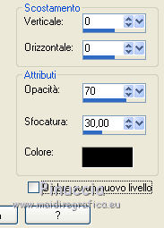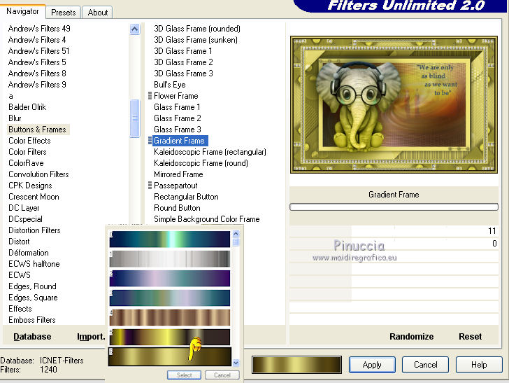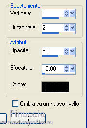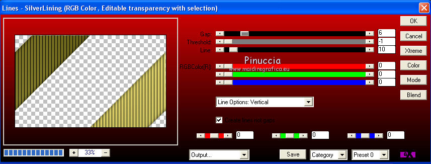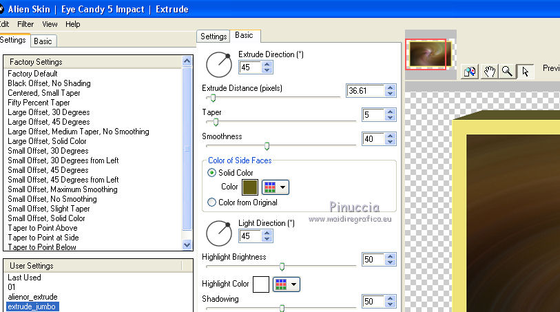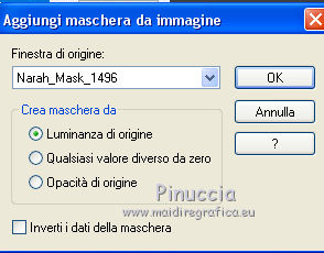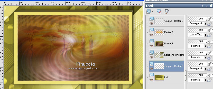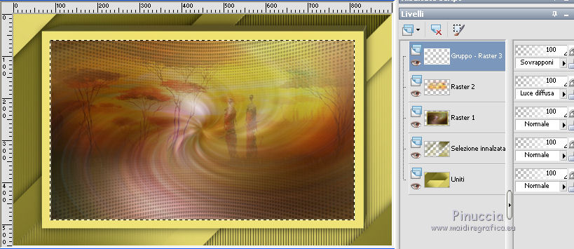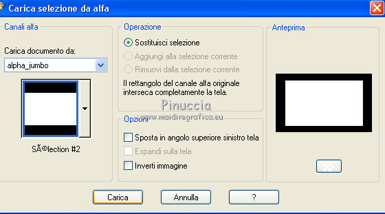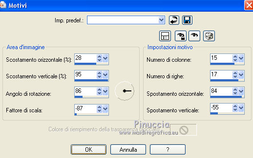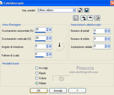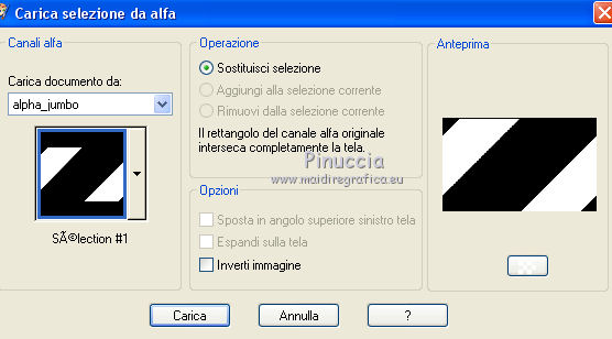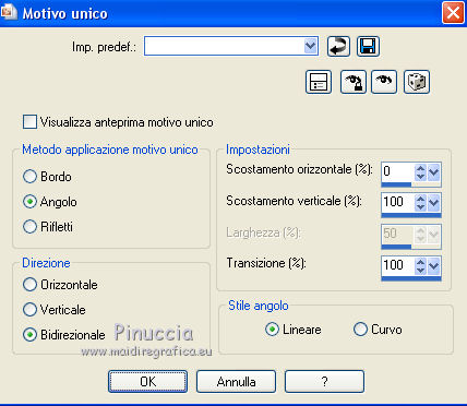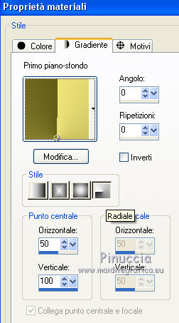 Occorrente: Materiale qui Grazie Narah per le maschere e Yoka per il wordart. Il resto del materiale è di Saturnella. (in questa pagina trovi i links ai siti dei creatori di tubes) Filtri in caso di dubbi, ricorda di consultare la mia sezione filtri qui Filters Unlimited 2.0 qui Flaming Pear - Make cube tile qui Alien Skin Eye Candy 5 Impact - Extrude qui AP 01 Innovations - Lines SilverLining qui ![]() non esitare a cambiare modalità di miscelatura e opacità secondo i colori utilizzati. Nelle ultime versioni di PSP non c'è il gradiente di primo piano/sfondo (Corel_06_029) Puoi usare i gradienti delle versioni precedenti. Trovi qui i gradienti Corel X. Metti il preset Cliccando sul file una o due volte (a seconda delle tue impostazioni), automaticamente il preset si installerà nella cartella corretta. perchè uno o due clic vedi qui Apri le maschere in PSP e minimizzale con il resto del materiale. 1. Imposta il colore di primo piano con il colore chiaro #efe378 , e il colore di sfondo con il colore scuro #635d16. ![]() Passa il colore di primo piano a Gradiente di primo piano/sfondo, stile Radiale. ![]() 2. Apri alpha_jumbo. Finestra>Duplica, o sulla tastiera tasto della maiuscola+D per fare una copia. ![]() Chiudi l'originale. La copia, che sarà la base del tuo lavoro, non è vuota, ma contiene le selezioni salvate sul canale alfa. Rinomina il livello Raster 1. Riempi l'immagine trasparente con il gradiente.2. Livelli>Duplica. Immagine>Ruota per gradi - 90 gradi a destra. ![]() 3. Effetti>Effetti geometrici>Inclina. ![]() 4. Effetti>Effetti 3D>Sfalsa ombra. ![]() 5. Effetti>Effetti di immagine>Motivo unico, con i settaggi standard. ![]() 6. Livelli>Unisci>Unisci visibile. 7. Selezione>Carica/Salva selezione>Carica selezione da canale alfa. La selezione #1 è subito disponibile. Devi soltanto cliccare Carica. ![]() Selezione>Innalza selezione a livello. Effetti>Plugins>AP 01 Innovations - Lines SilverLining. ![]() Selezione>Deseleziona. 8. Effetti>Effetti di immagine>Motivo unico. ![]() 9. Livelli>Nuovo livello raster. Passa il colore di primo piano a Colore. Riempi il livello con il colore di primo piano.Selezione>Seleziona tutto. Selezione>Modifica>Contrai - 25 pixels. ![]() Apri l'immagine image_jumbo e vai a Modifica>Copia. Torna al tuo lavoro e vai a Modifica>Incolla nella selezione. 10. Regola>Sfocatura>Sfocatura radiale. ![]() Selezione>Deseleziona. 11. Immagine>Ridimensiona, all'85%, tutti i livelli non selezionato. Regola>Messa a fuoco>Metti a fuoco. 12. Effetti>Plugins>Alien Skin Eye Candy 5 Impact - Extrude seleziona il preset extrude_jumbo e ok. ![]() Effetti>Effetti 3D>Sfalsa ombra, con i settaggi precedenti. 13. Apri il tube del paesaggio e vai a Modifica>Copia. Torna al tuo lavoro e vai a Modifica>Incolla come nuovo livello. Immagine>Ridimensiona, all'85%, tutti i livelli non selezionato. Cambia la modalità di miscelatura di questo livello in Luce diffusa (o secondo il tuo tube). 14. Selezione>Carica/Salva selezione>Carica selezione da canale alfa. Apri il menu delle selezioni e carica la selezione #2. ![]() Livelli>Nuovo livello raster. Imposta il colore di primo piano con il colore bianco. Riempi il livello con il colore bianco.Livelli>Nuovo livello maschera>Da immagine. Apri il menu sotto la finestra d'origine e vedrai la lista dei files aperti. Seleziona la maschera Narah_Mask_1496. ![]() Livelli>Unisci>Unisci gruppo. Cambia la modalità di miscelatura di questo livello in Sovrapponi. 15. Effetti>Plugins>Flaming Pear - Make cube tile Questo effetto lavora senza finestra; risultato ![]() Selezione>Deseleziona. 16. Attiva il livello di sfondo. Livelli>Nuovo livello raster. Riempi con il colore bianco.Livelli>Nuovo livello maschera>Da immagine. Apri il menu sotto la finestra d'origine e seleziona la maschera Narah_Mask_1500. ![]() Non unire il gruppo 16. Effetti>Effetti di immagine>Motivo unico. ![]() Effetti>Effetti di bordo>Aumenta. Livelli>Unisci>Unisci gruppo. Cambia la modalità di miscelatura di questo livello in Sovrapponi. ![]() 18. Effetti>Effetti 3D>Sfalsa ombra, con i settaggi precedenti. 19. Attiva il livello superiore. Apri il tube e vai a Modifica>Copia. Torna al tuo lavoro e vai a Modifica>Incolla come nuovo livello. Immagine>Ridimensiona, al 75%, tutti i livelli non selezionato. Posiziona correttamente il tube.Livelli>Duplica. Attiva il livello sottostante dell'originale. Regola>Sfocatura>Sfocatura gaussiana - raggio 30. ![]() Cambia la modalità di miscelatura di questo livello in Moltiplica. 20. Apri il tube deco e vai a Modifica>Copia. Torna al tuo lavoro e vai a Modifica>Incolla come nuovo livello. Non spostarlo. 21. Effetti>Effetti 3D>Sfalsa ombra, colore nero. ![]() 22. Apri il wordart di Yoka e vai a Modifica>Copia. Torna al tuo lavoro e vai a Modifica>Incolla come nuovo livello. Immagine>Ridimensiona, al 60%, tutti i livelli non selezionato. Colorizza, se necessario, secondo i tuoi colori. Spostalo in alto a destra23. Livelli>Unisci>Unisci tutto. Modifica>Copia. 24. Per i bordi, imposta nuovamente il colore di primo piano con #efe378. ![]() Immagine>Aggiungi bordatura, 1 pixel, simmetriche, colore di sfondo. Immagine>Aggiungi bordatura, 3 pixels, simmetriche, colore di primo piano. Immagine>Aggiungi bordatura, 1 pixel, simmetriche, colore di sfondo. Selezione>Seleziona tutto. Immagine>Aggiungi bordatura, 15 pixels, simmetriche, colore bianco. Selezione>Inverti. Effetti>Effetti di riflesso>Motivi. ![]() (l'effetto dipende dall'immagine; se vuoi puoi scegliere un altro settaggio, cliccando sul dado, finché non vedi quello che preferisci). 25. Selezione>Inverti. Effetti>Effetti 3D>Sfalsa ombra, colore nero. ![]() Selezione>Deseleziona. 26. Immagine>Aggiungi bordatura, 1 pixel, simmetriche, colore di sfondo. Immagine>Aggiungi bordatura, 3 pixels, simmetriche, colore di primo piano. Immagine>Aggiungi bordatura, 1 pixel, simmetriche, colore di sfondo. 27. Selezione>Seleziona tutto. Immagine>Aggiungi bordatura, 50 pixels, simmetriche, colore bianc
