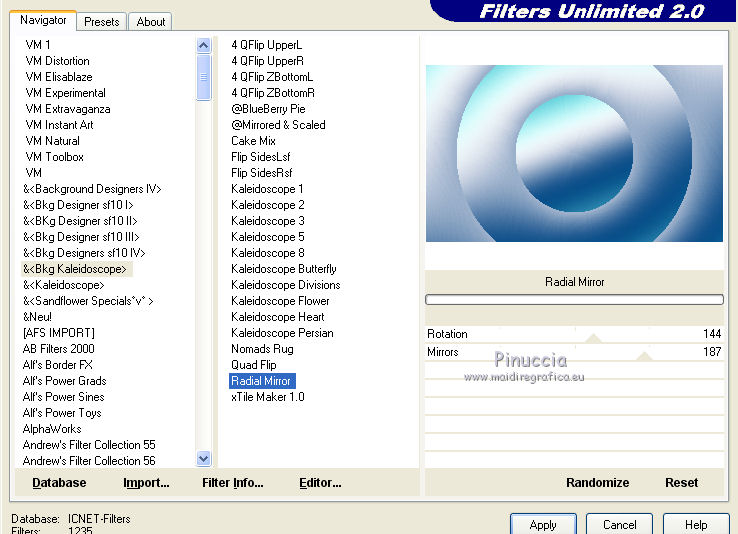 2. Effetti>Plugins>Filters Unlimited 2.0 - &<Bkg Kaleidoscope> - Radial Mirror, con i settaggi standard.