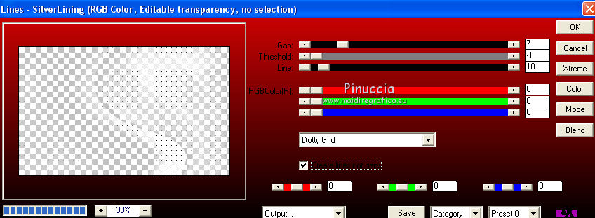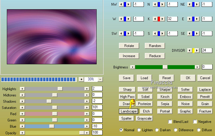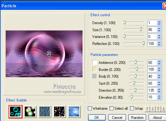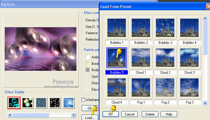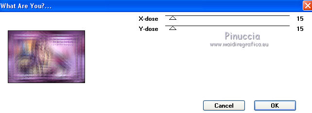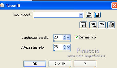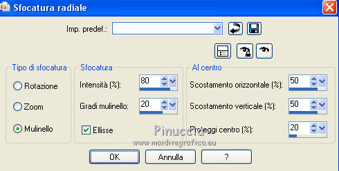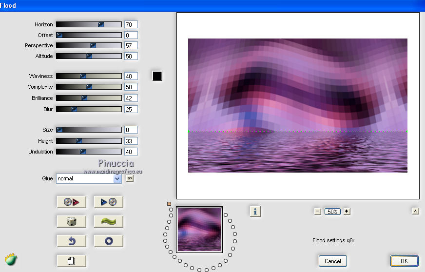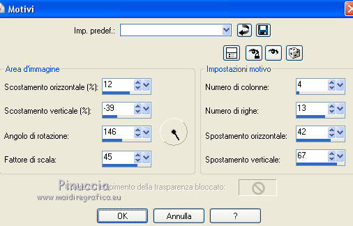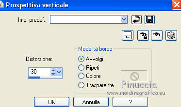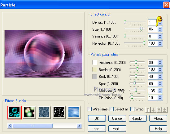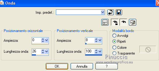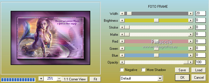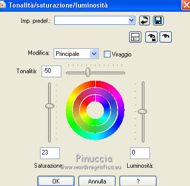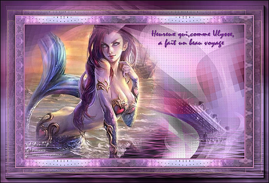 Occorrente: Materiale qui Grazie per Narah per le maschere. Il resto del materiale è di Saturnella. (in questa pagina trovi i links ai siti dei creatori di tubes) Filtri in caso di dubbi, ricorda di consultare la mia sezione filtri qui Filters Unlimited 2.0 qui Flaming Pear - Flood qui Toadies - What are you qui Ulead Particle qui AP 01 [Innovations] - Lines SilverLining qui AAA Filters - Custom / AAA Frames - Foto Frame qui I filtri Toadies si possono usare da soli o importati in Filters Unlimited (come fare vedi qui) Se un filtro fornito appare con questa icona ![]() non esitare a cambiare modalità di miscelatura e opacità secondo i colori utilizzati. Apri le maschere in PSP e minimizzale con il resto del materiale Imposta il colore di primo piano con il colore scuro #7b219f, e il colore di sfondo con il colore chiaro #39a2c0. ![]() 1. Apri una nuova immagine trasparente 900 x 550 pixels. 2. Selezione>Seleziona tutto. Apri il tube fractale_mermaid e vai a Modifica>Copia. Torna al tuo lavoro e vai a Modifica>Incolla nella selezione. Selezione>Deseleziona. 3. Effetti>Effetti di immagine>Motivo unico, con i settaggi standard. ![]() 4. Regola>Sfocatura>Sfocatura radiale. ![]() Effetti>Effetti di bordo>Aumenta di più. 5. Effetti>Plugins>AAA Filters - Custom - clicca su Landscape e ok ![]() 6. Effetti>Effetti di distorsione>Tasselli. ![]() 7. Effetti>Effetti di riflesso>Specchio rotante, con i settaggi standard. ![]() 8. Effetti>Effetti di distorsione>Onda. ![]() 9. Effetti>Effetti geometrici>Prospettiva verticale. ![]() 10. Imposta il colore di primo piano con il colore bianco. ![]() Livelli>Nuovo livello raster. Riempi il livello con il colore di primo piano.Livelli>Nuovo livello maschera>Da immagine. Apri il menu sotto la finestra di origine e vedrai la lista dei files aperti. Seleziona la maschera Narah_mask_0878. ![]() Livelli>Unisci>Unisci gruppo. Livelli>Duplica. Livelli>Unisci>Unisci giù. 11. Effetti>Plugins>AP 01 [Innovations] - Lines SilverLining. ![]() Cambia la modalità di miscelatura di questo livello in Luminanza (esistente). 12. Livelli>Nuovo livello raster. Riempi la selezione con il colore di primo piano.Livelli>Nuovo livello maschera>Da immagine. Apri il menu sotto la finestra di origine e seleziona la maschera Narah_mask_1365. ![]() Effetti>Effetti di bordo>Aumenta. Livelli>Unisci>Unisci gruppo. 13. Tasto K per attivare lo strumento Puntatore ![]() e imposta Posizione X: 153,00 e Posizione Y: 188,00. ![]() 14. Apri il tube bateau e vai a Modifica>Copia. Torna al tuo lavoro e vai a Modifica>Incolla come nuovo livello. Immagine>Ridimensiona, al 70%, tutti i livelli non selezionato. Strumento Puntatore ![]() e imposta Posizione X: 458,00 e Posizione Y: 195,00. ![]() Tasto M per deselezionare lo strumento. 15. Livelli>Unisci>Unisci giù. Cambia la modalità di miscelatura di questo livello in Luminanza (esistente) e abbassa l'opacità al 70%. 16. Apri il tube sirène e vai a Modifica>Copia. Torna al tuo lavoro e vai a Modifica>Incolla come nuovo livello. Spostalo a sinistra.Livelli>Duplica - 2 volte. Livelli>Unisci>Unisci giù - 2 volte. 17. Apri il tube texte e vai a Modifica>Copia. Torna al tuo lavoro e vai a Modifica>Incolla come nuovo livello. Spostalo in alto a destra.18. Effetti>Effetti 3D>Sfalsa ombra. ![]() 19. Attiva il livello di sfondo. Effetti>Plugins>Flaming Pear - Flood. ![]() 20. Rimani su questo livello. Effetti>Plugins>Ulead - Particle clicca su Load e seleziona Bubble 5; ok per continuare ![]() Cambia size con 86 ![]() e premi il tasto sinistro del mouse sulla sfera per spostarla a sinistra ![]() 21. Attiva il livello di sfondo. Modifica>Copia. 22. Imposta nuovamente il colore di primo piano con il colore iniziale. ![]() Immagine>Aggiungi bordatura, 1 pixel, simmetriche, colore di primo piano. Immagine>Aggiungi bordatura, 3 pixels, simmetriche, colore di sfondo. Immagine>Aggiungi bordatura, 1 pixel, simmetriche, colore di primo piano. Immagine>Aggiungi bordatura, 30 pixels, simmetriche, colore bianco. Attiva lo strumento Bacchetta magica ![]() e clicca nel bordo bianco per selezionarlo. Effetti>Effetti di riflesso>Motivi. ![]() Colorizza con i tuoi colori: per il mio esempio: Regola>Tonalità e Saturatione>Tonalità/Saturazione/Luminosità ![]() 23. Effetti>Effetti 3D>Smusso a incasso. ![]() Selezione>Deseleziona. 24. Immagine>Aggiungi bordatura, 1 pixel, simmetriche, colore di primo piano. Immagine>Aggiungi bordatura, 3 pixels, simmetriche, colore di sfondo. Immagine>Aggiungi bordatura, 1 pixel, simmetriche, colore di primo piano. Immagine>Aggiungi bordatura, 60 pixels, simmetriche, colore bianco. Seleziona il bordo bianco con la bacchetta magica ![]() Modifica>Incolla nella selezione (lo sfondo in memoria dal punto 21). 26. Effetti>Plugins>Toadies - What are you. ![]() Effetti>Effetti di bordo>Aumenta. 27. Effetti>Plugins>AAA Frames - Foto Frame. ![]() Selezione>Inverti. Effetti>Effetti 3D>Sfalsa ombra. ![]() Selezione>Deseleziona. 28. Firma il tuo lavoro su un nuovo livello. Immagine>Aggiungi bordatura, 1 pixel, simmetriche, colore nero. Immagine>Ridimensiona, 900 pixels di larghezza, tutti i livelli selezionato. Regola>Messa a fuoco>Maschera di contrasto. ![]() Salva in formato jpg. Versione con un mio tube ![]() Le vostre versioni Grazie ![]() Puoi scrivermi per qualsiasi problema, o dubbio, se trovi un link che non funziona, o anche soltanto per un saluto. 15 Ottobre 2019 |
