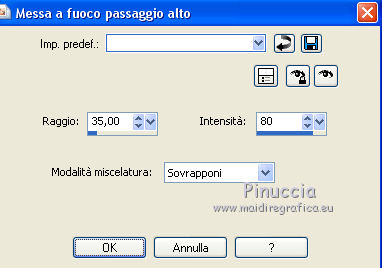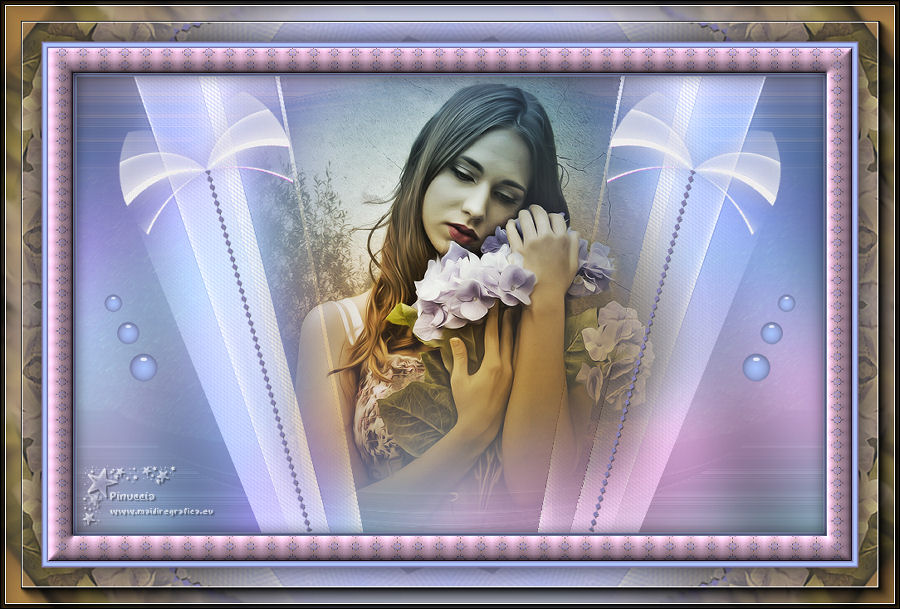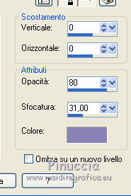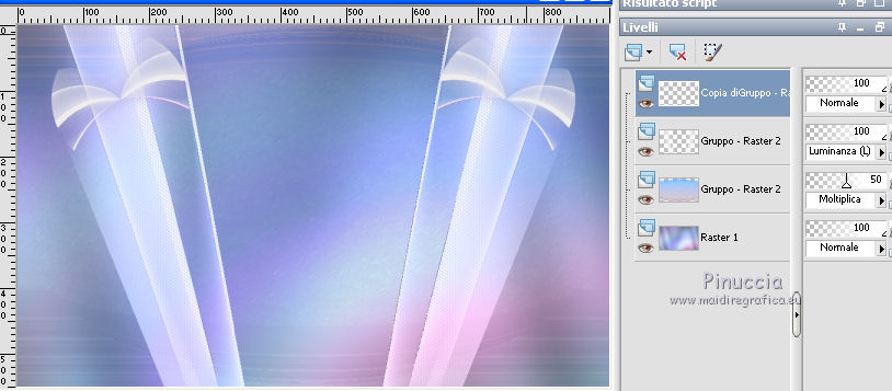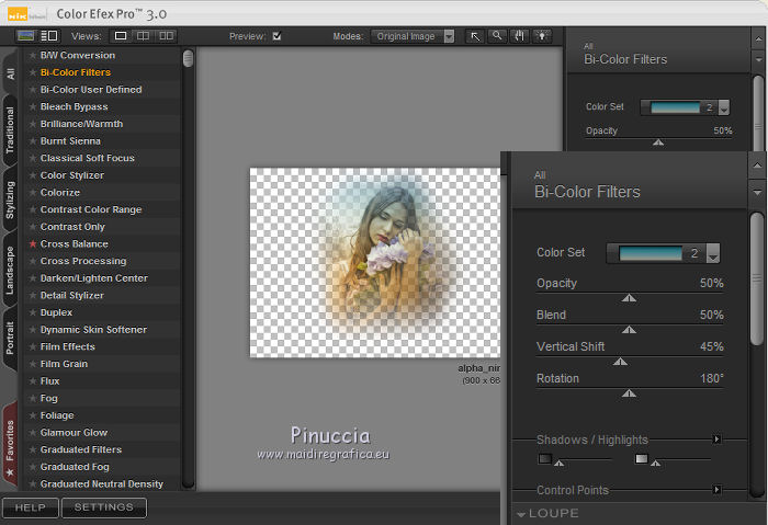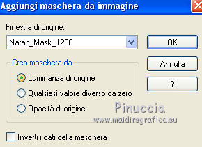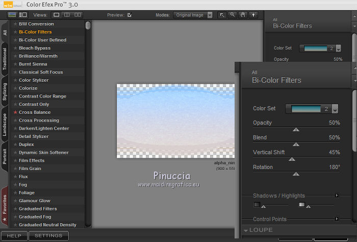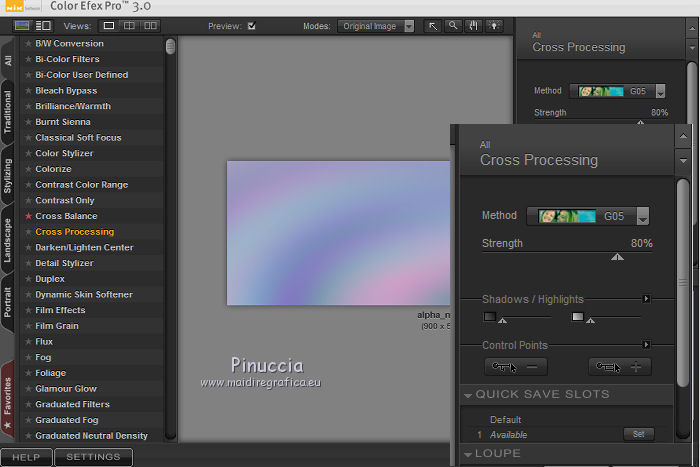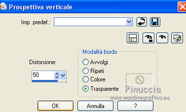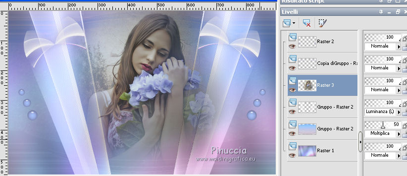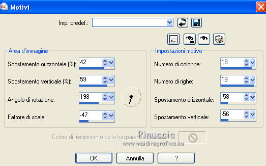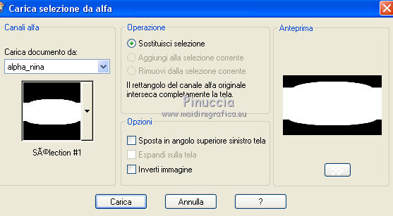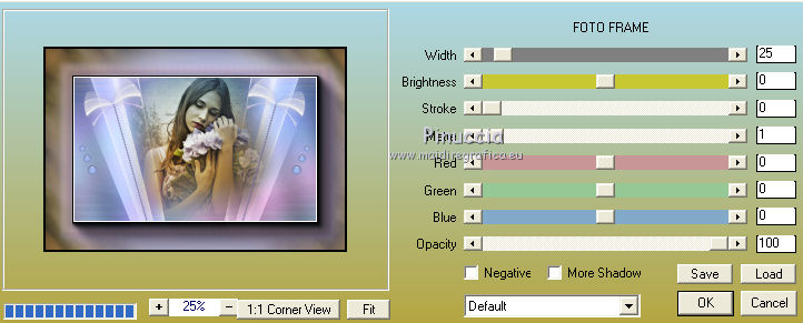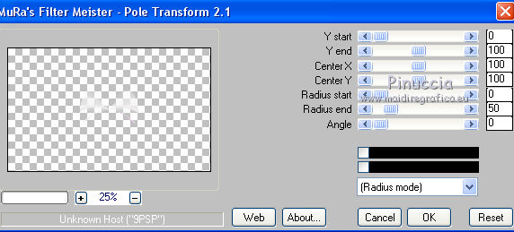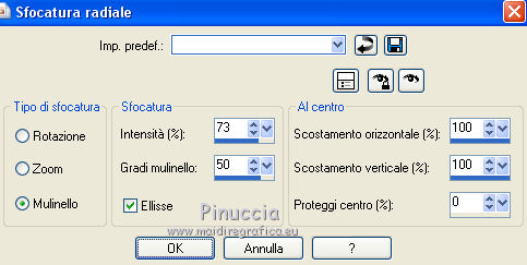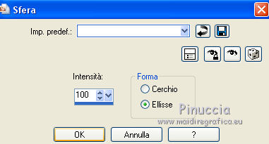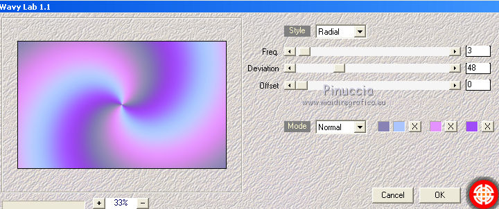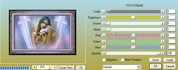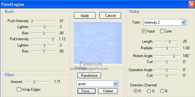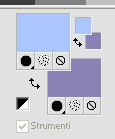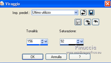 Le vostre versioniOccorrente: Materiale qui Per le maschere grazie Narah. Il resto del materiale è di Saturnella. (in questa pagina trovi i links ai siti dei creatori di tubes) Filtri in caso di dubbi, ricorda di consultare la mia sezione filtri qui Filters Unlimited 2.0 qui Mehdi - Wavy Lab 1.1 qui Nik Software - Color Efex Pro qui AAA Frame - Foto Frame qui Graphics Plus - Cross Shadow qui Fantastic Machine - Paint Engine qui Adjust - Variations qui Mura's Meister - Pole Transform qui I filtri Graphics plus si possono usare da soli o importati in Filters Unlimited (come fare vedi qui) Se un filtro fornito appare con questa icona ![]() non esitare a cambiare modalità di miscelatura e opacità secondo i colori utilizzati. Apri le maschere in PSP e minimizzale con il resto del materiale. Imposta il colore di primo piano con il colore 1 #abc6fe, e il colore di sfondo con il colore 2 #8982b4. ![]() 1. Apri alpha_nina. Finestra>Duplica o sulla tastiera maiuscola+D per fare una copia. ![]() Chiudi l'originale. La copia, che sarà la base del tuo lavoro, non è vuota, ma contiene una selezione salvata sul canale alfa. Effetti>Plugins>Mehdi - Wavy Lab 1.1. Questo filtro crea gradienti con i colori della paletta; il primo è il colore di sfondo, il secondo quello di primo piano. Cambia gli ultimi due colori creati dal filtro: il terzo con il colore 3 #e392fe e il quarto con il colore 4: #9f4bf8. ![]() 2. Regola>Sfocatura>Sfocatura radiale. ![]() 3. Effetti>Plugins>Nik Software - Color Efex Pro - Cross Processing Method G05 (adatta ai tuoi colori) ![]() 4. Effetti>Plugins>Graphics Plus - Cross Shadow. ![]() 5. Livelli>Nuovo livello raster. Riempi il livello con il colore di primo piano #abc6fe.6. Livelli>Nuovo livello maschera>Da immagine. Apri il menu sotto la finestra d'origine e vedrai la lista dei files aperti. Seleziona la maschera Narah_Mask_1206. ![]() Effetti>Effetti di bordo>Aumenta. Livelli>Unisci>Unisci gruppo. 7. Effetti>Effetti di distorsione>Allarga. ![]() 8. Effetti>Effetti geometrici>Sfera. ![]() 9. Selezione>Carica/Salva selezione>Carica selezione da canale alfa. La selezione #1 è subito disponibile. Devi soltanto cliccare Carica. ![]() Effetti>Plugins>Fantastic Machine - Paint Engine. Seleziona il preset Arctic e ok se non trovi il preset nella lista o addirittura non trovi alcun preset, è un problema di installazione del filtro: vedi la scheda qui In ogni caso, puoi sempre copiare i settaggi che vedi nella schermata. ![]() Selezione>Deseleziona. 10. Effetti>Plugins>Nik Software - Color Efex Pro Bi-color filters - a destra Color Set: Cool/Warm 2 (adatta ai tuoi colori) ![]() 11. Effetti>Plugins>Adjust - Variations un clic su Original per annullare eventuali precedenti settaggi memorizzati dal filtro, un clic su More Blue, un clic su Darker e ok. Cambia la modalità di miscelatura di questo livello in Moltiplica, e abbassa l'opacità al 50%. 12. Imposta il colore di primo piano con il colore bianco. Livelli>Nuovo livello raster. Riempi il livello con il colore bianco.Livelli>Nuovo livello maschera>Da immagine. Apri il menu sotto la finestra d'origine e seleziona la maschera Narah_Mask_1429. ![]() Effetti>Effetti di bordo>Aumenta. Livelli>Unisci>Unisci gruppo. 13. Effetti>Effetti geometrici>Prospettiva verticale. ![]() 14. Effetti>Effetti artistici>Mezzitoni. ![]() Cambia la modalità di miscelatura di questo livello in Luminanza (esistente). 15. Livelli>Duplica. Effetti>Plugins>Mura's Meister - Pole Transform. ![]() 16. Immagine>Ridimensiona, all'80%, tutti i livelli non selezionato. 17. Immagine>Ruota per gradi - 20 gradi a sinistra. ![]() Tasto K sulla tastiera per attivare lo strumento Puntatore ![]() e imposta Posizione X: 50,00 e Posizione Y: 17,00. ![]() Tasto M per deselezionare lo strumento. 18. Livelli>Duplica. Immagine>Rifletti. Livelli>Unisci>Unisci giù. 19. Effetti>Effetti 3D>Sfalsa ombra, colore di sfondo #8982b4. ![]() Imposta il colore di primo piano con il colore bianco. Livelli>Nuovo livello raster. Riempi il livello con il colore bianco di primo piano.Riporta la modalità di miscelatura di questo livello a Normale. ![]() 20. Apri il tube deco e vai a Modifica>Copia. Torna al tuo lavoro e vai a Modifica>Incolla come nuovo livello. Strumento Puntatore ![]() mantieni Posizione X: 33.00 e e imposta Posizione Y: 262,00 ![]() 21. Apri il tube della donna e vai a Modifica>Copia. Torna al tuo lavoro e vai a Modifica>Incolla come nuovo livello. Immagine>Ridimensiona, all'80%, tutti i livelli non selezionato. Livelli>Disponi>Sposta giù - 2 volte. ![]() 22. Effetti>Plugins>Nik Software - Color Efex Pro - Bi-colo filters, con i settaggi precedenti. ![]() Regola>Messa a fuoco>Messa a fuoco Passaggio alto. ![]() 23. Apri il tube deco2 e vai a Modifica>Copia. Torna al tuo lavoro e vai a Modifica>Incolla come nuovo livello. Strumento Puntatore ![]() mantieni Posizione X: 154,00 e imposta Posizione Y: 112,00. ![]() 24. Effetti>Effetti 3D>Sfalsa ombra, colore nero. ![]() 25. Per i bordi, imposta nuovamente il colore di primo piano con il colore 1 #abc6fe. ![]() Immagine>Aggiungi bordatura, 1 pixel, simmetriche, colore di primo piano #abc6fe. Immagine>Aggiungi bordatura, 3 pixels, simmetriche, colore di sfondo #8982b4. Immagine>Aggiungi bordatura, 1 pixel, simmetriche, colore di primo piano #abc6fe. Selezione>Seleziona tutto. Immagine>Aggiungi bordatura, 30 pixels, simmetriche, colore bianco. Selezione>Inverti. 26. Effetti>Effetti di riflesso>Motivi. ![]() 27. Effetti>Effetti 3D>Smusso a incasso. ![]() se vuoi cambiare il colore della cornice, colorizza. Per l'esempio in fondo al tutorial: Regola>Tonalità e saturazione>Viraggio ![]() 28. Effetti>Effetti 3D>Sfalsa ombra. ![]() Selezione>Deseleziona. 29. Immagine>Aggiungi bordatura, 2 pixels, simmetriche, colore di sfondo #8982b4. Immagine>Aggiungi bordatura, 4 pixels, simmetriche, colore di primo piano #abc6fe. Immagine>Aggiungi bordatura, 2 pixels, simmetriche, colore di sfondo #8982b4. 30. Selezione>Seleziona tutto. Immagi