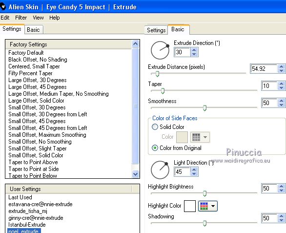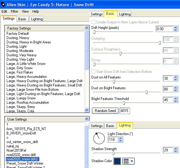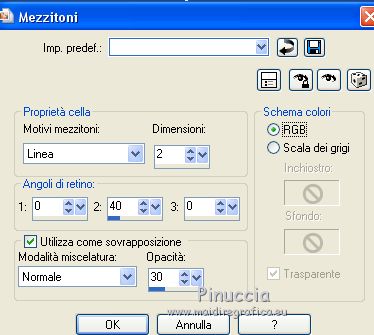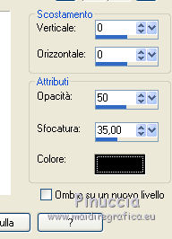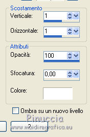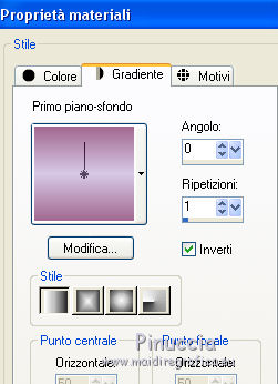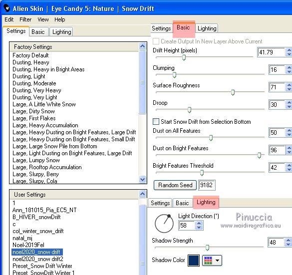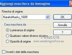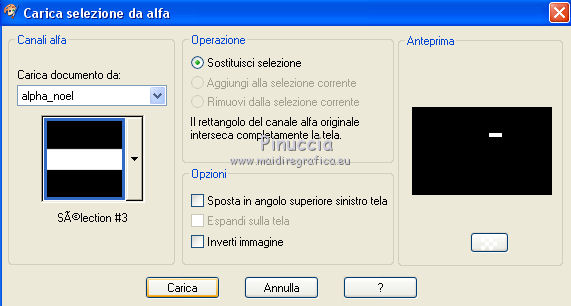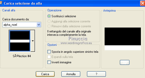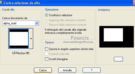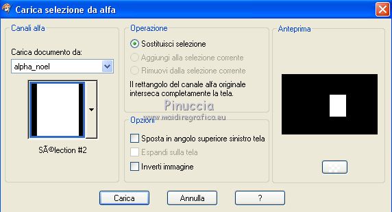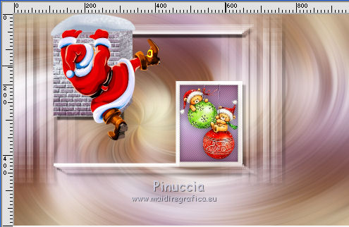 Le vostre versioniOccorrente: Materiale qui Per la maschera grazie Narah Il resto del materiale è di Saturnella. (in questa pagina trovi i links ai siti dei creatori di tubes) Filtri in caso di dubbi, ricorda di consultare la mia sezione filtri qui Mura's Meister - Perspective Tiling qui Alien Skin Eye Candy 5 Nature - Snow Drift qui Alien Skin Eye Candy 5 Impact - Extrude qui ![]() non esitare a cambiare modalità di miscelatura e opacità secondo i colori utilizzati. Nelle ultime versioni di PSP non c'è il gradiente di primo piano/sfondo (Corel_06_029) Puoi usare i gradienti delle versioni precedenti. Trovi qui i gradienti Corel X. Metti i preset e Nature>Settings>Snow Drift. Cliccando sul file una o due volte (a seconda delle tue impostazioni), automaticamente il preset si installerà nella cartella corretta. perchè uno o due clic vedi qui Apri la maschera in PSP e minimizzala con il resto del materiale. La trama Mattoni o Corel_15_033 è standard in PSP. Se non la trovi nel tuo PSP, metti la trama fornita nella cartella Trame. 1. Apri alpha_noel Finestra>Duplica o sulla tastiera maiuscola+D per fare una copia. ![]() Chiudi l'originale. La copia, che sarà la base del tuo lavoro, non è vuota, ma contiene una selezione salvata sul canale alfa. 2. Selezione>Seleziona tutto. Apri l'immagine in jpg, image.jpg, e vai a Modifica>Copia. Torna al tuo lavoro e vai a Modifica>Incolla nella selezione. Selezione>Deseleziona. 3. Effetti>Effetti di immagine>Motivo unico, con i settaggi standard. ![]() 4. Regola>Sfocatura>Sfocatura radiale. ![]() 5. Imposta il colore di primo piano con il colore bianco. Livelli>Nuovo livello raster. Riempi il livello con il colore bianco.Livelli>Nuovo livello maschera>Da immagine. Apri il menu sotto la finestra di origine e vedrai la lista dei files aperti. Seleziona la maschera NarahsMasks_1609 ![]() Regola>Messa a fuoco>Accentua messa a fuoco. Livelli>Unisci>Unisci gruppo. 6. Immagine>Ridimensiona, all'80%, tutti i livelli non selezionato. Oggetti>Allinea>Superiore. Oggetti>Allinea>Sinistra. Se stai usando una versione precedente che non rende disponibile il menu Oggetti, attiva lo strumento Puntatore ![]() e imposta Posizione X e Y a 0,00. ![]() Cambia la modalità di miscelatura di questo livello in Luce netta. Effetti>Effetti 3D>Sfalsa ombra, con i settaggi standard. ![]() 7. Selezione>Carica/Salva selezione>Carica selezione da canale alfa. La selezione #1 è subito disponibile. Devi soltanto cliccare Carica. ![]() Selezione>Innalza selezione a livello. Imposta il colore di primo piano con #d7c9e6, e il colore di sfondo con #a26892. ![]() Passa il colore di primo piano a Gradiente di primo piano/sfondo, stile Lineare. ![]() Riempi la selezione con il gradiente.8. Effetti>Effetti di trama>Trama - seleziona la trama Mattoni o Corel_15_033. ![]() 9. Effetti>Plugins>Alien Skin Eye Candy 5 Impact - Extrude. Seleziona il preset noel_extrude e ok. ![]() Selezione>Deseleziona. 10. Effetti>Plugins>Alien Skin Eye Candy 5 Nature - Snow drift seleziona il preset noel2020_snow drift e ok. ![]() 11. Attiva il livello della maschera. Selezione>Carica/Salva selezione>Carica selezione da canale alfa. Apri il menu delle selezioni e carica la selezione #2. ![]() Selezione>Innalza selezione a livello. Riempi la selezione con il gradiente lineare.Livelli>Nuovo livello raster. Effetti>Effetti 3D>Ritaglio. ![]() Livelli>Unisci>Unisci giù. Selezione>Deseleziona. 12. Effetti>Effetti artistici>Mezzitoni. ![]() 13. Apri il tube boule_16 e vai a Modifica>Copia. Torna al tuo lavoro e vai a Modifica>Incolla come nuovo livello. Immagine>Ridimensiona, al 35%, tutti i livelli non selezionato. Posiziona il tube nel rettangolo.Regola>Messa a fuoco>Metti a fuoco. Effetti>Effetti 3D>Sfalsa ombra. ![]() 14. Selezione>Carica/Salva selezione>Carica selezione da canale alfa. Apri il menu delle selezioni e carica la selezione #3. ![]() Premi sulla tastiera il tasto CANC ![]() Selezione>Deseleziona. Livelli>Unisci>Unisci giù. 15. Apri il tube père noel e vai a Modifica>Copia. Torna al tuo lavoro e vai a Modifica>Incolla come nuovo livello. Immagine>Ridimensiona, al 40%, tutti i livelli non selezionato. Posiziona correttamente il tube![]() 16. Effetti>Effetti 3D>Sfalsa ombra, con i settaggi precedenti. 17. Attiva il livello di sfondo. Selezione>Carica/Salva selezione>Carica selezione da canale alfa. Apri il menu delle selezioni e carica la selezione #4. ![]() Selezione>Innalza selezione a livello. Effetti>Plugins>Mura's Meister - Perspective Tiling, con i settaggi standard. ![]() Selezione>Deseleziona. Livelli>Disponi>Porta in alto. 18. Attiva lo strumento Bacchetta magica , sfumatura 35e clicca sulla parte trasparente in alto per selezionarla. Premi 5-6 volta CANC sulla tastiera. Selezione>Deseleziona. Non dimenticare di riportare la sfumatura della bacchetta magica a 0. 19. Effetti>Plugins>Alien Skin Eye Candy 5 Nature - Snow Drift. Seleziona il preset noel2020_snow drift 2 e ok. ![]() 20. Apri il tube neige e vai a Modifica>Copia. Torna al tuo lavoro e vai a Modifica>Incolla come nuovo livello. Oggetti>Allinea>Inferiore, o attiva lo strumento Puntatore ![]() e imposta Posizione Y a 497,00 ![]() 21. Attiva nuovamente il livello della maschera (gruppo Raster 1). Selezione>Carica/Salva selezione>Carica selezione da canale alfa. Apri il menu delle selezioni e carica la selezione #5. ![]() Livelli>Nuovo livello raster. Apri il tube boules_13 e vai a Modifica>Copia. Torna al tuo lavoro e vai a Modifica>Incolla nella selezione. Selezione>Deseleziona. 22. Attiva il livello superiore. Apri il tube sat_noel02 e vai a Modifica>Copia. Torna al tuo lavoro e vai a Modifica>Incolla come nuovo livello. Immagine>Ridimensiona, al 75%, tutti i livelli non selezionato. Posiziona correttamente il tube.Effetti>Effetti 3D>Sfalsa ombra, con i settaggi precedenti. 23. Apri il tube sat_per09 e vai a Modifica>Copia. Torna al tuo lavoro e vai a Modifica>Incolla come nuovo livello. Immagine>Ridimensiona, al 60%, tutti i li