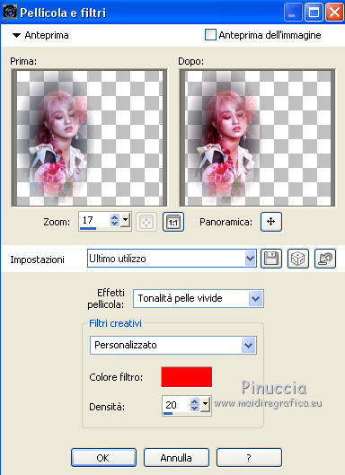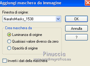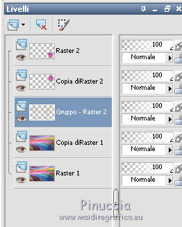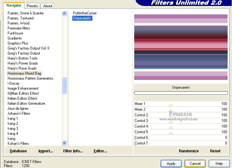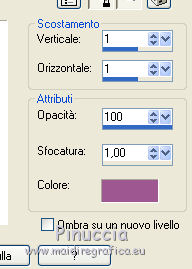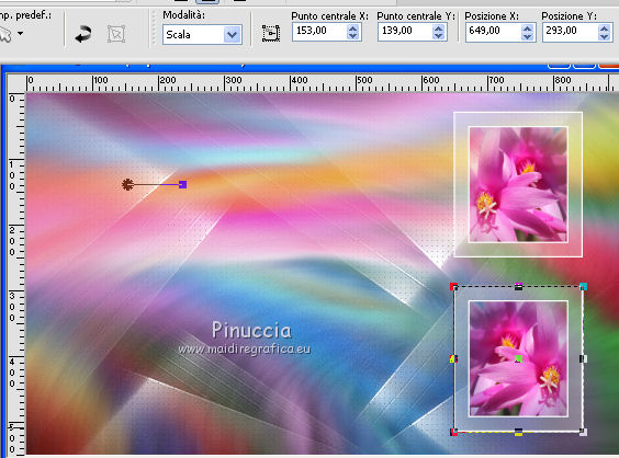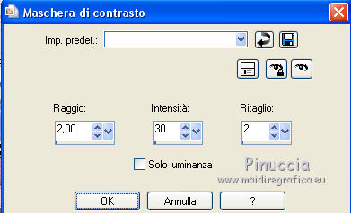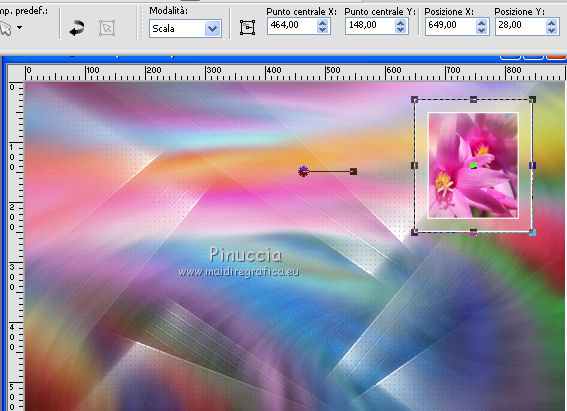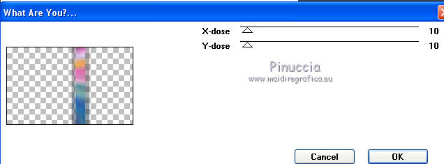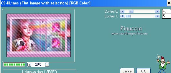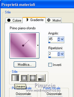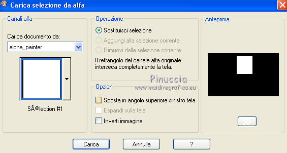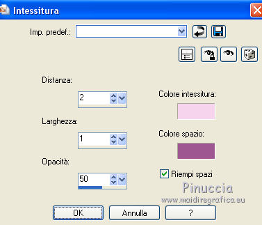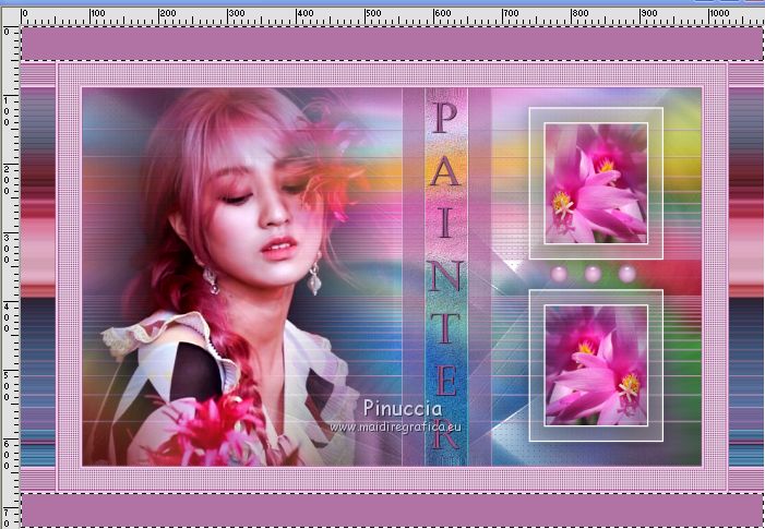 Le vostre versioniOccorrente: Materiale qui Per le maschere grazie Narah. Il resto del materiale è di Saturnella. (in questa pagina trovi i links ai siti dei creatori di tubes) Filtri in caso di dubbi, ricorda di consultare la mia sezione filtri qui Filters Unlimited 2.0 qui Horizonhaus Mixed Bag - Stripesareln qui AP 01 [Innovations] - Lines SilverLining qui Toadies - What are you qui Carolaine and Sensibility - CS-DLines qui I filtri Toadies e Horizonhaus si possono usare da soli o importati in Filters Unlimited (come fare vedi qui) Se un filtro fornito appare con questa icona ![]() non esitare a cambiare modalità di miscelatura e opacità secondo i colori utilizzati. Nelle ultime versioni di PSP non c'è il gradiente di primo piano/sfondo (Corel_06_029) Puoi usare i gradienti delle versioni precedenti. Trovi qui i gradienti Corel X. Apri le maschere in PSP e minimizzale con il resto del materiale. Imposta il colore di primo piano con il colore 3 #ffffff, e il colore di sfondo con il colore 2 #9f5891. ![]() 1. Apri alpha_painter. Finestra>Duplica o sulla tastiera maiuscola+D per fare una copia. ![]() Chiudi l'originale. La copia, che sarà la base del tuo lavoro, non è vuota, ma contiene le selezioni salvate sul canale alfa. Selezione>Seleziona tutto. Apri l'immagine "fond" e vai a Modifica>Copia. Torna al tuo lavoro e vai a Modifica>Incolla nella selezione. Selezione>Deseleziona. Livelli>Duplica. 2. Regola>Sfocatura>Sfocatura radiale. ![]() 3. Livelli>Nuovo livello raster. Riempi con il colore bianco di primo piano.Livelli>Nuovo livello maschera>Da immagine. Apri il menu sotto la finestra di origine e vedrai la lista dei files aperti. Seleziona la maschera NarahsMasks_1538. ![]() Effetti>Effetti di bordo>Aumenta di più. Livelli>Unisci>Unisci gruppo. 4. Effetti>Plugins>AP 01 [Innovations] - Lines SilverLining. ![]() 5. Effetti>Effetti 3D>Sfalsa ombra, colore bianco. ![]() 6. Livelli>Nuovo livello raster. Selezione>Carica/Salva selezione>Carica selezione da canale alfa. La selezione #1 è subito disponibile. Devi soltanto cliccare Carica. ![]() Riempi la selezione con il colore bianco di primo piano.Selezione>Modifica>Contrai - 2 pixels. Premi sulla tastiera il tasto CANC ![]() Mantieni selezionato. Abbassa l'opacità dello strumento Riempimento a 30 e riempi nuovamente la selezione con il colore bianco.Riporta l'opacità a 100. Selezione>Modifica>Contrai - 20 pixels. Premi sulla tastiera il tasto CANC. Riempi la selezione ancora con il colore bianco.Selezione>Modifica>Contrai - 2 pixels. Premi sulla tastiera il tasto CANC. Mantieni ancora selezionato. Apri il misted del fiore. Immagine>Rifletti. Cancella la firma e vai a Modifica>Copia. Torna al tuo lavoro e vai a Modifica>Incolla come nuovo livello. Immagine>Ridimensiona, al 50%, tutti i livelli non selezionato. Posiziona il tube sulla selezione.![]() Selezione>Inverti. Premi sulla tastiera il tasto CANC. Selezione>Deseleziona. Livelli>Unisci>Unisci giù. 7. Tasto K sulla tastiera per attivare lo strumento Puntatore ![]() e imposta Posizione X: 649,00 e Posizione Y: 28,00 ![]() 8. Livelli>Duplica. Immagine>Rifletti. Imposta Posizione X: 649,00 e Posizione Y: 293,00. ![]() 9. Effetti>Effetti 3D>Sfalsa ombra, colore nero. ![]() 10. Attiva il livello sottostante della cornice originale. Modifica>Ripeti Sfalsa ombra. 11. Attiva il terzo livello dal basso ![]() Imposta il colore di primo piano con il colore 1 #f6d4ed. ![]() Livelli>Nuovo livello raster. Riempi con il colore chiaro di primo piano.Livelli>Nuovo livello maschera>Da immagine. Apri il menu sotto la finestra di origine e seleziona la maschera NarahsMasks_1551 ![]() Regola>Messa a fuoco>Metti a fuoco. Livelli>Unisci>Unisci gruppo. 12. Effetti>Effetti 3D>Sfalsa ombra, colore di sfondo. ![]() 13. Attiva il livello di sfondo. Selezione>Carica/Salva selezione>Carica selezione da canale alfa. Apri il menu delle selezioni e carica la selezione #2. ![]() Selezione>Innalza selezione a livello. Livelli>Disponi>Porta in alto. Selezione>Deseleziona. 14. Effetti>Plugins>Toadies - What are you. ![]() Effetti>Effetti di bordo>Aumenta di più. 15. Effetti>Effetti 3D>Sfalsa ombra, con i settaggi precedenti. ![]() 16. Apri il tube titre e vai a Modifica>Copia. Torna al tuo lavoro e vai a Modifica>Incolla come nuovo livello. Tasto K per attivare lo strumento Puntatore ![]() e imposta Posizione X: 499,00 e Posizione Y: 21,00. ![]() 17. Effetti>Effetti 3D>Sfalsa ombra, colore nero. ![]() Livelli>Unisci>Unisci giù. 18. Apri il tube della donna e vai a Modifica>Copia. Torna al tuo lavoro e vai a Modifica>Incolla come nuovo livello. Immagine>Rifletti. Sposta il tube a sinistra.Effetti>Effetti foto>Pellicola e filtri. ![]() 19. Apri il tube deco e vai a Modifica>Copia. Torna al tuo lavoro e vai a Modifica>Incolla come nuovo livello. Spostalo tra le due cornici.![]() Effetti>Effetti 3D>Sfalsa ombra, colore nero. ![]() 20. Immagine>Aggiungi bordatura, 1 pixels, simmetriche, colore di sfondo. Immagine>Aggiungi bordatura, 3 pixels, simmetriche, colore di primo piano. Immagine>Aggiungi bordatura, 1 pixel, simmetriche, colore di sfondo. Immagine>Aggiungi bordatura, 30 pixels, simmetriche, colore bianco. 21. Attiva lo strumento Bacchetta magica ![]() e clicca nel bordo bianco per selezionarlo. Effetti>Effetti di trama>Intessitura colore intessitura: primo piano - color spazio: colore di sfondo. ![]() Selezione>Deseleziona. 22. Immagine>Aggiungi bordatura, 1 pixels, simmetriche, colore di sfondo. Immagine>Aggiungi bordatura, 3 pixels, simmetriche, colore di primo piano. Immagine>Aggiungi bordatura, 1 pixel, simmetriche, colore di sfondo. Immagine>Aggiungi bordatura, 50 pixels, simmetriche, colore bianco. 23. Attiva lo strumento Bacchetta magica ![]() e clicca nel bordo bianco per selezionarlo. Passa il colore di primo piano a Gradiente di primo piano/sfondo, stile Lineare. ![]() Riempi la selezione con il gradiente.24. Effetti>Plugins>Filters Unlimited 2.0 - Horizonaus Mixed Bag - Stripesareln, con i setta