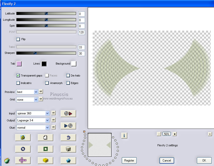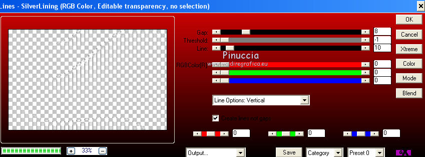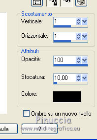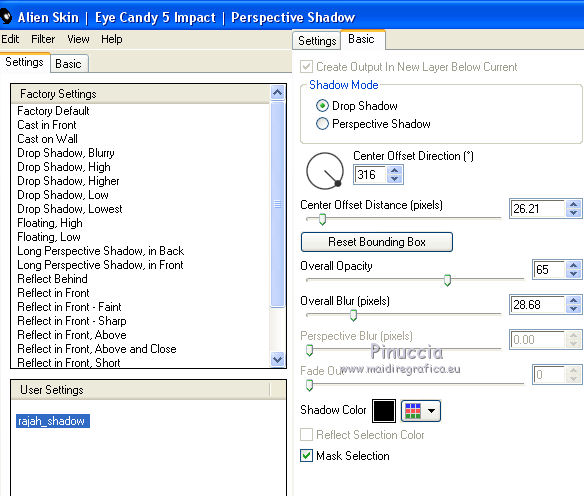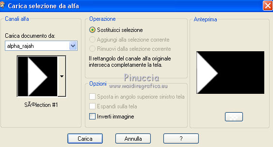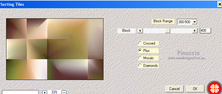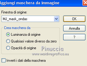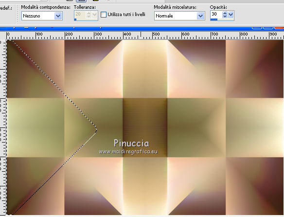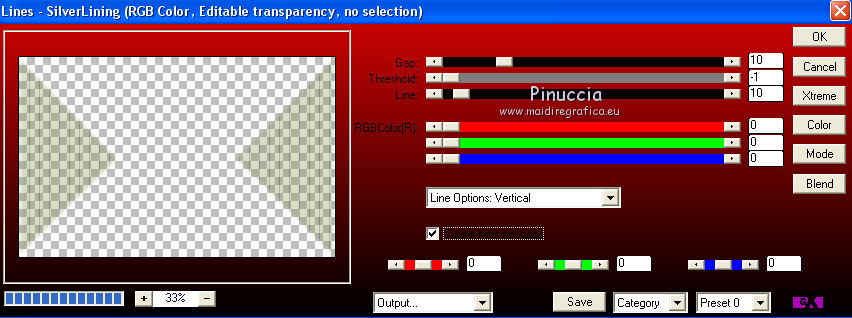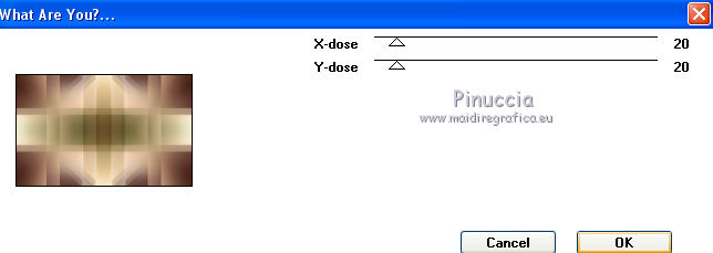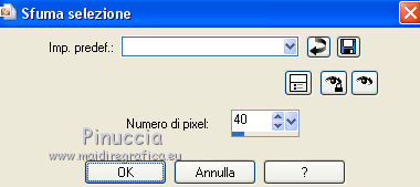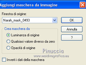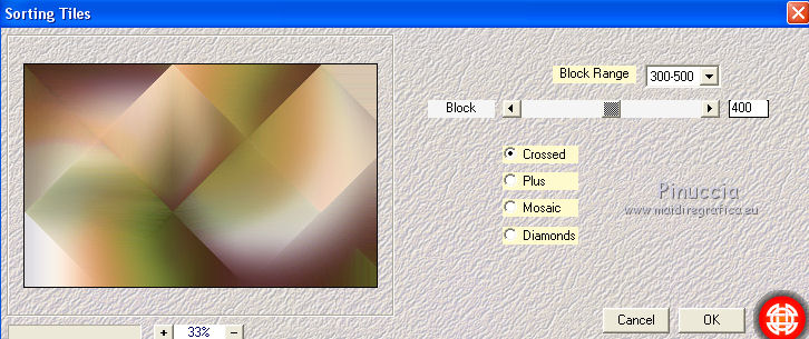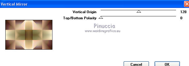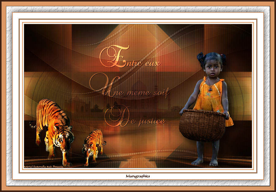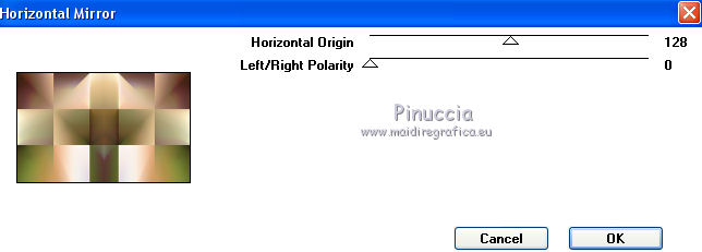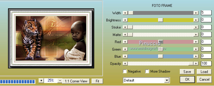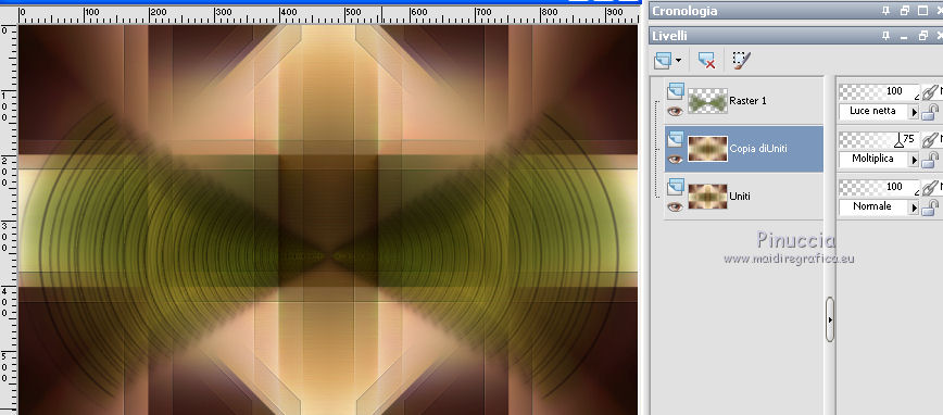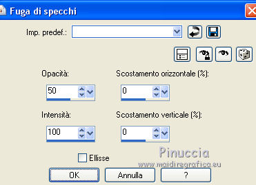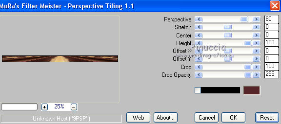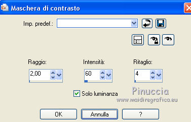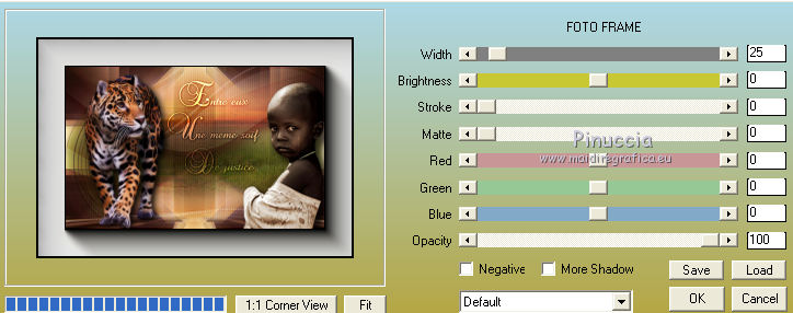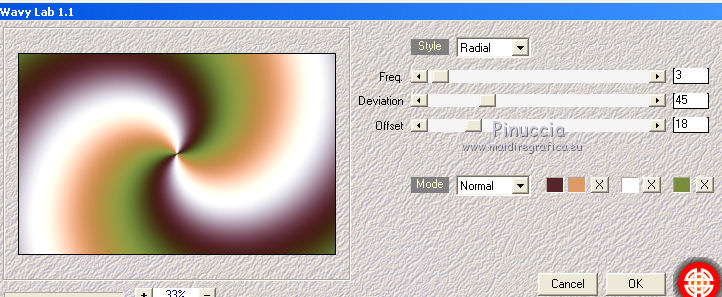 Le vostre versioniOccorrente: Materiale qui Per le maschere grazie Narah e Butterfly. Il resto del materiale è di Saturnella. (in questa pagina trovi i links ai siti dei creatori di tubes) Filtri in caso di dubbi, ricorda di consultare la mia sezione filtri qui Filters Unlimited 2.0 qui Mehdi - Sorting Tiles qui Mehdi - Wavy Lab 1.1 qui Flaming Pear - Flexify 2 qui AP 01 [Innovations] - Lines SilverLining qui Toadies - What are you qui Graphics Plus - Horizontal Mirror, Vertical Mirror qui AAA Frames - Foto Frame qui Mura's Meister - Perspective Tiling qui Alien Skin Eye Candy 5 Impact - Perspective Shadow qui I filtri Toadies e Graphics Plus si possono usare da soli o importati in Filters Unlimited (come fare vedi qui) Se un filtro fornito appare con questa icona ![]() non esitare a cambiare modalità di miscelatura e opacità secondo i colori utilizzati. Metti il preset Cliccando sul file una o due volte (a seconda delle tue impostazioni), automaticamente il preset si installerà nella cartella corretta. perchè uno o due clic vedi qui Metti la trama nella cartella Trame. Apri le maschere in PSP e minimizzale con il resto del materiale. Imposta il colore di primo piano con il colore chiaro #dd9a66, e il colore di sfondo con il colore scuro #55252a. ![]() 1. Apri alpha_rajah. Finestra>Duplica, o sulla tastiera tasto della maiuscola+D per fare una copia. ![]() Chiudi l'originale. La copia, che sarà la base del tuo lavoro, non è vuota, ma contiene le selezioni salvate sul canale alfa. Effetti>Plugins>Mehdi - Wavy Lab 1.1. Questo filtro crea gradienti con i colori della paletta: il primo è il colore di sfondo, il secondo quello di primo piano. Cambia gli ultimi due colori creati dal filtro: il terzo con il colore bianco #ffffff e il quarto con il colore #798f3c. ![]() 2. Regola>Sfocatura>Sfocatura gaussiana - raggio 40. ![]() 3. Livelli>Nuovo l ivello raster. Selezione>Seleziona tutto. Apri il tube del paesaggio e vai a Modifica>Copia. Torna al tuo lavoro e vai a Modifica>Incolla nella selezione. Selezione>Deseleziona. 4. Effetti>Effetti di immagine>Motivo unico. ![]() 5. Regola>Sfocatura>Sfocatura radiale. ![]() Effetti>Effetti di bordo>Aumenta di più - 2 volte. Livelli>Unisci>Unisci visibile. 6. Effetti>Plugins>Mehdi - Sorting Tiles. ![]() Ripeti Sorting tiles con gli stessi settaggi, ma Plus selezionato. ![]() 7. Effetti>Plugins>Graphics Plus - Horizontal Mirror, con i settaggi standard. ![]() Effetti>Plugins>Graphics Plus - Vertical Mirror, con i settaggi standard. ![]() 8. Selezione>Carica/Salva selezione>Carica selezione da canale alfa. La selezione #1 è subito disponibile. Devi soltanto cliccare Carica. ![]() Livelli>Nuovo livello raster. Imposta il colore di primo piano con il colore #798f3c. ![]() Abbassa l'opacità dello strumento Riempimento a 30. Riempi la selezione con il colore #798f3c.![]() Selezione>Deseleziona. Livelli>Duplica. Immagine>Rifletti. Livelli>Unisci>Unisci giù. 9. Effetti>Plugins>AP01 [Innovations] - Lines SilverLining. ![]() 10. Effetti>Plugins>Flaming Pear - Flexify 2. ![]() 11. Effetti>Effetti di riflesso>Fuga di specchi. ![]() Cambia la modalità di miscelatura di questo livello in Luce netta, o altro. 12. Effetti>Effetti 3D>Sfalsa ombra. ![]() Oggetti>Allinea>Inferiore, o usa lo strumento Spostamento/Puntatore /![]() ![]() 13. Attiva il livello di sfondo. Livelli>Duplica. Effetti>Plugins>Toadies - What are you, con i settaggi standard. ![]() Effetti>Effetti di bordo>Aumenta di più. Cambia la modalità di miscelatura di questo livello in Moltiplica, e abbassa l'opacità al 75%. ![]() 14. Livelli>Nuovo livello raster. Selezione>Seleziona tutto. Attiva nuovamente il tube del paesaggio e vai a Modifica>Copia. Torna al tuo lavoro e vai a Modifica>Incolla nella selezione. Selezione>Deseleziona. Livelli>Disponi>Porta in alto. Io ho ridotto l'opacità al 70%, a te decidere secondo il tuo tube. 15. Livelli>Nuovo livello raster. Riporta l'opacità dello strumento Riempimento a 100. Riempi il livello con il colore di sfondo.Livelli>Nuovo livello maschera>Da immagine. Apri il menu sotto la finestra di origine e vedrai la lista dei files aperti. Seleziona la maschera Narah_Mask_0493. ![]() Regola>Messa a fuoco>Accentua messa a fuoco. Livelli>Unisci>Unisci gruppo. Cambia la modalità di miscelatura di questo livello in Sovrapponi. Livelli>Unisci>Unisci visibile. 16. Selezione>Carica/Salva selezione>Carica selezione da canale alfa. Apri il menu delle selezioni e carica la selezione #2. ![]() Selezione>Innalza selezione a livello. Effetti>Plugins>Mura's Meister - Perspective Tiling, con i settaggi standard. ![]() Selezione>Deseleziona. 17. Attiva lo strumento Bacchetta magica ![]() clicca nella parte trasparente in alto per selezionarla. Selezione>Modifica>Sfuma - 40 pixels. ![]() Premi 3-4 volte sulla tastiera il tasto CANC ![]() Selezione>Deseleziona. 18. Apri il tube della tigre e vai a Modifica>Copia. Torna al tuo lavoro e vai a Modifica>Incolla come nuovo livello. Immagine>Rifletti. Immagine>Ridimensiona, all'80%, tutti i livelli non selezionato. Spostalo a sinistra.19. Effetti>Plugins>Alien Skin Eye Candy 4 Impact - Perspective Shadow. Seleziona il preset Drop Shadow Blurry e ok. ![]() 20. Apri il tube del ragazzo e vai a Modifica>Copia. Torna al tuo lavoro e vai a Modifica>Incolla come nuovo livello. Immagine>Ridimensiona, al 65%, tutti i livelli non selezionato. Sposta il tube a destra.21. Effetti>Plugins>Alien Skin Eye Candy 5 Impact - Perspective Shadow. Seleziona il preset rajah_shadow e ok. ![]() 22. Apri il tube texte (o scrivi il tuo) e vai a Modifica>Copia. Torna al tuo lavoro e vai a Modifica>Incolla come nuovo livello. Effetti>Effetti 3D>Sfalsa ombra. ![]() Posiziona il testo al centro.Io ho cambiato la modalità di miscelatura in Sovrapponi. 23. Attiva il livello di sfondo. Imposta il colore di primo piano con il colore bianco. Livelli>Nuovo livello raster. Riempi il livello con il colore bianco.Livelli>Nuovo livello maschera>Da immagine. Apri il