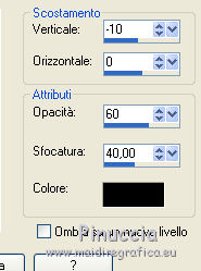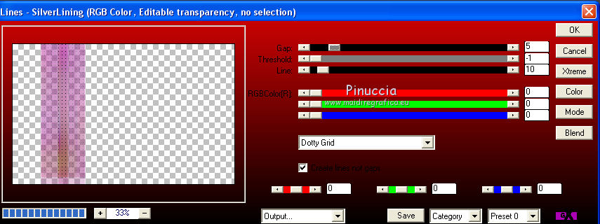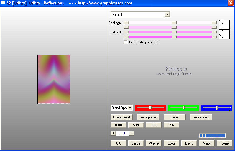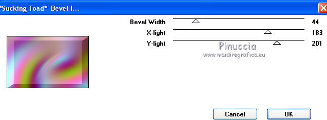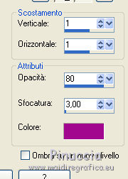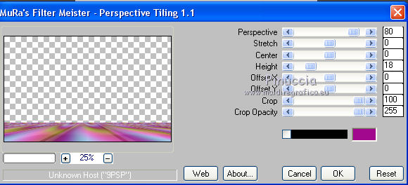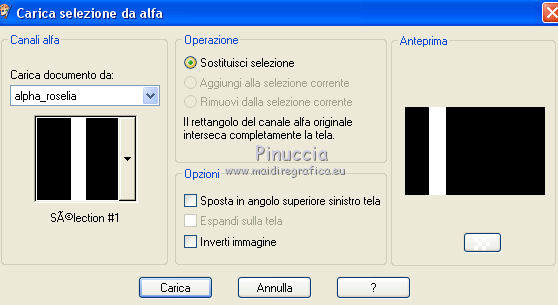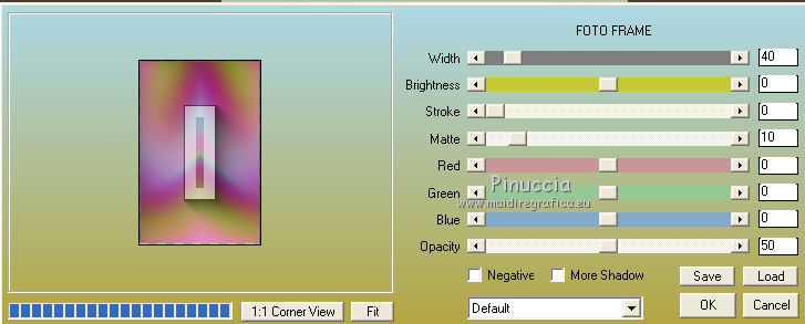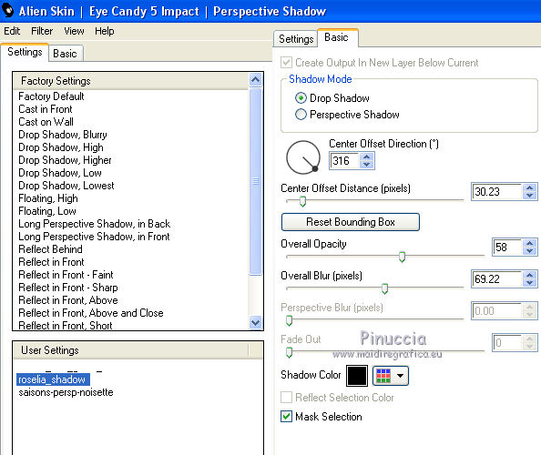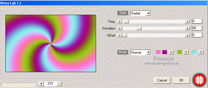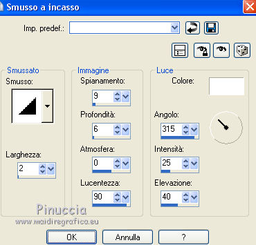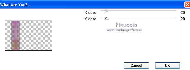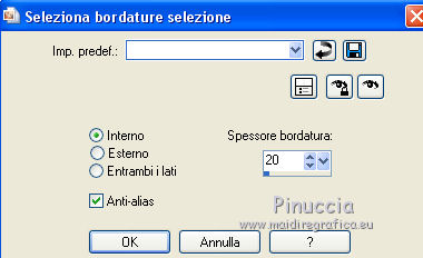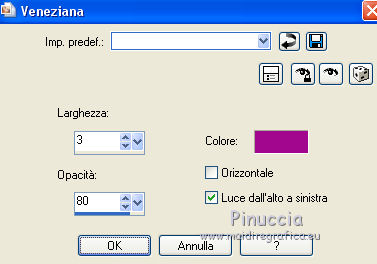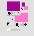 Le vostre versioniOccorrente: Materiale qui Il materiale è di Saturnella. (in questa pagina trovi i links ai siti dei creatori di tubes) Filtri in caso di dubbi, ricorda di consultare la mia sezione filtri qui Filters Unlimited 2.0 qui Toadies - What are you, Sucking Toad Bevel I qui Mehdi - Wavy Lab 1.1. qui AP 01 [Innovations] - Lines SilverLining qui Alien Skin Eye Candy 5 Impact - Perspective Shadow qui Mura's Meister - Perspective Tiling qui AP Utility - Reflections qui AAA Frames - Foto Frame qui I filtri Toadies si possono usare da soli o importati in Filters Unlimited (come fare vedi qui) Se un filtro fornito appare con questa icona ![]() non esitare a cambiare modalità di miscelatura e opacità secondo i colori utilizzati. Imposta il colore di primo piano con #a2088e, e il colore di sfondo con #ff75c8. ![]() 1. Apri alpha_roselia. Finestra>Duplica o sulla tastiera maiuscola+D per fare una copia. ![]() Chiudi l'originale. La copia, che sarà la base del tuo lavoro, non è vuota, ma contiene le selezioni salvate sul canale alfa. 2. Effetti>Plugins>Mehdi - Wavy Lab 1.1. Questo filtro crea gradienti con i colori della paletta: il primo è il colore di sfondo, il secondo quello di primo piano. Cambia gli ultimi due colori creati dal filtro: il terzo con il colore 3 #8dbf12 e il quarto con il colore 5 #83e6e7. ![]() 3. Regola>Sfocatura>Sfocatura radiale. ![]() 4. Effetti>Plugins>Toadies - Sucking Toad Bevel I, con i settaggi standard. ![]() 5. Livelli>Duplica. Immagine>Ridimensiona, all'80%, tutti i livelli non selezionato. Immagine>Ruota per gradi - 90 gradi a sinistra. ![]() 6. Attiva il livello di sfondo. Selezione>Seleziona tutto. Attiva il livello superiore. Immagine>Ritaglia la selezione. Effetti>Effetti di immagine>Motivo unico ![]() 7. Effetti>Effetti 3D>Sfalsa ombra, colore di primo piano. ![]() Livelli>Unisci>Unisci giù. 8. Selezione>Carica/Salva selezione>Carica selezione da canale alfa. La selezione #1 è subito disponibile. Devi soltanto cliccare Carica. ![]() Selezione>Innalza selezione a livello. Selezione>Deseleziona. 9. Importante per il prossimo filtro: Inverti i colori della paletta, per avere il colore 1 come colore di sfondo. ![]() Effetti>Plugins>Toadies - What are you, con i settaggi standard. ![]() Effetti>Effetti di bordo>Aumenta. 10. Effetti>Plugins>AP 01 [Innovations] - Lines SilverLining. ![]() 11. Livelli>Duplica. Immagine>Rifletti. Livelli>Unisci>Unisci giù. 12. Effetti>Effetti 3D>Sfalsa ombra, con i settaggi precedenti. 13. Attiva il livello di sfondo. Selezione>Carica/Salva selezione>Carica selezione da canale alfa. Apri il menu delle selezioni e carica la selezione #2. ![]() Selezione>Innalza selezione a livello. Effetti>Plugins>AP Utility - Reflections. ![]() 14. Effetti>Plugins>AAA Frames - Foto Frame. ![]() 15. Selezione>Modifica>Seleziona bordature selezione. ![]() Effetti>Effetti di trama>Veneziana, colore scuro. ![]() 16. Effetti>Effetti 3D>Smusso a incasso ![]() Selezione>Deseleziona. 17. Effetti>Effetti 3D>Sfalsa ombra, colore nero. ![]() 19. Attiva il livello superiore. Apri il tube deco e vai a Modifica>Copia. Torna al tuo lavoro e vai a Modifica>Incolla come nuovo livello. Tasto K sulla tastiera per attivare lo strumento Puntatore ![]() mantieni Posizione X: 198,00 e imposta Posizione Y: 1,00 ![]() Tasto M per deselezionare lo strumento. 19. Effetti>Effetti 3D>Sfalsa ombra, colore nero. ![]() 20. Attiva il livello di sfondo. Livelli>Duplica. Livelli>Disponi>Porta in alto. Effetti>Plugins>Mura's Meister - Perspective Tiling. ![]() 21. Attiva lo strumento Bacchetta magica , sfumatura 20,e clicca nella parte trasparente per selezionarla. Premi 6-7 volte CANC sulla tastiera ![]() Selezione>Deseleziona. 22. Effetti>Effetti 3D>Sfalsa ombra, colore nero. ![]() 23. Apri il tube sat_fleur08 e vai a Modifica>Copia. Torna al tuo lavoro e vai a Modifica>Incolla come nuovo livello. Immagine>Ridimensiona, al 40%, tutti i livelli non selezionato. 24. Livelli>Duplica. Attiva il livello sottostante dell'originale. Regola>Sfocatura>Sfocatura gaussiana - raggio 30 ![]() Io ho cambiato la modalità di miscelatura di questo livello in Filtra. 25. Attiva il livello superiore. Apri il tube sat_per01 e vai a Modifica>Copia. Torna al tuo lavoro e vai a Modifica>Incolla come nuovo livello. Immagine>Ridimensiona, al 60%, tutti i livelli non selezionato. Regola>Messa a fuoco>Metti a fuoco. Sposta il tube a destra.26. Effetti>Plugins>Alien Skin Eye Candy 5 Impact - Perspective Shadow seleziona il preset roselia_shadow e ok. ![]() 27. Apri il tube sat_ani07 e vai a Modifica>Copia. Torna al tuo lavoro e vai a Modifica>Incolla come nuovo livello. Immagine>Ridimensiona, al 60%, tutti i livelli non selezionato. Spostalo in basso a sinistra.Effetti>Plugins>Alien Skin Eye Candy 5 Impact - Perspective Shadow, con i settaggi precedenti. 28. Firma il tuo lavoro su un nuovo livello. 29. Livelli>Unisci>Unisci visibile. Modifica>Copia. 30. Apri il tube cadre. Attiva lo strumento Bacchetta magica ![]() (non dimenticare di riportare la sfumatura a 0) clicca nella parte trasparente per selezionarla. Selezione>Modifica>Espandi - 5 pixels. Modifica>Incolla nella selezione. Selezione>Deseleziona. 31. Immagine>Aggiungi bordatura, 1 pixel, simmetriche, colore nero. 32. Immagine>Ridimensiona, 950 pixels di larghezza, tutti i livelli selezionato. Salva in formato jpg. Versione con tubes di Tineke e Silvie ![]() Le vostre versioniGrazie ![]() Marygraphics ![]() Olimpia ![]() Puoi scrivermi per qualsiasi problema, o dubbio, se trovi un link che non funziona, o anche soltanto per un saluto. 9 Novembre 2020 |
