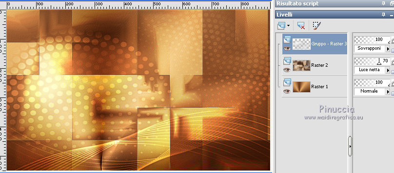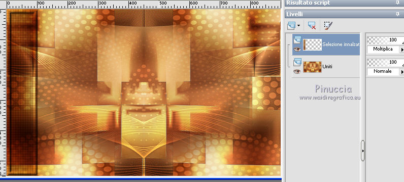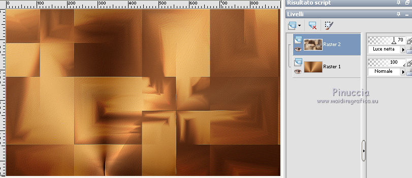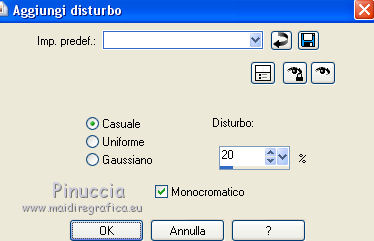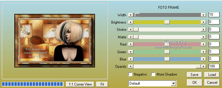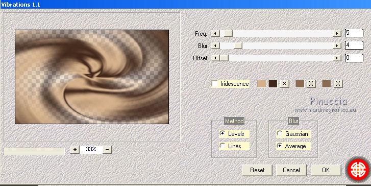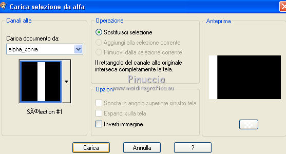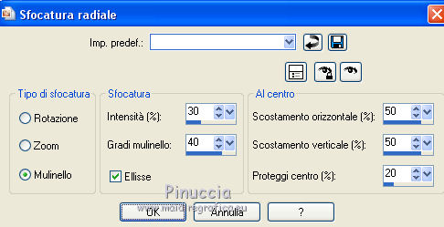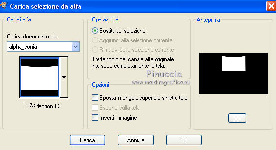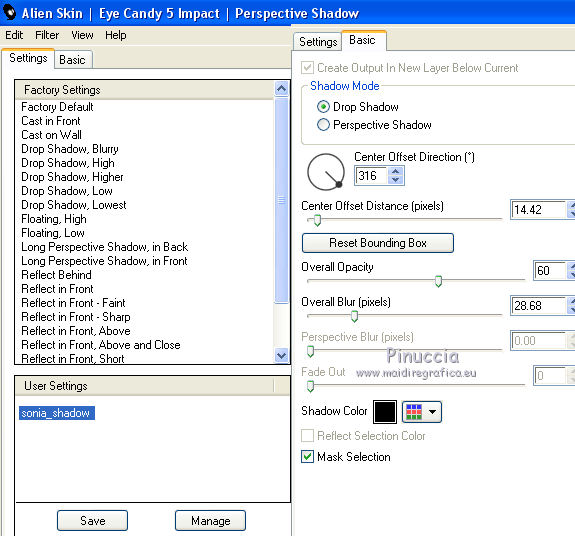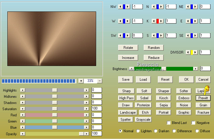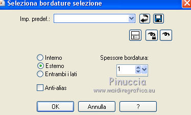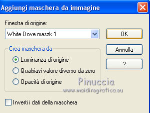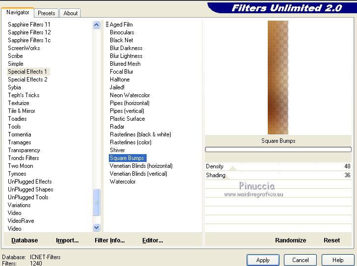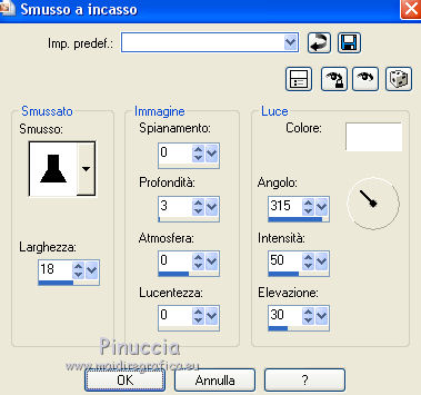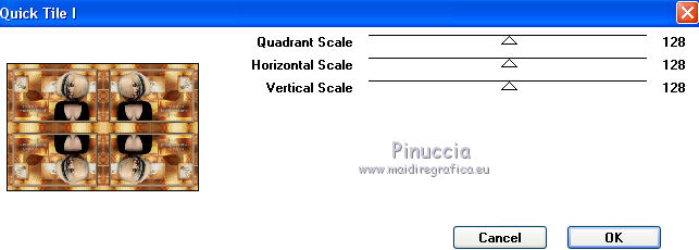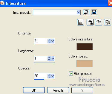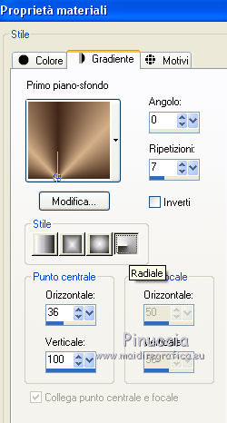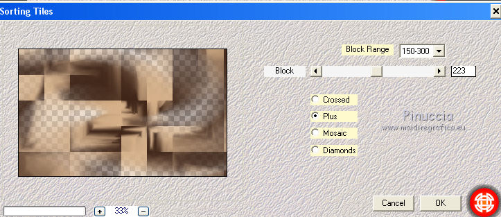 Occorrente: Materiale qui Grazie Lily e Anna.br per i tube e Yoka per il wordart. La maschera viene da Internet (in questa pagina trovi i links ai siti dei creatori di tubes) Filtri in caso di dubbi, ricorda di consultare la mia sezione filtri qui Filters Unlimited 2.0 qui Graphics Plus - Vertical Mirror, Quick Tile I qui Flaming Pear - Make cube tile qui Flaming Pear - Flexify 2 qui Alien Skin Eye Candy 5 Impact - Perspective Shadow qui Mehdi - Sorting Tiles qui Mehdi - Vibrations 1.1 qui FM Tile Tools - Saturation Emboss qui Plugin Galaxy - Instant Mirror qui AAA Filters - Custom / AAA Frames - Foto Frame qui I filtri Graphics Plus si possono usare da soli o importati in Filters Unlimited (come fare vedi qui) Se un filtro fornito appare con questa icona ![]() non esitare a cambiare modalità di miscelatura e opacità secondo i colori utilizzati. Nelle ultime versioni di PSP non c'è il gradiente di primo piano/sfondo (Corel_06_029) Puoi usare i gradienti delle versioni precedenti. Trovi qui i gradienti Corel X. Metti il preset Cliccando sul file una o due volte (a seconda delle tue impostazioni), automaticamente il preset si installerà nella cartella corretta. perchè uno o due clic vedi qui Apri la maschera in PSP e minimizzala con il resto del materiale. 1. Imposta il colore di primo piano con il colore scuro #412719, e il colore di sfondo con il colore chiaro #d5b089. ![]() Passa il colore di primo piano a Gradiente di primo piano/sfondo, stile Radiale. ![]() 2. Apri alpha_sonia. Finestra>Duplica, o sulla tastiera tasto della maiuscola+D per fare una copia. ![]() Chiudi l'originale. La copia, che sarà la base del tuo lavoro, non è vuota, ma contiene le selezioni salvate sul canale alfa. Rinomina il livello Raster 1. Riempi l'immagine trasparente con il gradiente.2. Regola>Sfocatura>Sfocatura radiale. ![]() Effetti>Effetti di bordo>Aumenta di più. 3. Effetti>Plugins>AAA Filters - Custom - clicca su Prewitt e ok. ![]() 4. Effetti>Plugins>FM Tile Tools - Saturation Emboss, con i settaggi standard. ![]() 5. Livelli>Nuovo livello raster. Selezione>Seleziona tutto. Apri il tube della donna, cancella il watermark e vai a Modifica>Copia. Minimizza il tube. Torna al tuo lavoro e vai a Modifica>Incolla nella selezione. Selezione>Deseleziona. 6. Effetti>Effetti di immagine>Motivo unico, con i settaggi standard. ![]() 7. Regola>Sfocatura>Sfocatura radiale. ![]() 8. Effetti>Plugins>Mehdi - Vibrations 1.1. ![]() 9. Effetti>Plugins>Mehdi - Sorting Tiles. ![]() Effetti>Effetti di bordo>Aumenta. Cambia la modalità di miscelatura di questo livello in Luce netta, e abbassa l'opacità al 70%. ![]() 10. Imposta il colore di sfondo con il colore bianco #ffffff. Livelli>Nuovo livello raster. Riempi il livello con il colore bianco.Livelli>Nuovo livello maschera>Da immagine. Apri il menu sotto la finestra di origine e vedrai la lista dei files aperti. Seleziona la maschera White Dove mazsk 1 ![]() Regola>Messa a fuoco>Metti a fuoco. Livelli>Unisci>Unisci gruppo. Effetti>Effetti 3D>Sfalsa ombra, colore nero. ![]() Cambia la modalità di miscelatura di questo livello in Sovrapponi. ![]() Livelli>Unisci>Unisci visibile. 11. Livelli>Duplica. Immagine>Ridimensiona, all'85%, tutti i livelli non selezionato. Immagine>Rifletti. 12. Effetti>Plugins>Flaming Pear - Make cube tile Questo effetto lavora senza finestre; risultato: ![]() Effetti>Effetti di immagine>Motivo unico, con i settaggi precedenti. ![]() Livelli>Unisci>Unisci visibile. 13. Effetti>Plugins>Plugin Galaxy - Instant Mirror. ![]() Regola>Messa a fuoco>Metti a fuoco. 14. Selezione>Carica/Salva selezione>Carica selezione da canale alfa. La selezione #1 è subito disponibile. Devi soltanto cliccare Carica. ![]() Selezione>Innalza selezione a livello. Regola>Sfocatura>Sfocatura gaussiana - raggio 50. ![]() Mantieni selezionato. Effetti>Plugins>Filters Unlimited 2.0 - Special Effects 1 - Square bumps, con i settaggi standard. ![]() Mantieni ancora selezionato. Effetti>Effetti 3D>Smusso a incasso. ![]() Selezione>Deseleziona. Cambia la modalità di miscelatura di questo livello in Moltiplica. ![]() 15. Effetti>Plugins>Flaming Pear - Flexify 2. ![]() Livelli>Duplica. Immagine>Rifletti. Livelli>Unisci>Unisci giù. 16. Effetti>Effetti 3D>Sfalsa ombra, con i settaggi precedenti. 17. Attiva il livello di sfondo. Selezione>Carica/Salva selezione>Carica selezione da canale alfa. Apri il menu delle selezioni e carica la selezione #2. ![]() Regola>Aggiungi/Rimuovi disturbo>Aggiungi disturbo. ![]() Selezione>Innalza selezione a livello. 18. Selezione>Modifica>Seleziona bordature selezione. ![]() Livelli>Nuovo livello raster. Passa il colore di primo piano a Colore. Riempi la selezione con il colore scuro di primo piano.Selezione>Deseleziona. Livelli>Unisci>Unisci giù. 19. Apri il tube deco di Anna.br e vai a Modifica>Copia. Torna al tuo lavoro e vai a Modifica>Incolla come nuovo livello. Immagine>Ridimensiona, al 65%, tutti i livelli non selezionato. Posiziona il tube nel rettangolo.Livelli>Unisci>Unisci giù. 20. Effetti>Effetti di immagine>Motivo unico. ![]() 21. Effetti>Effetti 3D>Sfalsa ombra, con i settaggi precedenti. 22. Attiva nuovamente il tube della donna e vai a Modifica>Copia. Torna al tuo lavoro e vai a Modifica>Incolla come nuovo livello. Immagine 23. Effetti>Plugins>Alien Skin Eye Candy 5 Impact - Perspective Shadow, seleziona il preset sonia_shadow e ok. ![]() Sposta il tube un po' più a destra.24. Apri il wordart di Yoka e vai a Modifica>Copia. Torna al tuo lavoro e vai a Modifica>Incolla come nuovo livello. Immagine>Ridimensiona, al 60%, tutti i livelli non selezionato. Immagine>Immagine negativa. Sposta il wordart in basso a sinistra.25. Effetti>Effetti 3D>Sfalsa ombra, colore nero. ![]() 26. Attiva il livello di sfondo. Modifica>Copia. Per i bordi, imposta nuovamente il colore di sfondo con il colore chiaro. ![]() Immagine>Aggiungi bordatura, 1 pixel, simmetriche, colore di primo piano. Immagine>Aggiungi bordatura, 3 pixels, simmetriche, colo