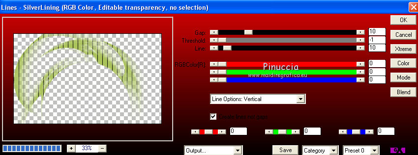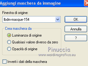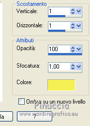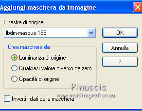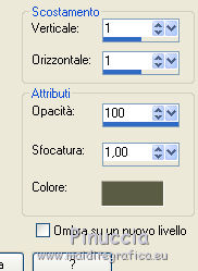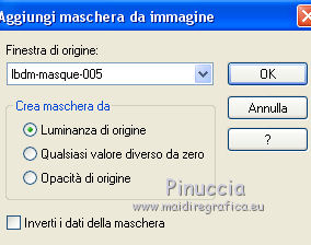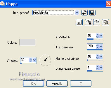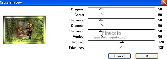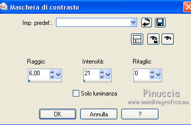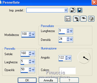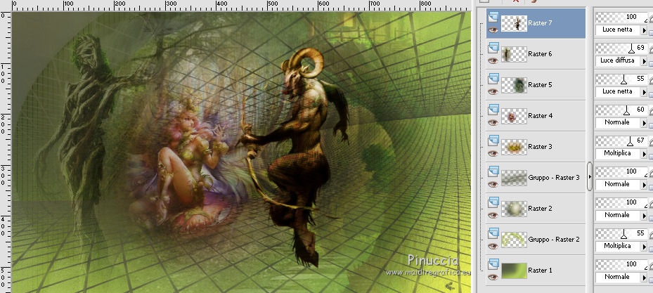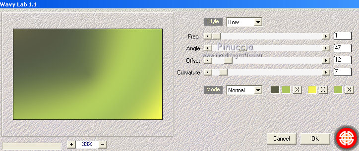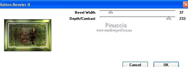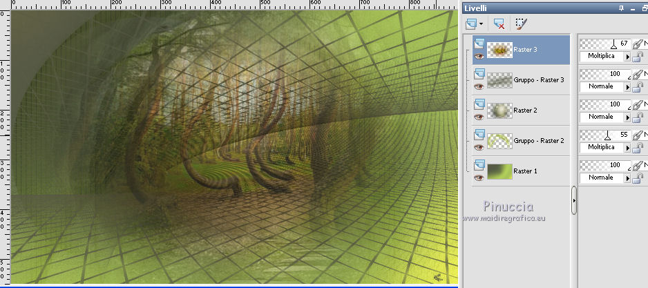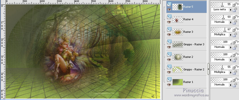 Le vostre versioniOccorrente: Materiale qui Per le maschere grazie Mary LBDM. Il resto del materiale è di Saturnella. (in questa pagina trovi i links ai siti dei creatori di tubes) Filtri in caso di dubbi, ricorda di consultare la mia sezione filtri qui Filters Unlimited 2.0 qui Mehdi - Wavy Lab qui AP 01 [Innovations] - Lines SilverLining qui Graphics Plus - Cross Shadow, Button Beveler II qui I filtri Graphics Plus si possono usare da soli o importati in Filters Unlimited (come fare vedi qui) Se un filtro fornito appare con questa icona ![]() non esitare a cambiare modalità di miscelatura e opacità secondo i colori utilizzati. Apri le maschere in PSP e minimizzale con il resto del materiale. Colori utilizzati ![]() Imposta il colore di primo piano con il colore 1 #abc45a, e il colore di sfondo con il colore 2 #5a5c45. ![]() 2. Apri una nuova immagine trasparente 900 x 550 pixels. Effetti>Plugins>Mehdi - Wavy Lab 1.1. Questo filtro crea gradienti con i colori della paletta: il primo è il colore di sfondo, il secondo quello di primo piano; cambia gli ultimi due colori creati dal filtro: il terzo con il colore 3 #f4f155 e il quarto con il colore 1 #abc45a. ![]() 2. Regola>Sfocatura>Sfocatura gaussiana - raggio 15. ![]() 3. Effetti>Effetti tecniche di disegno>Pennellate, colore bianco. ![]() Regola>Messa a fuoco>Metti a fuoco. 4. Livelli>Nuovo livello raster. Riempi con il colore di primo piano.Livelli>Nuovo livello maschera>Da immagine. Apri il menu sotto la finestra di origine e vedrai la lista dei files aperti. Seleziona la maschera lbdm-masque-154. ![]() Livelli>Unisci>Unisci gruppo. 5. Effetti>Plugins>AP 01 [Innovations] - Lines SilverLining. ![]() Cambia la modalità di miscelatura di questo livello in Moltiplica, e abbassa l'opacità al 55%. Effetti>Effetti 3D>Sfalsa ombra, colore 3 #f4f155. ![]() 5. Apri il tube foret10 e vai a Modifica>Copia. Torna al tuo lavoro e vai a Modifica>Incolla come nuovo livello. Non spostarlo. 6. Livelli>Nuovo livello raster. Riempi con il colore di sfondo.Livelli>Nuovo livello maschera>Da immagine. Apri il menu sotto la finestra di origine e seleziona la maschera lbdm-masque-005. ![]() Effetti>Effetti di bordo>Aumenta. Livelli>Unisci>Unisci gruppo. Effetti>Effetti 3D>Sfalsa ombra, colore di sfondo. ![]() 7. Apri il tube foret11 e vai a Modifica>Copia. Torna al tuo lavoro e vai a Modifica>Incolla come nuovo livello. Non spostarlo. Cambia la modalità di miscelatura di questo livello in Moltiplica, e abbassa l'opacità al 67%. ![]() 8. Apri il tube fée_7 e vai a Modifica>Copia. Torna al tuo lavoro e vai a Modifica>Incolla come nuovo livello. Immagine>Ridimensiona, al 50%, tutti i livelli non selezionato. Sposta il tube un po' più a sinistra e in basso.Abbassa l'opacità di questo livello al 60%. 9. Apri il tube foret9 e vai a Modifica>Copia. Torna al tuo lavoro e vai a Modifica>Incolla come nuovo livello. Spostalo a destra.Cambia la modalità di miscelatura di questo livello in Luce netta, e abbassa l'opacità al 55%. ![]() 10. Apri il tube arb_03 e vai a Modifica>Copia. Torna al tuo lavoro e vai a Modifica>Incolla come nuovo livello. Immagine>Ridimensiona, all'80%, tutti i livelli non selezionato. Sposta il tube a sinistra.Cambia la modalità di miscelatura di questo livello in Luce diffusa, e abbassa l'opacità al 69%. 11. Apri il tube sat_sat02 e vai a Modifica>Copia. Torna al tuo lavoro e vai a Modifica>Incolla come nuovo livello. Immagine>Ridimensiona, al 50%, tutti i livelli non selezionato. Immagine>Rifletti. Sposta il tube Cambia la modalità di miscelatura di questo livello in Luce netta. ![]() 12. Livelli>Nuovo livello raster. Riempi con il colore di sfondo.Livelli>Nuovo livello maschera>Da immagine. Apri il menu sotto la finestra di origine e seleziona la maschera lbdm-masque-198. ![]() Effetti>Effetti di bordo>Aumenta. Livelli>Unisci>Unisci gruppo. Cambia la modalità di miscelatura di questo livello in Moltiplica. Effetti>Effetti 3D>Sfalsa ombra, con i settaggi precedenti. ![]() 13. Attiva il livello di sfondo. Effetti>Effetti di trama>Nappa. ![]() 14. Immagine>Aggiungi bordatura, 2 pixels, simmetriche, colore di primo piano. Immagine>Aggiungi bordatura, 4 pixels, simmetriche, colore di sfondo. Immagine>Aggiungi bordatura, 2 pixels, simmetriche, colore di primo piano. Immagine>Aggiungi bordatura, 10 pixels, simmetriche, colore bianco. Immagine>Aggiungi bordatura, 2 pixels, simmetriche, colore di sfondo. Immagine>Aggiungi bordatura, 1 pixel , simmetriche, colore 3. Immagine>Aggiungi bordatura, 1 pixel, simmetriche, colore di primo piano. 15. Selezione>Seleziona tutto. Immagine>Aggiungi bordatura, 25 pixels, simmetriche, colore bianco. Selezione>Inverti. Effetti>Plugins>Mehdi - Wavy Lab 1.1., con i settaggi precedenti. ![]() 16. Effetti>Plugins>Graphics Plus - Cross Shadow, con i settaggi standard ![]() 17. Selezione>Inverti. Effetti>Effetti 3D>Sfalsa ombra, colore nero. ![]() Selezione>Deseleziona. 18. Immagine>Aggiungi bordatura, 2 pixels, simmetriche, colore 3. Immagine>Aggiungi bordatura, 4 pixels, simmetriche, colore di sfondo. Immagine>Aggiungi bordatura, 2 pixels, simmetriche, colore di primo piano. 19. Selezione>Seleziona tutto. Immagine>Aggiungi bordatura, 50 pixels, simmetriche, colore bianco. 20. Selezione>Inverti. Effetti>Plugins>Mehdi - Wavy Lab 1.1., con i settaggi precedenti. 21. Effetti>Plugins>Graphics Plus - Cross Shadow, con i settaggi standard. 22. Effetti>Plugins>Graphics Plus - Button Beveler II, con i settaggi standard. ![]() 23. Effetti>Effetti di trama>Veneziana. ![]() 24. Selezione>Inverti. Effetti>Effetti 3D>Sfalsa ombra, con i settaggi precedenti. ![]() Modifica>Ripeti Sfalsa ombra. Selezione>Deseleziona. 25. Apri il tube deco e vai a Modifica>Copia. Torna al tuo lavoro e vai a Modifica>Incolla come nuovo livello. Posizionalo correttamente sul bordo.Firma il tuo lavoro su un nuovo livello. Immagine>Aggiungi bordatura, 1 pixel , simmetriche, colore nero. Immagine>Ridimensiona, 900 pixels di larghezza, tutti i l