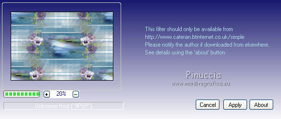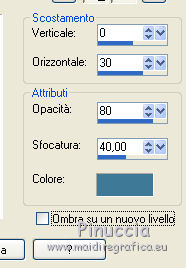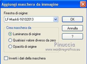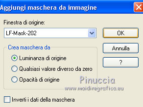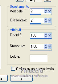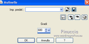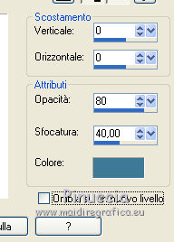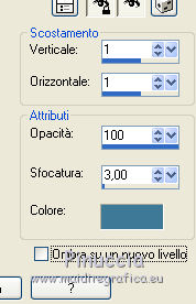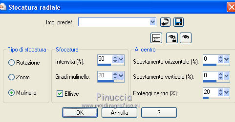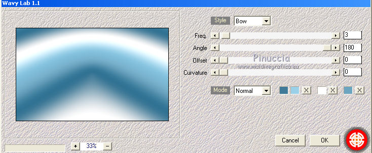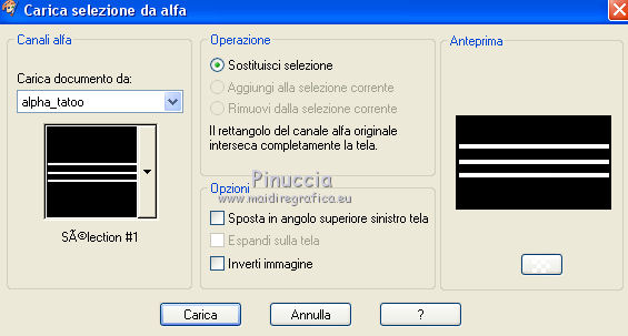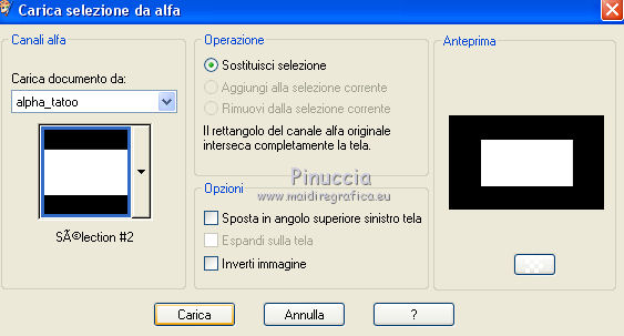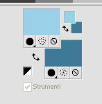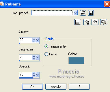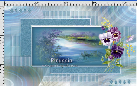 Occorrente: Materiale qui Grazie: per i tube Odette, kTs e Kat, per le maschere Linda Ferdinand Il resto del materiale è di Saturnella. (in questa pagina trovi i links ai siti dei creatori di tubes) Filtri in caso di dubbi, ricorda di consultare la mia sezione filtri qui Filters Unlimited 2.0 qui AP 01 Innovations - Lines SilverLining qui Mehdi - Wavy Lab 1.1. qui Simple - Quick Tile qui I filtri Simple si possono usare da soli o importati in Filters Unlimited (come fare vedi qui) Se un filtro fornito appare con questa icona ![]() non esitare a cambiare modalità di miscelatura e opacità secondo i colori utilizzati. Nelle ultime versioni di PSP non c'è il gradiente di primo piano/sfondo (Corel_06_029) Puoi usare i gradienti delle versioni precedenti. Trovi qui i gradienti Corel X. Apri le maschere in PSP e minimizzale con il resto del materiale Attenzione: non dimenticare di togliere la firma prima di copiare i tubes. 1. Imposta il colore di primo piano con il colore #9ad0e8, e il colore di sfondo con il colore #3f7a98 ![]() Apri alpha_tatoo. Finestra>Duplica, o sulla tastiera tasto della maiuscola+D per fare una copia. ![]() Chiudi l'originale. La copia, che sarà la base del tuo lavoro, non è vuota, ma contiene le selezioni salvate sul canale alfa. Rinomina il livello Raster 1. 2. Effetti>Plugins>Mehdi - Wavy Lab questo filtro lavora con i colori della paletta: il primo è il colore di sfondo, il secondo quello di primo piano; degli altri due colori creati dal filtro, cambia il terzo con il colore bianco #ffffff. ![]() 3. Regola>Sfocatura>Sfocatura gaussiana - raggio 20. ![]() 4. Livelli>Nuovo livello raster. Selezione>Seleziona tutto. Apri il tube del paesaggio di kTs e vai a Modifica>Copia. Torna al tuo lavoro e vai a Modifica>Incolla nella selezione. Selezione>Deseleziona. 5. Effetti>Effetti di immagine>Motivo unico. ![]() 6. Regola>Sfocatura>Sfocatura radiale. ![]() Effetti>Effetti di bordo>Aumenta di più. Livelli>Unisci>Unisci giù. 7. Selezione>Carica/Salva selezione>Carica selezione da canale alfa. La selezione sélection#1 è subito disponibile. Devi soltanto cliccare Carica. ![]() Selezione>Innalza selezione a livello. Selezione>Deseleziona. Effetti>Effetti di distorsione>Mulinello. ![]() Effetti>Effetti di immagine>Motivo unico, con i settaggi precedenti. Cambia la modalità di miscelatura di questolivello in Sovrapponi, e abbassa l'opacità al 70%. ![]() 8. Livelli>Nuovo livello raster. Riempi il livello con il colore di sfondo.Livelli>Nuovo livello maschera>Da immagine. Apri il menu sotto la finestra di origine e vedrai la lista dei files aperti. Seleziona la maschera LF-Mask 6. ![]() Livelli>Duplica. Livelli>Unisci>Unisci gruppo. Effetti>Effetti 3D>Sfalsa ombra, colore bianco. ![]() 10. Selezione>Carica/Salva selezione>Carica selezione da canale alfa. Apri il menu delle selezioni e carica sélection#2. ![]() Imposta il colore di primo piano con il colore bianco #ffffff. Riempi il livello con il colore bianco.Selezione>Modifica>Contrai - 5 pixels. Premi sulla tastiera il tasto CANC ![]() Modifica>Incolla nella selezione (il tube del paesaggio è sempre in memoria). 11. Nuovo livello raster. Effetti>Effetti 3D>Ritaglio. ![]() Selezione>Deseleziona. Livelli>Unisci>Unisci giù - 2 volte. 12. Apri il tube deco_tatoo e vai a Modifica>Copia. Torna al tuo lavoro e vai a Modifica>Incolla come nuovo livello. Tasto K sulla tastiera per attivare lo strumento Puntatore ![]() e imposta Posizione X: 29,00 e Posizione Y: 11,00. ![]() Tasto M per deselezionare lo strumento. 13. Effetti>Effetti 3D>Sfalsa ombra, colore di sfondo. ![]() 14. Livelli>Duplica. Immagine>Rifletti. Immagine>Capovolgi. 15. Attiva il livello di sfondo. Livelli>Nuovo livello raster. Riempi il livello con il colore bianco.Livelli>Nuovo livello maschera>Da immagine. Apri il menu sotto la finestra di origine e seleziona la maschera LF-Mask-202. ![]() Effetti>Effetti di bordo>Aumenta. Livelli>Unisci>Unisci gruppo. 16. Effetti>Plugins>AP 01 Innovations - Lines SilverLining. ![]() 17. Attiva il livello superiore. Apri il tube del fiore KKat40 e vai a Modifica>Copia. Torna al tuo lavoro e vai a Modifica>Incolla come nuovo livello. Immagine>Ridimensiona, al 55%, tutti i livelli non selezionato. Regola>Messa a fuoco>Metti a fuoco. Sposta il tube a destra.![]() 18. Livelli>Duplica. Immagine>Rifletti. Livelli>Unisci>Unisci giù. 19. Effetti>Effetti 3D>Sfalsa ombra. ![]() 20. Imposta nuovamente il colore di primo piano con il colore iniziale. ![]() Attiva il livello inferiore. Modifica>Copia. Immagine>Aggiungi bordatura, 1 pixel, simmetriche, colore di sfondo. Immagine>Aggiungi bordatura, 3 pixels, simmetriche, colore di primo piano. Immagine>Aggiungi bordatura, 1 pixel, simmetriche, colore di sfondo. Immagine>Aggiungi bordatura, 25 pixels, simmetriche, colore bianco. Immagine>Aggiungi bordatura, 1 pixel, simmetriche, colore di sfondo. Immagine>Aggiungi bordatura, 3 pixels, simmetriche, colore di primo piano. Immagine>Aggiungi bordatura, 1 pixel, simmetriche, colore di sfondo. Immagine>Aggiungi bordatura, 40 pixels, simmetriche, colore bianco. Attiva lo strumento Bacchetta magica ![]() e clicca nel bordo di 40 pixels per selezionarlo. Effetti>Effetti 3D>Sfalsa ombra, colore di sfondo. ![]() 21. Modifica>Incolla nella selezione (l'immagine copiata al punto precedente). 22. Effetti>Plugins>Simple - Quick Tile. ![]() 23. Effetti>Effetti 3D>Pulsante. ![]() Selezione>Deseleziona. 24. Apri il tube della donna di Odette e vai a Modifica>Copia. Torna al tuo lavoro e vai a Modifica>Incolla come nuovo livello. Posiziona correttamente il tubeEffetti>Effetti 3D>Sfalsa ombra, colore di sfondo. ![]() 25. Firma il tuo lavoro su un nuovo livello. Immagine>Aggiungi bordatura, 1 pixel, simmetriche, colore nero. Immagine>Ridimensiona, 900 pixels di larghezza, tutti i livelli selezionato. Regola>Messa a fuoco>Maschera di contrasto. ![]() Salva in formato jpg. Versione con tube di Maelle ![]() Le vostre versioni ![]() Olimpia ![]() Puoi scriverm