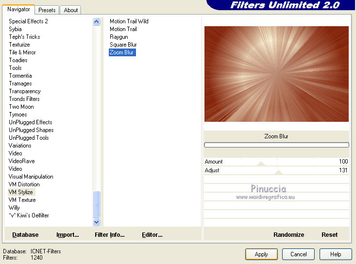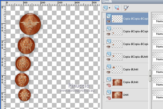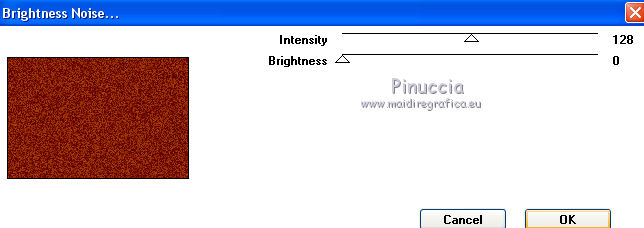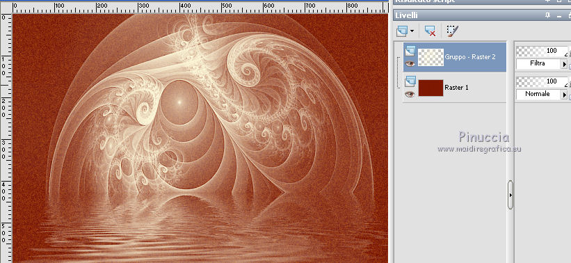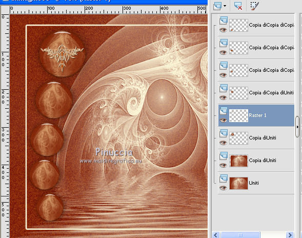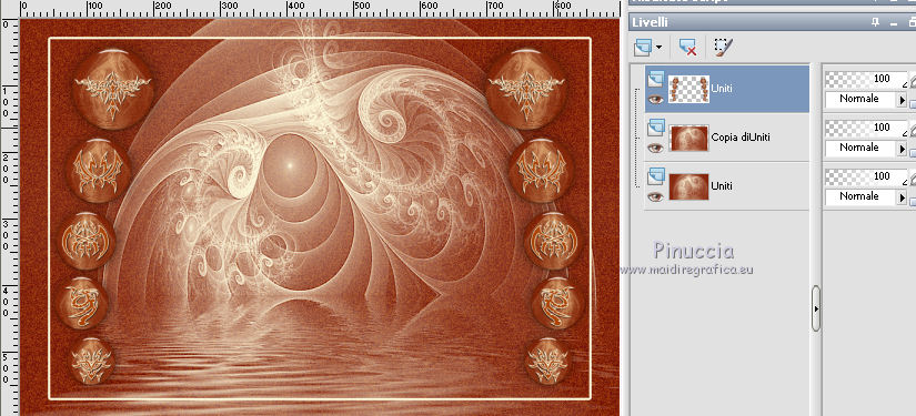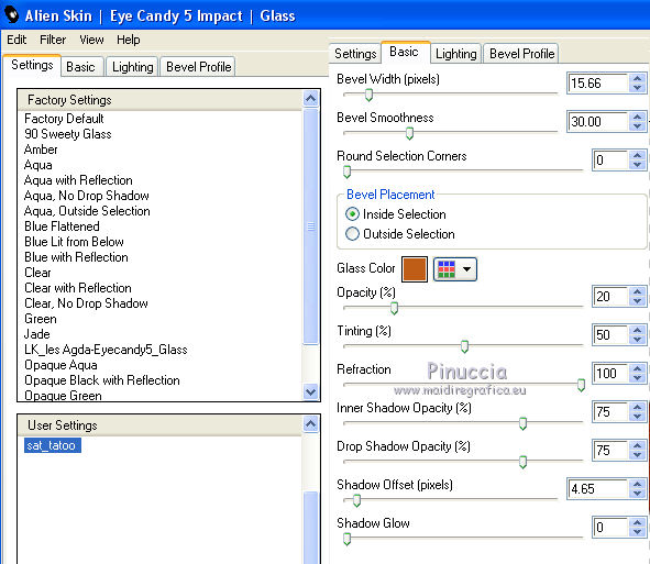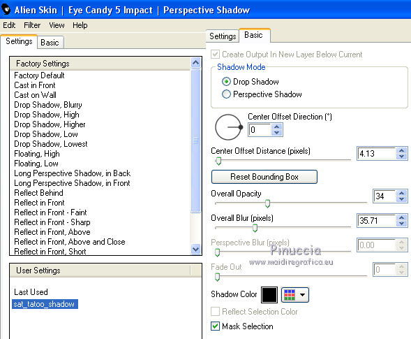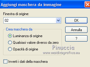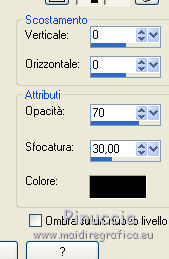 Occorrente: Materiale qui Per il tube grazie Angie. Il frattale è stato trovato su Internet. (in questa pagina trovi i links ai siti dei creatori di tubes) Filtri in caso di dubbi, ricorda di consultare la mia sezione filtri qui Filters Unlimited 2.0 qui VM Toolbox - Brightness Noise, Zoom Blur qui Alien Skin Eye Candy 5 Impact - Perspective Shadow, Glass qui Graphics Plus - Cross Shadow qui I filtri VM Toolbox e Graphics Plus si possono usare da soli o importati in Filters Unlimited (come fare vedi qui) Se un filtro fornito appare con questa icona ![]() non esitare a cambiare modalità di miscelatura e opacità secondo i colori utilizzati. Metti i presets Cliccando sul file una o due volte (a seconda delle tue impostazioni), automaticamente il preset si installerà nella cartella corretta. perchè uno o due clic vedi qui Apri il frattale (che userai come maschera) e minimizzalo con il resto del materiale Imposta il colore di primo piano con il colore chiaro #fcf8db, e il colore di sfondo con il colore scuro #ab4309. ![]() 1. Apri una nuova immagine trasparente 900 x 600 pixels, e riempila con il colore scuro.2. Effetti>Plugins>VM Toolbox - Brightness Noise, con i settaggi standard. ![]() 3. Livelli>Nuovo livello raster. Riempi con il colore chiaro.4. Livelli>Nuovo livello maschera>Da immagine. Apri il menu sotto la finestra d'origine e vedrai la lista dei files aperti. Seleziona il fractale "02" ![]() Regola>Messa a fuoco>Accentua messa a fuoco. Livelli>Unisci>Unisci gruppo. Cambia la modalità di miscelatura di questo livello in Filtra. ![]() Livelli>Unisci>Unisci visibile. 5. Livelli>Duplica. Immagine>Ridimensiona, al 90%, tutti i livelli non selezionato. 6. Selezione>Seleziona tutto. Selezione>Mobile. Selezione>Immobilizza. Selezione>Modifica>Seleziona bordature selezione. ![]() Riempi la selezione con il colore chiaro.Selezione>Deseleziona. 7. Attiva il livello di sfondo. Livelli>Duplica. Livelli>Disponi>Porta in alto. 8. Effetti>Effetti geometrici>Cerchio. ![]() 9. Immagine>Ridimensiona, al 30%, tutti i livelli non selezionato. 10. Effetti>Plugins>Alien Skin Eye Candy 5 Impact - Glass. Seleziona il preset sat_tatoo e ok. Se stai usando altri colori: Glass Color: il tuo colore scuro ![]() 11. Effetti>Plugins>Alien Skin Eye Candy 5 Impact - Perspective Shadow. Seleziona il preset sat_tatoo_shadow e ok. ![]() 12. Immagine>Ridimensiona, al 70%, tutti i livelli non selezionato. Sposta l'immagine in alto a sinistra.![]() 13. Livelli>Duplica. Immagine>Ridimensiona, all'80%, tutti i livelli non selezionato. Spostalo un po' più in basso.![]() 14. Livelli>Duplica. Immagine>Ridimensiona, al 90%, tutti i livelli non selezionato. Ripeti 2 volte, fino a ottenere altre tre sfere di dimensione decrescente. Posiziona correttamente le immagini.![]() 14. Attiva lo strumento Testo ![]() font Tatoo, o un font a tua scelta, pennellata 1, e scegli la dimensione in base alla lettera scelta. ![]() Scrivi la lettera sulla sfera. Livelli>Converti in livello raster. Effetti>Effetti 3D>Sfalsa ombra, a scelta; per me: ![]() Sposta questo livello sopra il livello della prima sfera. ![]() Livelli>Unisci>Unisci giù. 15. Attiva il livello soprastante della seconda sfera. Scrivi un'altra lettera, adattando la dimensione del font. Livelli>Converti in livello raster. Effetti>Effetti 3D>Sfalsa ombra, con i settaggi precedenti. Livelli>Unisci>Unisci giù. 16. Attiva il livello soprastante della terza sfera. Ripeti il passo 15 con un'altra lettera. 17. Ripeti il passo 15 con i livelli delle ultime due sfere. Chiudi i due livelli inferiori. ![]() Livelli>Unisci>Unisci visibile. Livelli>Duplica. Immagine>Rifletti. Livelli>Unisci>Unisci giù Riapri i livelli chiusi e rimani posizionato sul livello superiore. ![]() 18. Apri il tube della donna e vai a Modifica>Copia. Torna al tuo lavoro e vai a Modifica>Incolla come nuovo livello. Immagine>Rifletti. Immagine>Ridimensiona, al 110%, tutti i livelli non selezionato. Posiziona il tube come nell'esempio.Regola>Messa a fuoco>Metti a fuoco. 19. Effetti>Effetti 3D>Sfalsa ombra, colore nero. ![]() 20. Chiudi il livello di sfondo. Livelli>Unisci>Unisci visibile. 21. Attiva e riapri il livello di sfondo. Effetti>Plugins>VM Toolbox - Zoom Blur. la particolarità di questo effetto è che, importandolo in Unlimited, si posiziona sotto VM Stylize ![]() Effetti>Effetti di bordo>Aumenta. 22. Attiva il livello Uniti. Effetti>Plugins>Alien Skin Eye Candy 5 Impact - Perspective Shadow, con i settaggi precedenti. Livelli>Unisci>Unisci tutto. 23. Immagine>Aggiungi bordatura, 15 pixels, simmetriche, colore chiaro di primo piano. Attiva lo strumento Bacchetta magica ![]() e clicca nel bordo per selezionarlo. 24. Selezione>Inverti. Effetti>Effetti 3D>Sfalsa ombra, colore nero. ![]() Selezione>Deseleziona. 25. Apri il testo e vai a Modifica>Copia. Torna al tuo lavoro e vai a Modifica>Incolla come nuovo livello. 26. Firma il tuo lavoro su un nuovo livello. Immagine>Ridimensiona, 900 pixels di larghezza, tutti i livelli selezionato. Salva in formato jpg. Il tube di questo esempio è un MDZ Tube. ![]() Le vostre versioni Grazie ![]() Olimpia ![]() Marygraphics ![]() Puoi scrivermi per qualsiasi problema, o dubbio, se trovi un link che non funziona, o anche soltanto per un saluto. 10 Gennaio 2020 |