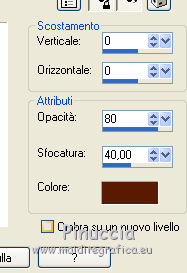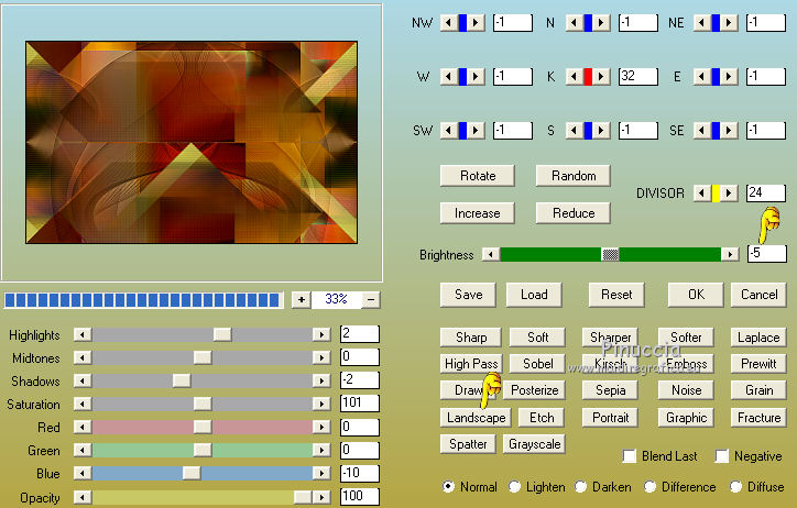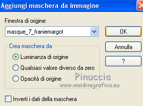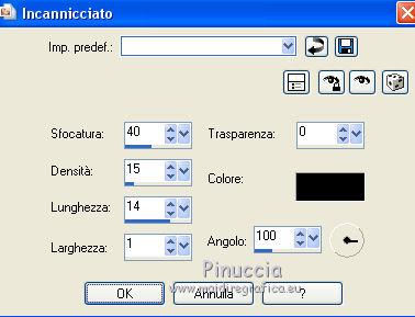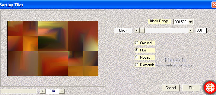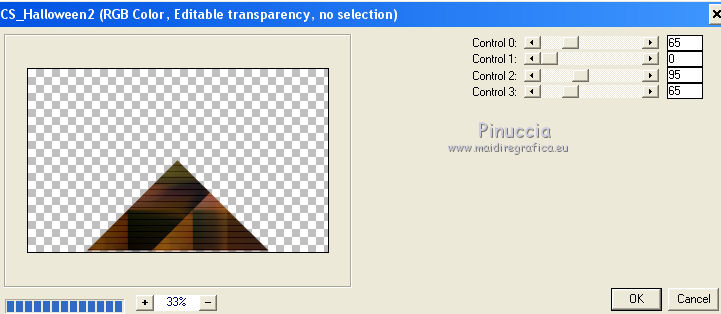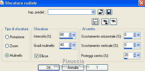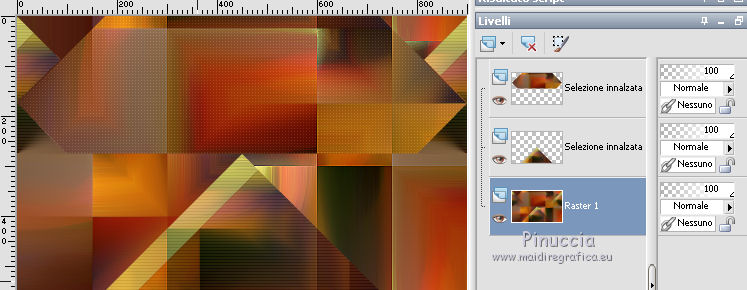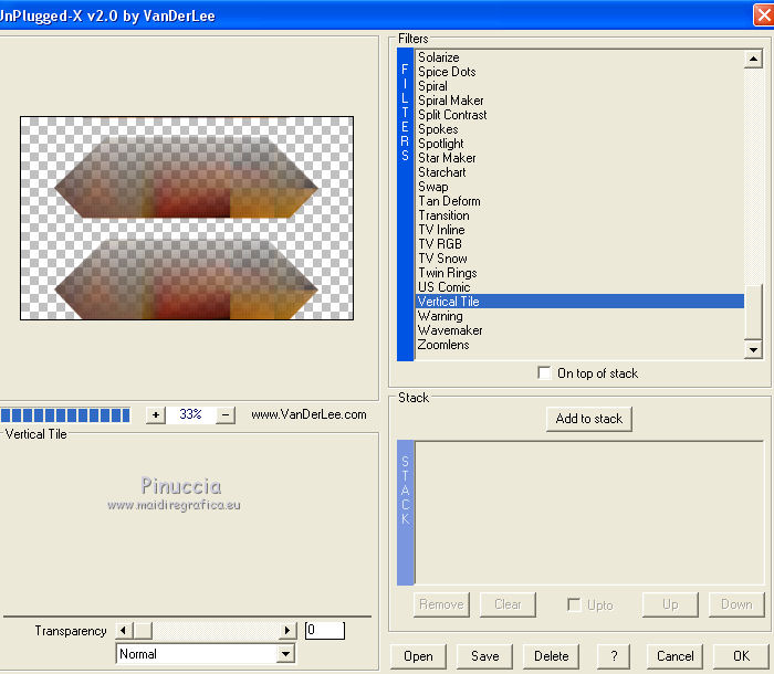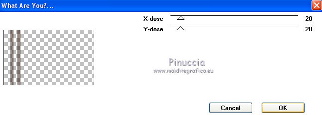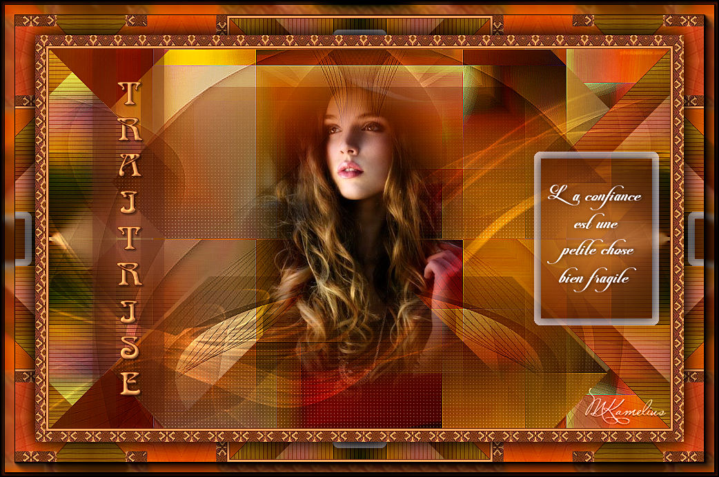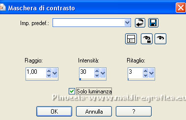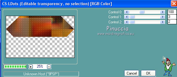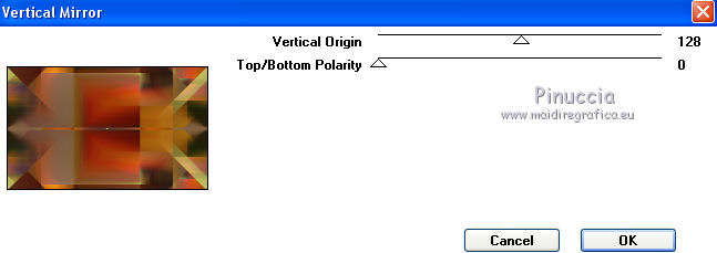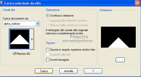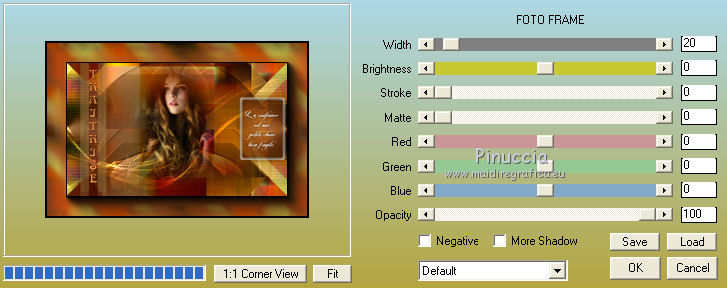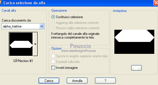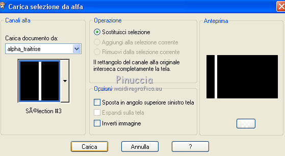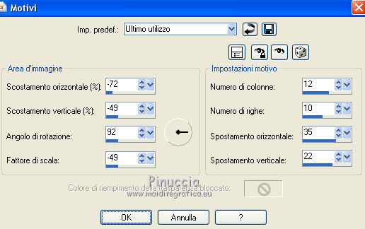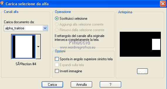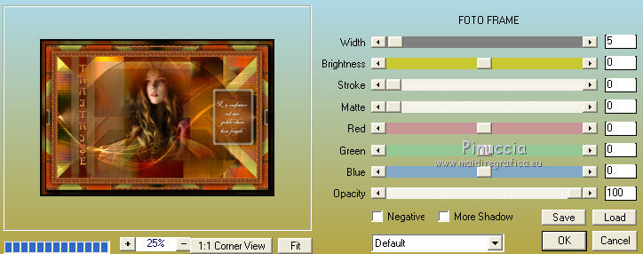 Occorrente: Materiale qui Per le maschere grazie Franie e Narah. Il resto del materiale è di Saturnella. (in questa pagina trovi i links ai siti dei creatori di tubes) Filtri in caso di dubbi, ricorda di consultare la mia sezione filtri qui Filters Unlimited 2.0 qui Mehdi - Sorting Tiles qui Simple - Blintz, Top Bottom Wrap qui Carolaine and Sensibility - CS-LDots, CS-Halloween2 qui Graphics Plus - Vertical Mirror qui Toadies - What are you qui VanDerLee - Unplugged-X qui AAA Frames - Foto Frame / AAA Filters - Custom qui I filtri Simple, Graphics Plus e Toadies si possono usare da soli o importati in Filters Unlimited (come fare vedi qui) Se un filtro fornito appare con questa icona ![]() non esitare a cambiare modalità di miscelatura e opacità secondo i colori utilizzati. Nelle ultime versioni di PSP non c'è il gradiente di primo piano/sfondo (Corel_06_029) Puoi usare i gradienti delle versioni precedenti. Trovi qui i gradienti Corel X. Metti i preset Cliccando sul file una o due volte (a seconda delle tue impostazioni), automaticamente il preset si installerà nella cartella corretta. perchè uno o due clic vedi qui Apri le maschere in PSP e minimizzale con il resto del materiale Imposta il colore di primo piano con il colore #ffffff, e il colore di sfondo con il colore #5a1c00. ![]() 1. Apri alpha_traitrise. Finestra>Duplica, o sulla tastiera tasto della maiuscola+D per fare una copia. ![]() Chiudi l'originale. La copia, che sarà la base del tuo lavoro, non è vuota, ma contiene le selezioni salvate sul canale alfa. Rinomina il livello Raster 1. 2. Selezione>Seleziona tutto. Apri l'immagine image_traitrise e vai a Modifica>Copia. Torna al tuo lavoro e vai a Modifica>Incolla come nuovo livello. Selezione>Deseleziona. 3. Effetti>Effetti di immagine>Motivo unico, con i settaggi standard. ![]() 4. Regola>Sfocatura>Sfocatura radiale. ![]() Effetti>Effetti di bordo>Aumenta di più. 5. Effetti>Plugins>Mehdi - Sorting Tiles. ![]() Effetti>Effetti di bordo>Aumenta. 6. Effetti>Plugins>Simple - Blintz Effetti>Plugins>Simple - Top Bottom Wrap 7. Selezione>Carica/Salva selezione>Carica selezione da canale alfa La selezione sélection 1 è subito disponibile. Devi soltanto cliccare Carica. ![]() Selezione>Innalza selezione a livello. Selezione>Deseleziona. Effetti>Plugins>Carolaine and Sensibility - CS-LDots ![]() 8. Attiva il livello di sfondo. Selezione>Carica/Salva selezione>Carica selezione da canale alfa Apri il menu delle selezioni e carica la selezione #2. ![]() Selezione>Innalza selezione a livello. Selezione>Deseleziona. Effetti>Plugins>Carolaine and Sensibility - CS-Halloween2. ![]() 9. Livelli>Duplica. Effetti>Effetti di immagine>Motivo unico, con i settaggi precedenti. 10. Livelli>Disponi>Sposta giù. Livelli>Unisci>Unisci giù. ![]() 11. Rimani posizionato sul livello di sfondo. Effetti>Plugins>Graphics Plus - Vertical Mirror. ![]() 12. Imposta il colore di primo piano con il colore bianco. Livelli>Nuovo livello raster. Riempi con il colore bianco.Livelli>Nuovo livello maschera>Da immagine. Apri il menu sotto la finestra di origine e vedrai la lista dei files aperti. Seleziona la maschera Narah_Mask_0878 ![]() Effetti>Effetti di bordo>Aumenta di più. Livelli>Unisci>Unisci gruppo. Effetti>Effetti 3D>Sfalsa ombra ![]() 13. Livelli>Duplica. Immagine>Rifletti. Livelli>Unisci>Unisci giù. Cambia la modalità di miscelatura di questo livello in Sovrapponi, o altro. 14. Attiva il livello superiore (selezione innalzata). Immagine>Ridimensiona, all'80%, tutti i livelli non selezionato. 15. Effetti>Plugins>VanDerLee - Unplugged-X - Vertical Tile ![]() Livelli>Unisci>Unisci visibile. 16. Selezione>Carica/Salva selezione>Carica selezione da canale alfa Apri il menu delle selezioni e carica la selezione #3. ![]() Selezione>Innalza selezione a livello. Mantieni selezionato. 17. Effetti>Effetti di trama>Incannicciato. ![]() Selezione>Deseleziona. 18. Effetti>Plugins>Toadies - What are you ![]() 19. Effetti>Effetti 3D>Sfalsa ombra, colore di sfondo #5a1c00. ![]() 20. Apri il tube texte1 e vai a Modifica>Copia. Torna al tuo lavoro e vai a Modifica>Incolla come nuovo livello. Posiziona il tube.Effetti>Effetti 3D>Smusso a incasso. ![]() 21. Effetti>Effetti 3D>Sfalsa ombra, colore nero. ![]() 22. Selezione>Carica/Salva selezione>Carica selezione da canale alfa Apri il menu delle selezioni e carica la selezione #4. ![]() Livelli>Nuovo livello raster. Abbassa l'opacità dello strumento Riempimento a 60. Riempi il livello con il colore bianco.23. Selezione>Modifica>Contrai - 10 pixels. Premi sulla tastiera il tasto CANC ![]() Imposta il colore di primo piano con il colore #f79a4e, e mantieni il colore di sfondo con #5a1c00. ![]() Passa il colore di primo piano a Gradiente di primo piano/sfondo, stile Sprazzo di luce. ![]() Riempi la selezione con il gradiente (opacità sempre a 60).Riporta l'opacità dello strumento Riempimento a 100. 24. Effetti>Effetti 3D>Sfalsa ombra. ![]() Selezione>Deseleziona. 25. Apri il tube texte2 e vai a Modifica>Copia. Torna al tuo lavoro e vai a Modifica>Incolla come nuovo livello. Posiziona correttamente il testo nel rettangolo.26. Effetti>Effetti 3D>Sfalsa ombra. ![]() Livelli>Unisci>Unisci giù. Effetti>Effetti 3D>Sfalsa ombra, colore di sfondo #5a1c00. ![]() 27. Attiva il livello di sfondo. Effetti>Plugins>AAA Filters - Custom - Landscape, Brightness -5. ![]() 28. Imposta il colore di primo piano con il colore bianco. Livelli>Nuovo livello raster. Riempi con il colore bianco.Livelli>Nuovo livello maschera>Da immagine. Apri il menu sotto la finestra di origine e seleziona la maschera masque_7_franiemargot ![]() Livelli>Unisci>Unisci gruppo. Cambia la modalità di miscelatura di questo livello in Indebolisci, o altro. 29. Attiva il livello superiore. Apri il tube sat_bus50 e vai a Modifica>Copia. Torna al tuo lavoro e vai a Modifica>Incolla come nuovo livello. Immagine>Ridimensiona, all'80%, tutti i livelli non selezionato. Livelli>Duplica. Livelli>Unisci>Unisci giù. 30