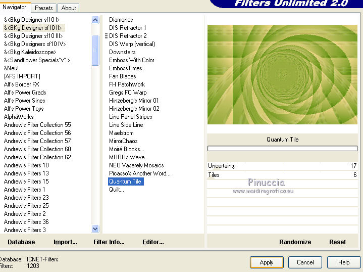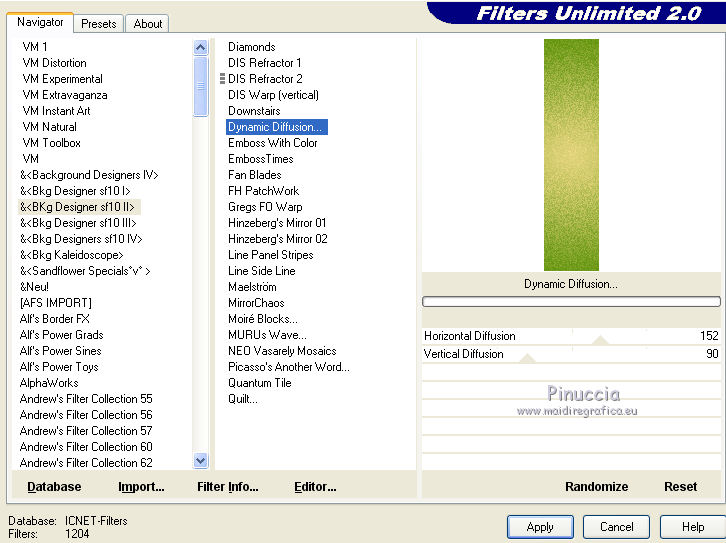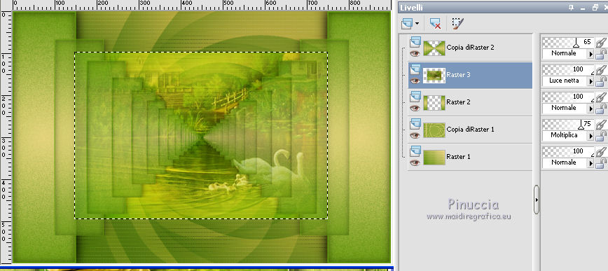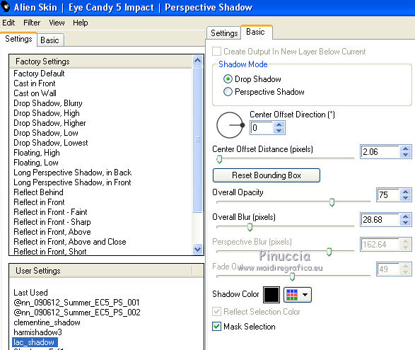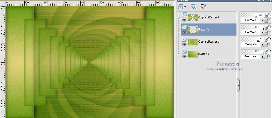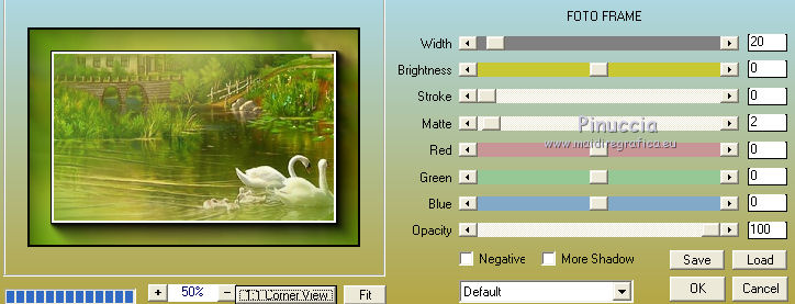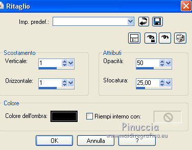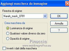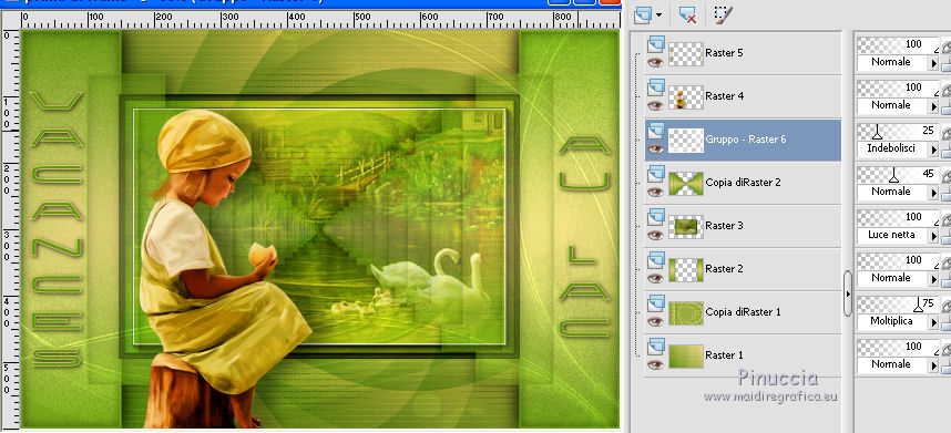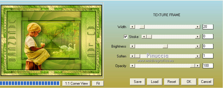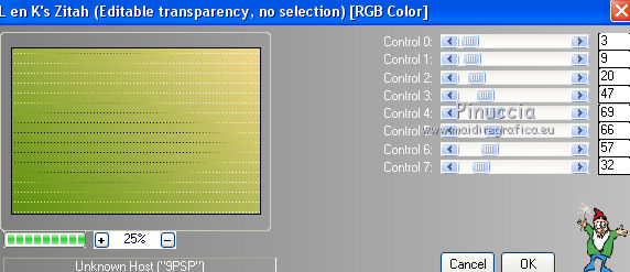 Occorrente: Materiale qui Per la maschera grazie Narah. Il resto del materiale è di Saturnella (in questa pagina trovi i links ai siti dei creatori di tubes) Filtri in caso di dubbi, ricorda di consultare la mia sezione filtri qui Filters Unlimited 2.0 qui &<Bkg Designer sf10II> (da importare in Unlimited) qui L&&K's - L&K's Zitah qui Alien Skin Eye Candy 5 Impact - Perspective Shadow qui AAA Frames - Foto Frame, Texture Frame qui Graphics Plus - Quick Tile I qui I filtri Graphics Plus si possono usare da soli o importati in Filters Unlimited (come fare vedi qui) Se un filtro fornito appare con questa icona ![]() non esitare a cambiare modalità di miscelatura e opacità secondo i colori utilizzati. Nelle ultime versioni di PSP non c'è il gradiente di primo piano/sfondo (Corel_06_029) Puoi usare i gradienti delle versioni precedenti. Trovi qui i gradienti Corel X. Metti il preset Cliccando sul file una o due volte (a seconda delle tue impostazioni), automaticamente il preset si installerà nella cartella corretta. perchè uno o due clic vedi qui Apri la maschera in PSP e minimizzala con il resto del materiale 1. Imposta il colore di primo piano con il colore chiaro #fb3090, e il colore di sfondo con il colore scuro #61950d. ![]() Passa il colore di primo piano a Gradiente di primo piano/sfondo, stile Lineare. ![]() Apri alpha_lac. Finestra>Duplica, o sulla tastiera tasto della maiuscola+D per fare una copia. ![]() Chiudi l'originale. La copia, che sarà la base del tuo lavoro, non è vuota, ma contiene le selezioni salvate sul canale alfa. Rinomina il livello Raster 1. Riempi l'immagine trasparente con il gradiente.2. Effetti>Plugins>L&K's - L&K's Zitah ![]() 3. Livelli>Duplica. Effetti>Plugins>Filters Unlimited 2.0 - &<Bkg Designer sf10II> - Quantum Tile, con i settaggi standard. ![]() Cambia la modalità di miscelatura di questo livello in Moltiplica, e abbassa l'opacità al 75%. ![]() 4. Livelli>Nuovo livello raster. Selezione>Carica/Salva selezione>Carica selezione da canale alfa. La selezione sélection#1 è subito disponibile. Devi soltanto cliccare Carica. ![]() Riempi con il colore di sfondo.Selezione>Modifica>Contrai - 3 pixels. Cambia i settaggi del gradiente, Stile Sprazzo di luce. ![]() Riempi la selezione con il gradiente.5. Effetti>Plugins>Filters Unlimited 2.0 - &<Bkg Designer sf10II> -Dynamic diffusion ![]() Mantieni selezionato. Livelli>Nuovo livello raster. Effetti>Effetti 3D>Ritaglio. ![]() Livelli>Unisci>Unisci giù. Selezione>Deseleziona. 6. Effetti>Plugins>Alien Skin Eye Candy 5 Impact - Perspective Shadow. Seleziona il preset lac_shadow e ok. ![]() 7. Livelli>Duplica. Immagine>Rifletti. Livelli>Unisci>Unisci giù. 8. Livelli>Duplica. Effetti>Effetti di riflesso>Fuga di specchi. ![]() Abbassa l'opacità di questo livello al 65%. 9. Attiva livello sottostante (le colonne). ![]() Livelli>Nuovo livello raster. Selezione>Carica/Salva selezione>Carica selezione da canale alfa. Apri il menu delle selezioni e carica sélection#2. ![]() Riempi la selezione con il gradiente Sprazzo di luce.10. Apri il tube del paesaggio e vai a Modifica>Copia. Torna al tuo lavoro e vai a Modifica>Incolla come nuovo livello. Posiziona il tube sulla selezione.Selezione>Inverti. Premi sulla tastiera il tasto CANC ![]() Di nuovo Selezione>Inverti Per questo tube, io ho duplicato e unito con l'originale. 11. Livelli>Unisci>Unisci giù. Cambia la modalità di miscelatura di questo livello in Luce netta. ![]() 12. Effetti>Plugins>AAA Frames - Foto Frame. ![]() Ripeti l'Effetto width 8 e Matte 0 ![]() Selezione>Deseleziona. 13. Attiva il livello superiore (l'effetto Fuga di specchi). Io ho abbassato l'opacità al 45%. 14. Effetti>Plugins>Alien Skin Eye Candy 5 Impact - Perspective Shadow, con i settaggi precedenti. 15. Apri il tube della bambina e vai a Modifica>Copia. Torna al tuo lavoro e vai a Modifica>Incolla come nuovo livello. Immagine>Ridimensiona, 2 volte al 75%, tutti i livelli non selezionato. Regola>Messa a fuoco>Metti a fuoco. Posiziona correttamente il tube.16. Effetti>Effetti 3D>Sfalsa ombra. ![]() 17. Apri il tube texte e vai a Modifica>Copia. Torna al tuo lavoro e vai a Modifica>Incolla come nuovo livello. Posiziona correttamente il tube.18. Effetti>Effetti 3D>Sfalsa ombra. ![]() 19. Imposta il colore di primo piano con il colore bianco #ffffff. Attiva il livello sotto quello della bambina. Livelli>Nuovo livello raster. Riempi il livello con il colore bianco.Livelli>Nuovo livello maschera>Da immagine. Apri il menu sotto la finestra d'origine e vedrai la lista dei files aperti. Seleziona la maschera Narah_Mask_0781. ![]() Immagine>Rifletti. Effetti>Effetti di bordo>Aumenta. Livelli>Unisci>Unisci gruppo. Cambia la modalità di miscelatura di questo livello in Indebolisci, e abbassa l'opacità al 25%. ![]() 20. Imposta nuovamente il colore di primo piano con il colore chiaro #fb3090 ![]() Passa il colore di primo piano a Gradiente di primo piano/sfondo, stile Lineare. ![]() Immagine>Aggiungi bordatura, 1 pixel, simmetriche, colore di sfondo. Immagine>Aggiungi bordatura, 3 pixels, simmetriche, colore 1. Immagine>Aggiungi bordatura, 1 pixels, simmetriche, colore di sfondo. Selezione>Seleziona tutto. Immagine>Aggiungi bordatura, 50 pixels, simmetriche, colore 3 bianco. Selezione>Inverti. Riempi la selezione con il gradiente.21. Effetti>Plugins>Graphics Plus - Quick Tile I. ![]() 22. Effetti>Plugins>AAA Frames - Texture Frame. ![]() 23. Selezione>Inverti. Effetti>Effetti 3D>Sfalsa ombra. ![]() Selezione>Deseleziona. Firma il tuo lavoro su un nuovo livello. Immagine>Aggiungi bordatura, 1 pixel, simmetriche, colore nero. Immagine>Ridimensiona, 900 pixels di larghezza, tutti i livelli selezionato. Regola>Messa a fuoco>Maschera di contrasto. ![]() Salva in formato jpg. Versione con tube di Anna.Br ![]() Le vostre versioni Grazie ![]() Olimpia ![]() Marygraphics ![]() Puoi scrivermi per qualsiasi problema, o dubbio, se trovi un link che non funziona, o anche soltanto per un saluto. 15 Giugno 2