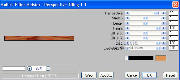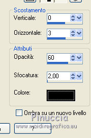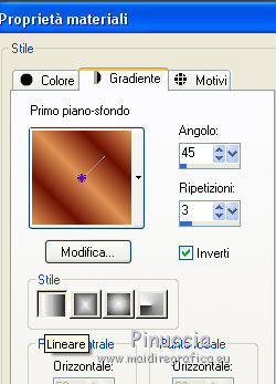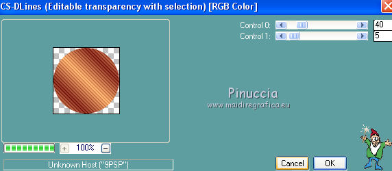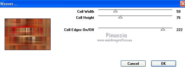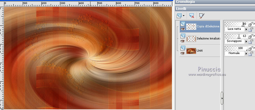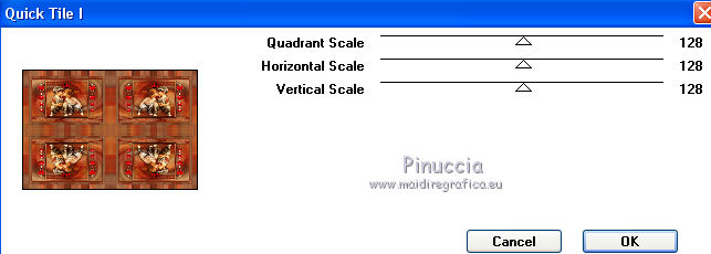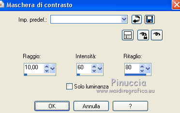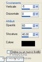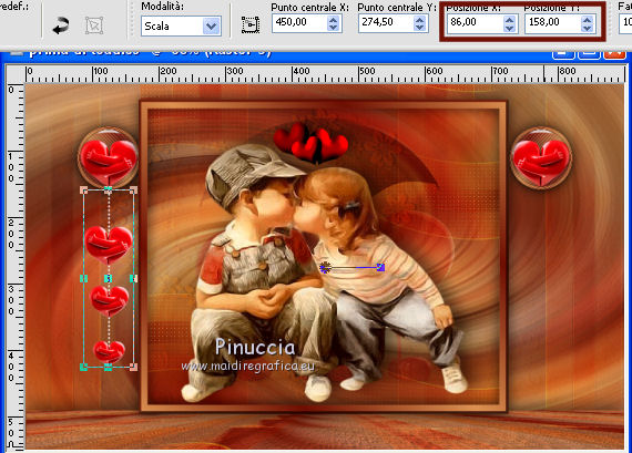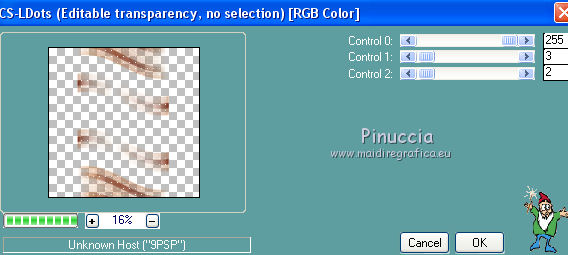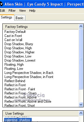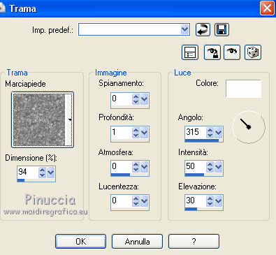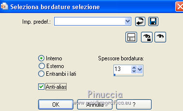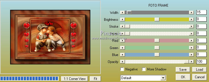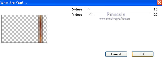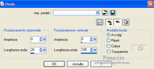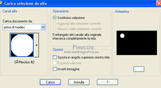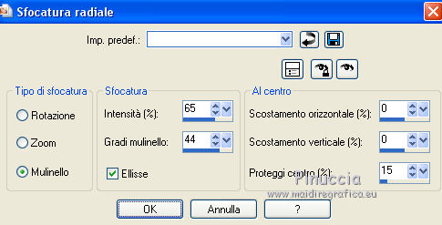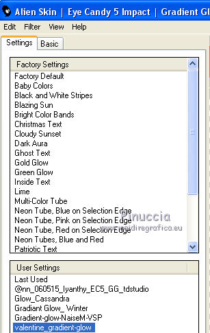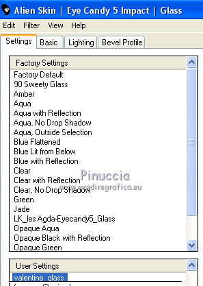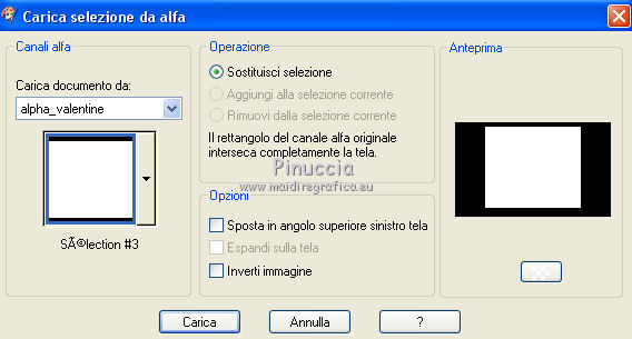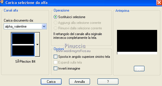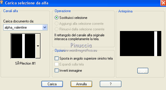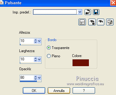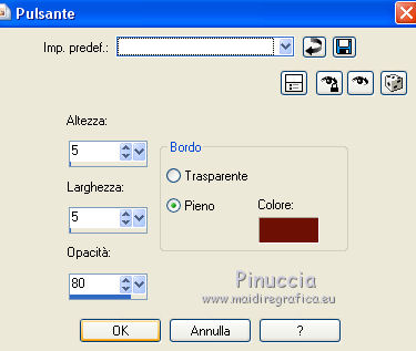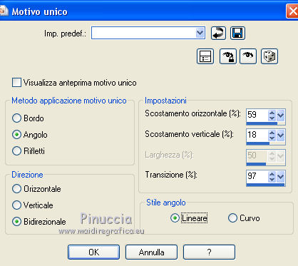 Occorrente: Materiale qui Il materiale è di Saturnella. (in questa pagina trovi i links ai siti dei creatori di tubes) Filtri in caso di dubbi, ricorda di consultare la mia sezione filtri qui Filters Unlimited 2.0 qui Toadies - What are you, Weaver qui Graphics Plus - Quick Tile I qui Carolaine and Sensibility - CS-LDots, CS-DLines qui Mura's Meister - Perspective Tiling qui Alien Skin Eye Candy 5 Impact - Perspective Shadow, Gradient Glow, Glass qui AAA Frames - Foto Frame qui I filtri Graphics Plus e Toadies si possono usare da soli o importati in Filters Unlimited (come fare vedi qui) Se un filtro fornito appare con questa icona ![]() non esitare a cambiare modalità di miscelatura e opacità secondo i colori utilizzati. Metti i presets Cliccando sul file una o due volte (a seconda delle tue impostazioni), automaticamente il preset si installerà nella cartella corretta. perchè uno o due clic vedi qui Se preferisci, puoi importare direttamente il preset nel corso del tutorial Come fare vedi la scheda del filtro Eye Candy qui La trama Trottoir corrisponde alla trama standard Marciapiede (nelle nuove versioni Corel_15_) Se non la trovi nel tuo PSP, metti quella fornita nella cartella Trame. Apri la maschera in PSP e minimizzala con il resto del materiale. Attenzione: non dimenticare di togliere la firma prima di copiare i tubes. 1. Imposta il colore di primo piano con il colore scuro #6e1004, e il colore di sfondo con il colore chiaro #de9352. ![]() Apri alpha_valentine. Finestra>Duplica, o sulla tastiera tasto della maiuscola+D per fare una copia. ![]() Chiudi l'originale. La copia, che sarà la base del tuo lavoro, non è vuota, ma contiene le selezioni salvate sul canale alfa. Rinomina il livello "Raster 1". Riempi l'immagine trasparente con il colore di primo piano.2. Selezione>Seleziona tutto. Apri il tube del personaggio sat_per01, cancella la firma, e vai a Modifica>Copia. Minimizza il tube. Torna al tuo lavoro e vai a Modifica>Incolla nella selezione. Selezione>Deseleziona. 3. Effetti>Effetti di immagine>Motivo unico, con i settaggi standard. ![]() 4. Regola>Sfocatura>Sfocatura radiale. ![]() Effetti>Effetti di bordo>Aumenta di più. 5. Livelli>Nuovo livello raster. Riempi con il colore di sfondo.Livelli>Nuovo livello maschera>Da immagine. Apri il menu sotto la finestra di origine e vedrai la lista dei files aperti. Seleziona la maschera Saturnella_Mask_valentin01. ![]() Regola>Messa a fuoco>Accentua messa a fuoco. Livelli>Unisci>Unisci gruppo. Cambia la modalità di miscelatura di questo livello in Luce diffusa o altro. 6. Effetti>Effetti 3D>Sfalsa ombra. ![]() Livelli>Unisci>Unisci visibile. 7. Selezione>Carica/Salva selezione>Carica selezione da canale alfa. La selezione sélection#1 è subito disponibile. Devi soltanto cliccare Carica. ![]() Selezione>Innalza selezione a livello. Selezione>Deseleziona 8. Effetti>Plugins>Toadies - What are you. ![]() Effetti>Effetti di bordo>Aumenta. 9. Effetti>Effetti di immagine>Motivo unico. ![]() 10. Livelli>Duplica. Immagine>Rifletti. Livelli>Unisci>Unisci giù. Cambia la modalità di miscelatura di questo livello in Sovrapponi, e abbassa l'opacità al 63%. 11. Attiva lo strumento Puntatore ![]() ![]() tira i nodi a destra e a sinistra fino ai bordi ![]() 12. Livelli>Duplica. Immagine>Ruota per gradi - 90 gradi a destra. ![]() Effetti>Effetti di distorsione>Onda. ![]() 13. Effetti>Plugins>Carolaine and Sensibility - CS-LDots ![]() Cambia la modalità di miscelatura di questo livello in Luce netta, e abbassa l'opacità all'80%. ![]() Livelli>Unisci>Unisci visibile. 14. Selezione>Carica/Salva selezione>Carica selezione da canale alpha. Apri il menu delle selezioni e Carica sélection#2. ![]() Passa il colore di primo piano a Gradiente di primo piano/sfondo, stile Lineare. ![]() Livelli>Nuovo livello raster. Riempi la selezione con il gradiente.15. Effetti>Plugins>Carolaine and Sensibility - CS-DLines. ![]() Selezione>Deseleziona. 16. Apri il tube sat_val07 e vai a Modifica>Copia. Torna al tuo lavoro e vai a Modifica>Incolla come nuovo livello. Immagine>Ridimensiona, al 9%, tutti i livelli non selezionato. Posiziona il tube al centro del cerchio.17. Effetti>Effetti 3D>Sfalsa ombra. ![]() Livelli>Unisci>Unisci giù. 18. Effetti>Plugins>Alien Skin Eye Candy 5 Impact - Glass. Seleziona il preset valentine_glass e ok ![]() 19. Selezione>Seleziona tutto. Selezione>Mobile. Selezione>Immobilizza. Effetti>Plugins>Alien Skin Eye Candy 5 Impact - Gradient Glow. Seleziona il preset valentine_gradient-glow e ok. ![]() Selezione>Deseleziona. 20. Effetti>Effetti 3D>Sfalsa ombra ![]() 21. Livelli>Duplica. Immagine>Rifletti. Livelli>Unisci>Unisci giù. Selezione>Carica/Salva selezione>Carica selezione da canale alpha. Apri il menu delle selezioni e Carica sélection#3. ![]() Livelli>Nuovo livello raster. Apri l'immagine StValentin e vai a Modifica>Copia. Torna al tuo lavoro e vai a Modifica>Incolla nella selezione. Mantieni selezionato. Cambia la modalità di miscelatura di questo livello in Luce diffusa, e abbassa l'opacità al 65%. 22. Selezione>Modifica>Seleziona bordature selezioni. ![]() Livelli>Nuovo livello raster. Riempi con il gradiente.23. Effetti>Effetti 3D>Pulsante, colore di primo piano. ![]() 24. Effetti>Effetti 3D>Sfalsa ombra. ![]() Selezione>Deseleziona. 25. Attiva nuovamente il tube del personaggio sat_per01 e vai a Modifica>Copia. Torna al tuo lavoro e vai a Modifica>Incolla come nuovo livello. Immagine>Ridimensiona, al 70%, tutti i livelli non selezionato. Regola>Messa a fuoco>Metti a fuoco. 26. Effetti>Plugins>Alien Skin Eye Candy 5 Impact - Perspective Shadow. Seleziona il preset valentine_shadow e ok. ![]() 27. Attiva il livello di sfondo. Selezione>Carica/Salva selezione>Carica selezione da canale alpha. Apri il menu delle selezioni e Carica sélection#4. ![]() Selezione>Innalza selezione a livello. Effetti>Effetti di trama>Trama - seleziona la trama Marciapiede (Trottoir). ![]() 28. Effetti>Plugins>Mura's Meister - Perspective Ti
