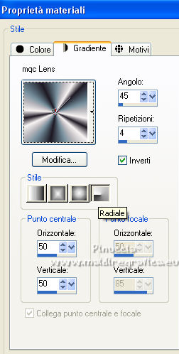 Passa il colore di sfondo a gradiente e seleziona il gradiente Mqc Lens, con gli stessi settaggi.