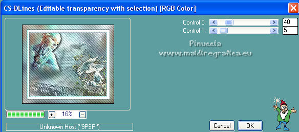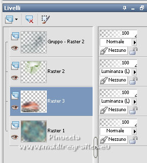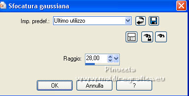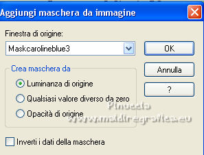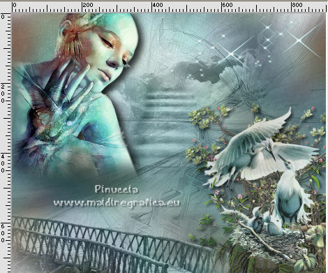 qui puoi trovare qualche risposta ai tuoi dubbi. Se l'argomento che ti interessa non è presente, ti prego di segnalarmelo. Questo tutorial è stato tradotto con CorelX7, ma può essere eseguito anche con le altre versioni di PSP. Dalla versione X4, il comando Immagine>Rifletti è stato sostituito con Immagine>Capovolgi in orizzontale, e il comando Immagine>Capovolgi con Immagine>Capovolgi in verticale. Nelle versioni X5 e X6, le funzioni sono state migliorate rendendo disponibile il menu Oggetti. Con la nuova versione X7, sono tornati Rifletti>Capovolgi, ma con nuove varianti. Vedi la scheda sull'argomento qui Occorrente: Materiale qui (in questa pagina trovi i links ai siti dei creatori di tubes) Filtri: se hai problemi con i filtri, consulta la mia sezione filtri qui Carolaine and Sensibility - CS-DLines qui Artistics - Sponge qui ![]() non esitare a cambiare modalità di miscelatura e opacità secondo i colori utilizzati. ![]() Apri la maschera in PSP e minimizzala con il resto del materiale. Imposta il colore di primo piano con #2f454b, e il colore di sfondo con #57bcb9. ![]() 1. Apri una nuova immagine trasparente 900 x 750 pixels. Selezione>Seleziona tutto. Apri il tube Woman-gr-mika e vai a Modifica>Copia. Torna al tuo lavoro e vai a Modifica>Incolla nella selezione. Selezione>Deseleziona. 2. Effetti>Effetti di immagine>Motivo unico, Fianco a fianco ![]() Livelli>Duplica. Immagine>Ruota per gradi - 90 gradi a destra. ![]() Immagine>Rifletti. Livelli>Unisci>Unisci giù. 3. Regola>Sfocatura>Sfocatura gaussiana - raggio 28. ![]() Livelli>Duplica. 4. Effetti>Plugins>Artistics - Sponge Se stai usando la versione francese del filtro: Effetti>Plugins>Artistiques - Eponge ![]() Abbassa l'opacità di questo livello al 48%. Immagine>Rifletti. Immagine>Capovolgi. Livelli>Unisci>Unisci giù. 5. Livelli>Nuovo livello raster. Riempi con il colore di primo piano #2f454b.6. Livelli>Nuovo livello maschera>Da immagine. Apri il menu sotto la finestra di origine e vedrai la lista dei files aperti. Seleziona la maschera MaskCarolineblue3. ![]() Effetti>Effetti di bordo>Aumenta. Livelli>Unisci>Unisci gruppo. 7. Apri il tube escaliers1-220122 e vai a Modifica>Copia. Torna al tuo lavoro e vai a Modifica>Incolla come nuovo livello. Immagine>Ridimensiona, all'85%, tutti i livelli non selezionato. Tasto K sulla tastiera per attivare lo strumento Puntatore ![]() e imposta Posizione X: 75,00 e Posizione Y: -207,00. ![]() Livelli>Disponi>Sposta giù. Cambia la modalità di miscelatura di questo livello in Luminanza (esistente). 8. Attiva il livello inferiore, Raster 1. Apri il tube pont2-220122 e vai a Modifica>Copia. Torna al tuo lavoro e vai a Modifica>Incolla come nuovo livello. Imposta Posizione X: -85,00 e Posizione Y: 325,00 ![]() Tasto M per deselezionare lo strumento. 9. Cambia la modalità di miscelatura di questo livello in Luminanza (esistente). ![]() 12. Attiva nuovamente il livello superiore, Gruppo Raster 2. Livelli>Duplica. Immagine>Rifletti. Immagine>Capovolgi. Abbassa l'opacità di questo livello al 44%. Livelli>Unisci>Unisci giù. 13. Apri il tube déco 1-220122 e vai a Modifica>Copia. Torna al tuo lavoro e vai a Modifica>Incolla come nuovo livello. Strumento Puntatore ![]() e imposta Posizione X: 629,00 e Posizione Y: 6,00. ![]() Livelli>Duplica. Imposta Posizione X: 434,00 e Posizione Y: 45,00. ![]() Livelli>Unisci>Unisci giù. 14. Effetti>Effetti 3D>Sfalsa ombra, colore di sfondo #57bcb9. ![]() 15. Attiva nuovamente il tube Woman-gr-mika e vai a Modifica>Copia. Torna al tuo lavoro e vai a Modifica>Incolla come nuovo livello. Imposta Posizione X: -22,00 e Posizione Y: -8,00. ![]() Effetti>Effetti 3D>Sfalsa ombra, colore nero. ![]() 16. Apri il tube cigognes-220122 e vai a Modifica>Copia. Torna al tuo lavoro e vai a Modifica>Incolla come nuovo livello. Imposta Posizione X: 498,00 e Posizione Y: 254,00. ![]() Tasto M per deselezionare lo strumento. Effetti>Effetti 3D>Sfalsa ombra, colore nero. ![]() Abbassa l'opacità di questo livello al 75%. Regola>Messa a fuoco>Maschera di contrasto. ![]() Livelli>Unisci>Unisci tutto. ![]() 17. Modifica>Copia. 18. Immagine>Aggiungi bordatura, 1 pixel, simmetriche, colore di primo piano. Immagine>Aggiungi bordatura, 2 pixels, simmetriche, colore bianco. Immagine>Aggiungi bordatura, 2 pixels, simmetriche, colore di sfondo. Immagine>Aggiungi bordatura, 2 pixels, simmetriche, colore bianco. Immagine>Aggiungi bordatura, 1 pixel, simmetriche, colore di primo piano. Immagine>Aggiungi bordatura, 20 pixels, simmetriche, colore bianco. 19. Immagine>Aggiungi bordatura, 1 pixel, simmetriche, colore di primo piano. Immagine>Aggiungi bordatura, 2 pixels, simmetriche, colore bianco. Immagine>Aggiungi bordatura, 2 pixels, simmetriche, colore di sfondo. Immagine>Aggiungi bordatura, 2 pixels, simmetriche, colore bianco. Immagine>Aggiungi bordatura, 1 pixel, simmetriche, colore di primo piano. 20. Selezione>Seleziona tutto. Immagine>Aggiungi bordatura, 50 pixels, simmetriche, colore bianco. 21. Selezione>Inverti. Modifica>Incolla nella selezione (l'immagine in memoria dal punto 17). 22. Regola>Sfocatura>Sfocatura gaussiana - raggio 28. ![]() 23. Selezione>Inverti. Effetti>Effetti 3D>Sfalsa ombra, colore nero. ![]() 24. Selezione>Inverti. Effetti>Plugins>Carolaine and Sensibility - CS-DLines ![]() Selezione>Deseleziona. 25. Immagine>Aggiungi bordatura, 1 pixel, simmetriche, colore di primo piano. 26. Immagine>Ridimensiona, 800 pixels di larghezza, o come preferisci, tutti i livelli selezionato. 27. Firma il tuo lavoro su un nuovo livello. Aggiungi, se vuoi, il watermark dell'autore e del traduttore. 28. Livelli>Unisci>Unisci tutto e salva in formato jpg. Per i tubes di questo esempio grazie Nikita ![]() ![]() Le vostre versioni. Grazie ![]() Marygraphics ![]() Puoi scrivermi se hai problemi o dubbi, o trovi un link che non funziona, o soltanto per un saluto. |