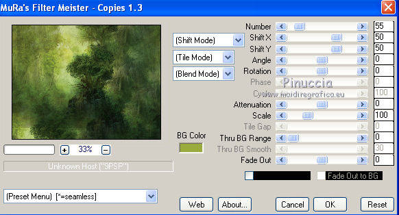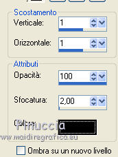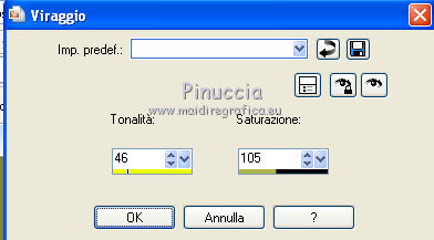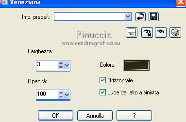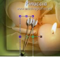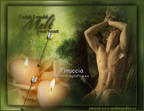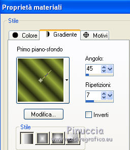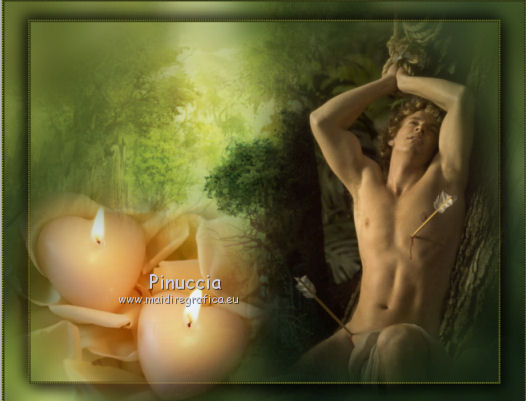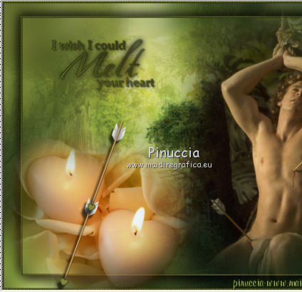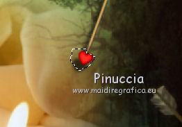 qui puoi trovare qualche risposta ai tuoi dubbi. Se l'argomento che ti interessa non è presente, ti prego di segnalarmelo. Per tradurre questo tutorial ho usato PSP X, ma può essere eseguito anche con le altre versioni di PSP. Questo tutorial è una creazione di ©Sietskes e non può essere copiato su altri siti nè essere offerto per il download. Lo stesso vale per la mia traduzione. Il materiale viene da vari gruppi di condivisione. Il copyright appartiene ai rispettivi autori. Grazie ai creatori dei tubes che mettono a disposizione il loro lavoro in vari gruppi di condivisione. Occorrente: Materiale qui I tubes sono di Bibiche, Dragonblu, Guismo. Il pennello è di Agi. Rispetta il lavoro degli autori, non cambiare il nome del file e non cancellare il watermark. Filtri: in caso di dubbi, ricorda di consultare la mia sezione filtri qui Mura's Meister - Copies qui Ti servirà anche Animation Shop qui ![]() Imposta il colore di primo piano con #282b12, e il colore di sfondo con #99ab3c. 1. Apri una nuova immagine trasparente 650 x 500 pixels, e riempila con il colore di sfondo.2. Apri il tube aaabibichestraub006 e vai a Modifica>Copia. Torna al tuo lavoro e vai a Modifica>Incolla come nuovo livello. Livelli>Duplica. Chiudi questo livello e attiva il livello sottostante dell'originale. Effetti>Plugins>Mura's Meister - Copies. ![]() Regola>Sfocatura>Sfocatura gaussiana - raggio 15. ![]() 2. Apri il livello della copia e lascia il tube come sta. 3. Livelli>Unisci>Unisci tutto. 4. Immagine>Aggiungi bordatura, 3 pixels, simmetriche, con il colore di sfondo. Seleziona questo bordo con la bacchetta magica ![]() 5. Effetti>Effetti di trama>Veneziana. ![]() Ripeti l'Effetto Veneziana, togliendo la selezione a Orizzontale. ![]() Selezione>Deseleziona. 5. Livelli>Duplica. Immagine>Ridimensiona, al 90%, tutti i livelli non selezionato. Effetti>Effetti 3D>sfalsa ombra, con il colore nero. ![]() Ripeti l'Effetto Sfalsa ombra, cambiando verticale e orizzontale con -5. 6. Apri il tube DragonbluMistedTube_1109_AmorByDavidVence e vai a Modifica>Copia. Torna al tuo lavoro e vai a Modifica>Incolla come nuovo livello. Spostalo a destra.7. Apri il tube calguisbougie6110 e vai a Modifica>Copia. Torna al tuo lavoro e vai a Modifica>Incolla come nuovo livello. Sposta il tube in basso a sinistra.![]() 8. Passa il colore di primo piano a Gradiente lineare, con i seguenti settaggi. ![]() Apri il pennello AgiBrush71_meltyyourheart. File>Esporta>Pennello personalizzato, assegna un nome al pennello e ok. Livelli>Nuovo livello raster. Attiva lo strumento Pennello ,cerca e seleziona il pennello che hai appena esportato, e applicalo in alto a sinistra, cliccando con il tasto sinistro del mouse per usare il gradiente di primo piano. Effetti>Effetti 3D>Sfalsa ombra, con il colore nero. ![]() Ripeti l'Effetto Sfalsa ombra, cambiando verticale e orizzontale con -1. 9. Aggiungi il tuo nome e/o il tuo watermark su un nuovo livello. 10. Apri il tube CupidArrows.tub. Attiva lo strumento Selezione a mano libera e seleziona una freccia.Modifica>Copia. Torna al tuo lavoro e vai a Modifica>Incolla come nuovo livello. Attiva lo strumento Selezione a mano libera da punto a punto,e seleziona la punta della freccia. ![]() Regola>Tonalità e saturazione>Viraggio. ![]() Selezione>Deseleziona. Livelli>Duplica. Chiudi entrambi i livelli delle frecce. Modifica>Copia Unione. 11. Apri Animation Shop e vai a Modifica>Incolla>Incolla come nuova animazione. 12. Torna in PSP. Apri il livello originale della freccia e sposta la freccia in alto, in modo che sia visibile soltanto la punta.![]() Modifica>Copia Unione. Torna in Animation Shop e vai a Modifica>Incolla>Incolla dopo il fotogramma corrente. 13. In PSP. Sposta la freccia un po' più in basso.![]() Modifica>Copia Unione. In Animation Shop: Modifica>Incolla>Incolla dopo il fotogramma corrente. 14. In PSP. Ripeti il passo precedente. E adesso hai un'animazione composta da 4 fotogrammi. 15. In PSP, per creare il quinto fotogramma: sposta la freccia ancora un po' più in basso.Apri e attiva il livello della copia e posiziona questa freccia in alto, in modo che sia visibile soltanto la punta.![]() Modifica>Copia Unione. In Animation Shop: Modifica>Incolla>Incolla dopo il fotogramma corrente. 16. In PSP. Sposta le due frecce un po' più in basso.Modifica>Copia Unione. In Animation Shop: Modifica>Incolla>Incolla dopo il fotogramma corrente. Ripeti questo passaggio ancora due volte, e al fotogramma 8 dovresti avere la prima freccia sul bordo inferiore. ![]() 17. In PSP. Per il fotogramma 9, lascia la prima freccia come sta e sposta soltanto la seconda.![]() 18. In PSP. Per il fotogramma 10, le frecce sono quasi sovrapposte. ![]() Modifica>Copia Unione. In Animation Shop: Modifica>Incolla>Incolla dopo il fotogramma corrente. 19. In PSP. Per l'ultimo fotogramma, attiva lo strumento Puntatore ![]() o deformazione se stai usando PSP,e ruota leggermente la freccia, posizionando la punta su quella della freccia sottostante. ![]() Modifica>Copia Unione. In Animation Shop: Modifica>Incolla>Incolla dopo il fotogramma corrente. Ed ecco la tua animazione finale composta da 11 fotogrammi. Clicca sull'ultimo fotogramma per selezionarlo. Soltanto questo deve essere selezionato e avere la cornice blu. Animazione>Proprietà fotogramma, e imposta la velocità a 150. ![]() Controlla il risultato cliccando su Visualizza e salva in formato gif.![]() Se hai problemi o dubbi, o trovi un link non funzionante, o anche soltanto per un saluto, scrivimi 20 Febbraio 2011 |