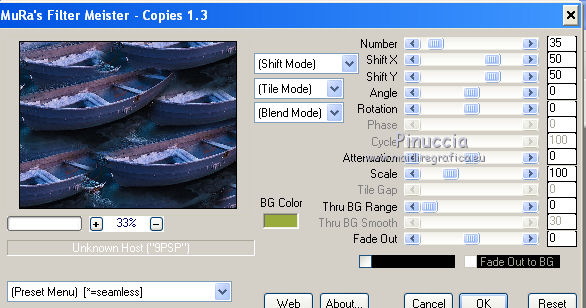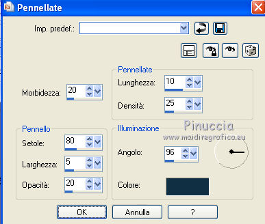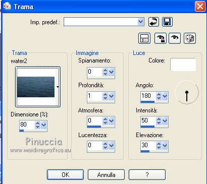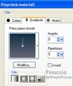 qui puoi trovare qualche risposta ai tuoi dubbi. Se l'argomento che ti interessa non è presente, ti prego di segnalarmelo. Per tradurre questo tutorial ho usato PSP X, ma può essere eseguito anche con le altre versioni di PSP. Questo tutorial è una creazione di ©Sietskes e non può essere copiato su altri siti nè essere offerto per il download. Lo stesso vale per la mia traduzione. Il materiale viene da vari gruppi di condivisione. Il copyright appartiene ai rispettivi autori. Grazie ai creatori dei tubes che mettono a disposizione il loro lavoro in vari gruppi di condivisione. Occorrente: Materiale qui I tubes sono di Anna.br, Manouche e Reveries. Rispetta il lavoro degli autori, non cambiare il nome del file e non cancellare il watermark. Filtri: in caso di dubbi, ricorda di consultare la mia sezione filtri qui Mura's Meister - Copies qui Ti servirà anche Animation Shop qui ![]() Metti l'immagine water2 nella cartella Trame. Imposta il colore di primo piano con #656675, e il colore di sfondo con #132f43. Passa il colore di primo piano a Gradiente lineare. ![]() 1. Apri una nuova immagine trasparente 650 x 500 pixels, e riempila con il gradiente.Apri il tube fishing's_over e vai a Modifica>Copia. Torna al tuo lavoro e vai a Modifica>Incolla come nuovo livello. Effetti>Plugins>Mura's Meister - Copies. ![]() Regola>Sfocatura>Sfocatura gaussiana - raggio 15. ![]() Effetti>Effetti tecniche di disegno>Pennellate, con il colore di sfondo. ![]() Abbassa l'opacità di questo livello al 50%. Apri il tube site_paysages_1220640313_paysages e vai a Modifica>Copia. Torna al tuo lavoro e vai a Modifica>Incolla come nuovo livello. Spostalo un po' più in alto.Apri il tube anna.br_entardecer e vai a Modifica>Copia. Torna al tuo lavoro e vai a Modifica>Incolla come nuovo livello. Sposta il tube un po' più in basso in modo da allineare le linee d'acqua dei due tubes.Livelli>Disponi>Sposta giù. ![]() Livelli>Unisci>Unisci tutto. Immagine>Aggiungi bordatura, 1 pixel, simmetriche, con il colore di sfondo. Immagine>Aggiungi bordatura, 1 pixel, simmetriche, con il colore di primo piano. Immagine>Aggiungi bordatura, 1 pixel, simmetriche, con il colore di sfondo. Livelli>Duplica. Immagine>Ridimensiona, al 90%, tutti i livelli non selezionato. Effetti>Effetti 3D>Sfalsa ombra, con il colore nero. ![]() Ripeti l'Effetto Sfalsa ombra, cambiando verticale e orizzontale con -5. Attiva nuovamente il tube fishing's over e vai a Modifica>Copia. Torna al tuo lavoro e vai a Modifica>Incolla come nuovo livello. Spostalo in basso.![]() Apri il tube anna.br_voyageuse_21-9-10.psp e vai a Modifica>Copia. Torna al tuo lavoro e vai a Modifica>Incolla come nuovo livello. Spostalo sul bordo inferiore.Effetti>Effetti 3D>Sfalsa ombra, con il colore nero. ![]() Aggiungi il tuo nome e/o il tuo watermark su un nuovo livello. Attiva il livello della copia di sfondo. Attiva lo strumento Selezione a mano libera , da punto a punto, sfumatura e tolleranza 0,e seleziona la parte dell'acqua intorno alla barca. ![]() Effetti>Effetti di trama>Trama - seleziona la trama water2 con i seguenti settaggi. ![]() Selezione>Deseleziona. Modifica>Copia Unione. Apri Animation Shop e vai a Modifica>Incolla>Incolla come nuova animazione. Torna in PSP. Modifica>Annulla azione Deseleziona. Modifica>Annulla azione Trama. Ripeti l'Effetto Trama portando la dimensione a 80. ![]() Selezione>Deseleziona. Attiva il livello della barca. Immagine>Ruota per gradi - 0,30 gradi a destra. ![]() Modifica>Copia Unione. Torna in Animaton Shop e vai a Modifica>Incolla>Incolla dopo il fotogramma corrente. Di nuovo in PSP. Modifica>Annulla azione Ruota. Modifica>Annulla azione Selezione livello. Modifica>Annulla azione Deseleziona. Modifica>Annulla azione Trama. Ripeti l'Effetto Trama portando la dimensione a 60. Selezione>Deseleziona. Modifica>Copia Unione. In Animation Shop: Modifica>Incolla>Incolla dopo il fotogramma corrente. In PSP. Modifica>Annulla azione Deseleziona. Modifica>Annulla azione Trama. Ripeti l'Effetto Trama, portando la dimensione a 40. Selezione>Deseleziona. Attiva il livello della barca. Immagine>Ruota per gradi - 0,30 a sinistra. ![]() Ed ecco la tua animazione composta da 4 fotogrammi. Modifica>Seleziona tutto. Animazione>Proprietà fotogramma, e imposta la velocità a 35. ![]() Controlla il risultato cliccando su Visualizza e salva in formato gif.![]() Se hai problemi o dubbi, o trovi un link non funzionante, o anche soltanto per un saluto, scrivimi 20 Febbraio 2011 |