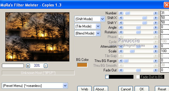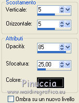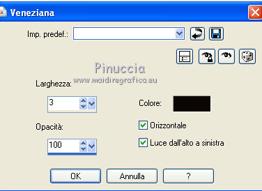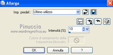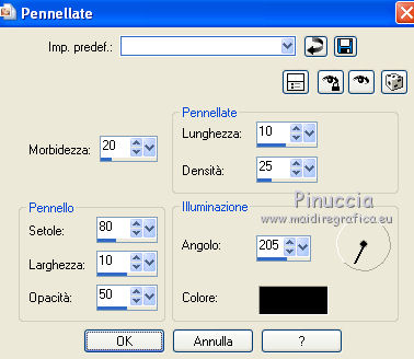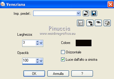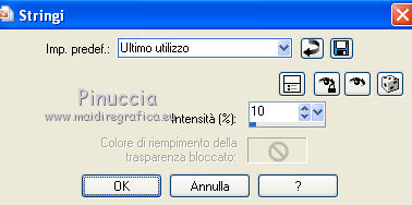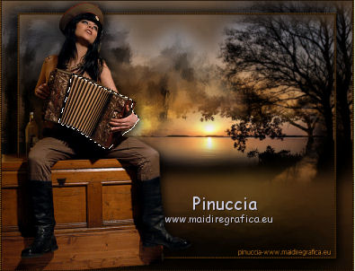 qui puoi trovare qualche risposta ai tuoi dubbi. Se l'argomento che ti interessa non è presente, ti prego di segnalarmelo. Per tradurre questo tutorial ho usato PSP X, ma può essere eseguito anche con le altre versioni di PSP. Questo tutorial è una creazione di ©Sietskes e non può essere copiato su altri siti nè essere offerto per il download. Lo stesso vale per la mia traduzione. Il materiale viene da vari gruppi di condivisione. Il copyright appartiene ai rispettivi autori. Grazie ai creatori dei tubes che mettono a disposizione il loro lavoro in vari gruppi di condivisione. Occorrente: Materiale qui I tubes sono di Marif, Friedrich Fruehling e Nurso. Rispetta il lavoro degli autori, non cambiare il nome del file e non cancellare il watermark. Filtri: in caso di dubbi, ricorda di consultare la mia sezione filtri qui Mura's Meister - Copies qui Ti servirà anche Animation Shop qui ![]() Imposta il colore di primo piano con #0f0904, e il colore di sfondo con #c57a22. 1. Apri una nuova immagine trasparente 650 x 500 pixels, e riempila con il colore di primo piano.Apri il tube mds10882_A_winter_Evening_Winterabend_210561 e vai a Modifica>Copia. Torna al tuo lavoro e vai a Modifica>Incolla come nuovo livello. Effetti>Plugins>Mura's Meister - Copies. ![]() Regola>Sfocatura>Sfocatura gaussiana - raggio 50. ![]() Effetti>Effetti tecniche di disegno>Pennellate: ![]() Modifica>Incolla come nuovo livello (il tube mds10882_A_winter_Evening_Winterabend_210561 è ancora in memoria). Sposta il tube in alto a destra.Livelli>Duplica. Immagine>Rifletti. Effetti>Effetti tecniche di disegno>Pennellate, con i settaggi precedenti. Apri il tube Marif_2006_octobre_misted_paysage034 e vai a Modifica>Copia. Torna al tuo lavoro e vai a Modifica>Incolla come nuovo livello. Immagine>Rifletti. Lascia il tube come sta. Non occorre spostarlo. Livelli>Unisci>Unisci tutto. Immagine>Aggiungi bordatura, 3 pixels, simmetriche, con il colore di sfondo. Seleziona questo bordo con la bacchetta magica ![]() Effetti>Effetti di trama>Veneziana, con il colore di primo piano. ![]() Ripeti l'Effetto Veneziana, togliendo la selezione a Orizzontale. ![]() Selezione>Deseleziona. Livelli>Duplica. Immagine>Ridimensiona, al 90%, tutti i livelli non selezionato. Effetti>Effetti 3D>Sfalsa ombra, con il colore nero. ![]() Ripeti l'Effetto Sfalsa ombra, cambiando verticale e orizzontale con -5. Apri il tube NS_118_0909 e vai a Modifica>Copia. Torna al tuo lavoro e vai a Modifica>Incolla come nuovo livello. Spostalo nell'angolo in basso a sinistra.Effetti>Effetti 3D>Sfalsa ombra, con il colore nero. ![]() Attiva il livello inferiore. Selezione>Seleziona tutto. Selezione>Modifica>Contrai - 3 pixels. Selezione>Inverti. Attiva il livello della donna e premi sulla tastiera il tasto CANC. Selezione>Deseleziona. Aggiungi il tuo nome e/o il tuo watermark su un nuovo livello. Modifica>Copia Unione. Apri Animation Shop e vai a Modifica>Incolla>Incolla come nuova animazione. Modifica>Incolla>Incolla dopo il fotogramma corrente. E adesso la tua animazione ha 2 fotogrammi. Torna in PSP. Attiva il livello della donna. Attiva lo strumento Selezione a mano libera , da punto a punto,e seleziona il mantice della fisarmonica con la mano della donna: ![]() Effetti>Effetti di distorsione>Allarga. ![]() Selezione>Deseleziona. Modifica>Copia Unione. Torna in Animaton Shop e vai a Modifica>Incolla>Incolla dopo il fotogramma corrente. Ripeti Modifica>Incolla>Incolla dopo il fotogramma corrente. E adesso la tua animazione ha 4 fotogrammi. Torna in PSP. Modifica>Annulla azione Deseleziona. Modifica>Annulla azione Allarga. Effetti>Effetti di distorsione>Stringi. ![]() Selezione>Deseleziona. Modifica>Copia Unione. In Animation Shop: clicca sull'ultimo fotogramma e vai a Modifica>Incolla>Incolla dopo il fotogramma corrente. Ripeti Modifica>Incolla>Incolla dopo il fotogramma corrente. Adesso la tua animazione ha 6 fotogrammi. Modifica>Seleziona tutto. Modifica> Copia. Clicca sull'ultimo fotogramma e vai a Modifica>Incolla>Incolla dopo il fotogramma corrente. Ed ecco la tua animazione finale composta da 12 fotogrammi. Clicca sul primo fotogramma per selezionarlo e vai a Modifica>Seleziona tutto. Apri la gif notes020, anche questa composta da 12 fotogrammi. Modifica>Seleziona tutto. Modifica>Copia. Attiva il tuo lavoro e vai a Modifica>Incolla>Incolla nel fotogramma selezionato. Posiziona le note accanto alla fisarmonica e, quando sei certo di aver trovato la posizione corretta, rilascia il tasto del mouse. Animazione>Proprietà fotogramma, e imposta la velocità a 25. ![]() Controlla il risultato cliccando su Visualizza e salva in formato gif.![]() Se hai problemi o dubbi, o trovi un link non funzionante, o anche soltanto per un saluto, scrivimi 23 Febbraio 2011 |