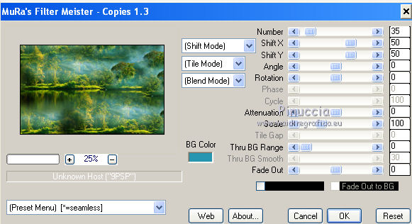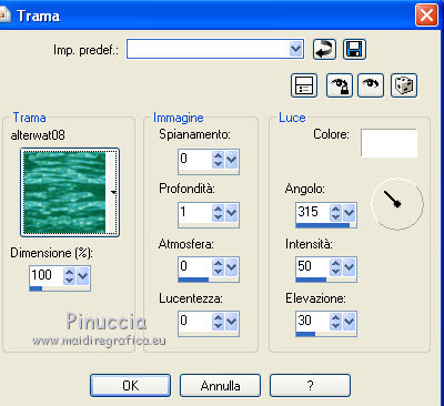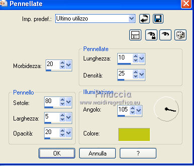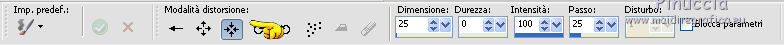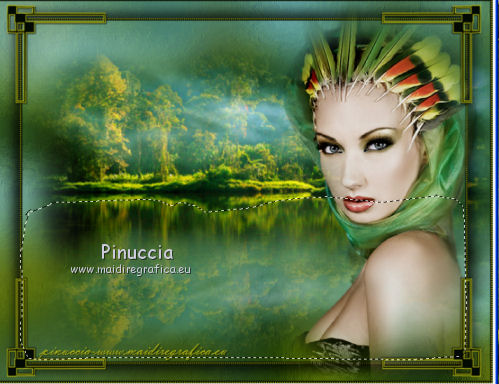 qui puoi trovare qualche risposta ai tuoi dubbi. Se l'argomento che ti interessa non è presente, ti prego di segnalarmelo. Per tradurre questo tutorial ho usato PSP X, ma può essere eseguito anche con le altre versioni di PSP. Questo tutorial è una creazione di ©Sietskes e non può essere copiato su altri siti nè essere offerto per il download. Lo stesso vale per la mia traduzione. Il materiale viene da vari gruppi di condivisione. Il copyright appartiene ai rispettivi autori. Grazie ai creatori dei tubes che mettono a disposizione il loro lavoro in vari gruppi di condivisione. Occorrente: Materiale qui I tubes sono di Anna.br, Luz Cristina e dell'autrice. Rispetta il lavoro degli autori, non cambiare il nome del file e non cancellare il watermark. Filtri: in caso di dubbi, ricorda di consultare la mia sezione filtri qui Mura's Meister - Copies qui Ti servirà anche Animation Shop qui ![]() Metti la trama alterwat08 nella cartella Trame. Imposta il colore di primo piano con #c2c715, e il colore di sfondo con #060b04. 1. Apri una nuova immagine trasparente 650 x 500 pixels, e riempila con il colore di primo piano.2. Apri il tube anna.br_misted1025 e vai a Modifica>Copia. Torna al tuo lavoro e vai a Modifica>Incolla come nuovo livello. Effetti>Plugins>Mura's Meister - Copies. ![]() Regola>Sfocatura>Sfocatura gaussiana - raggio 25. ![]() Effetti>Effetti tecniche di disegno>Pennellate, con il colore di primo piano: ![]() Attiva nuovamente il tube anna.br_misted1025 e vai a Modifica>Copia. Torna al tuo lavoro e vai a Modifica>Incolla come nuovo livello. Immagine>Ridimensiona, all'85%, tutti i livelli non selezionato. Sposta il tube in alto.4. Livelli>Duplica. Attiva il livello sottostante dell'originale. Immagine>Capovolgi e abbassa l'opacità di questo livello al 50%. ![]() Livelli>Unisci>Unisci tutto. 5. Immagine>Aggiungi bordatura, 5 pixels, simmetriche, con il colore di primo piano. Seleziona questo bordo con la bacchetta magica ![]() Effetti>Effetti di trama>Veneziana, con il colore nero. ![]() Ripeti l'Effetto Veneziana, togliendo la selezione a Orizzontale. ![]() Selezione>Deseleziona. 6. Livelli>Duplica. Immagine>Ridimensiona, al 90%, tutti i livelli non selezionato. Effetti>Effetti 3D>Sfalsa ombra, con il colore nero. ![]() Ripeti l'Effetto Sfalsa ombra, cambiando verticale e orizzontale con -5. 7. Apri il tube 2243-luzcristina e vai a Modifica>Copia. Torna al tuo lavoro e vai a Modifica>Incolla come nuovo livello. Spostalo a destra, vicino al bordo.8. Apri il tube Corner_2011_green e vai a Modifica>Copia. Torna al tuo lavoro e vai a Modifica>Incolla come nuovo livello. Spostalo nell'angolo in alto a sinistra.Effetti>Effetti 3D>Sfalsa ombra, con il colore nero. ![]() Livelli>Duplica. Immagine>Rifletti. Livelli>Unisci>Unisci giù. Livelli>Duplica. Immagine>Capovolgi. Livelli>Unisci>Unisci giù. Aggiungi il tuo nome e/o il tuo watermark su un nuovo livello. 10. Attiva il livello della copia dello sfondo. Attiva lo strumento Selezione a mano libera , da punto a punto, sfumatura e tolleranza 0,e seleziona l'area dell'acqua. ![]() Effetti>Effetti di trama>Trama - selezione la trama alterwat08, Dimensione 100. ![]() Selezione>Deseleziona. Modifica>Copia Unione. Apri Animation Shop e vai a Modifica>Incolla>Incolla come nuova animazione. Torna in PSP. Modifica>Annulla azione Deseleziona. Modifica>Annulla azione Trama. Ripeti Effetti>Effetti di trama>Trama, cambiando soltanto la dimensione con 90. Selezione>Deseleziona. Modifica>Copia Unione. Torna in Animaton Shop e vai a Modifica>Incolla>Incolla dopo il fotogramma corrente. In PSP. Modifica>Annulla azione Deseleziona. Modifica>Annulla azione Trama. Ripeti l'Effetto Trama, cambiando la dimensione con 80. Selezione>Deseleziona. Modifica>Copia Unione. In Animation Shop: Modifica>Incolla>Incolla dopo il fotogramma corrente. In PSP. Modifica>Annulla azione Deseleziona. Modifica>Annulla azione Trama. Ripeti l'Effetto Trama cambiando la dimensione con 70. Selezione>Deseleziona. Attiva il livello della donna. Attiva lo strumento Pennello distorsione , modalità Contrai:con i seguenti settaggi: ![]() Clicca una volta sulle pupille degli occhi. Modifica>Copia Unione. In Animation Shop: Modifica>Incolla>Incolla dopo il fotogramma corrente. In PSP. Sei ancora sul livello del tube della donna, con il pennello distorsione attivo. Clicca di nuovo una volta sulle pupille degli occhi. Modifica>Copia Unione. In Animation Shop: Modifica>Incolla>Incolla dopo il fotogramma corrente. Modifica>Seleziona tutto. Animazione>Proprietà fotogramma, e imposta la velocità a 30. ![]() Clicca sul fotogramma 4 per selezionarlo, poi tenendo premuto il tasto della maiuscola clicca sul fotogramma 5. In questo modo hai selezionato soltanto questi due fotogrammi e soltanto questi due fotogrammi hanno la cornice blu. Animazione>Proprietà fotogramma e imposta la velocità a 15. ![]() Controlla il risultato cliccando su Visualizza e salva in formato gif.![]() Se hai problemi o dubbi, o trovi un link non funzionante, o anche soltanto per un saluto, scrivimi 19 Febbraio 2011 |