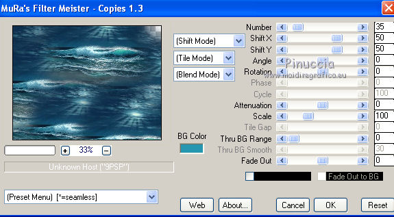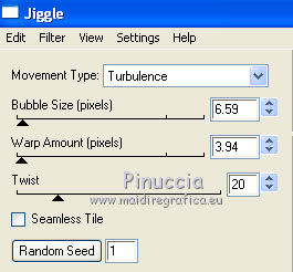qui puoi trovare qualche risposta ai tuoi dubbi. Se l'argomento che ti interessa non è presente, ti prego di segnalarmelo. Per tradurre questo tutorial ho usato PSP X, ma può essere eseguito anche con le altre versioni di PSP. Questo tutorial è una creazione di ©Sietskes e non può essere copiato su altri siti nè essere offerto per il download. Lo stesso vale per la mia traduzione. Il materiale viene da vari gruppi di condivisione. Il copyright appartiene ai rispettivi autori. Grazie ai creatori dei tubes che mettono a disposizione il loro lavoro in vari gruppi di condivisione. Occorrente: Materiale qui I tubes sono di Walfrido, Nurso, Caro, Nini e dell'autrice. Rispetta il lavoro degli autori, non cambiare il nome del file e non cancellare il watermark. Filtri: in caso di dubbi, ricorda di consultare la mia sezione filtri qui Mura's Meister - Copies qui Eye Candy 4000 - Jiggle qui Ti servirà anche Animation Shop qui ![]() Imposta il colore di primo piano con #234352, e il colore di sfondo con #2696b1. 1. Apri una nuova immagine trasparente 650 x 500 pixels, e riempila con il colore di primo piano.2. Apri il tube walfrido_the_glory_revealed_clean_TbS.psp e vai a Modifica>Copia. Torna al tuo lavoro e vai a Modifica>Incolla come nuovo livello. Effetti>Plugins>Mura's Meister - Copies. ![]() Regola>Sfocatura>Sfocatura gaussiana - raggio 15. ![]() Apri il tube NS_154_3011_09[1] e vai a Modifica>Copia. Torna al tuo lavoro e vai a Modifica>Incolla come nuovo livello. Spostalo contro il bordo superiore.Livelli>Duplica. Immagine>Capovolgi e posizionalo contro l'originale.Apri il tube caro3003 e vai a Modifica>Copia. Torna al tuo lavoro e vai a Modifica>Incolla come nuovo livello. Sposta il tube in basso.Apri il tube Zon e vai a Modifica>Copia. Torna al tuo lavoro e vai a Modifica>Incolla come nuovo livello. Immagine>Rifletti. Spostalo in alto a destra.Livelli>Unisci>Unisci tutto. ![]() Immagine>Aggiungi bordatura, 1 pixel, simmetriche, con il colore di primo piano. Immagine>Aggiungi bordatura, 1 pixel, simmetriche, con il colore di sfondo. Immagine>Aggiungi bordatura, 1 pixel, simmetriche, con il colore di primo piano. Livelli>Duplica. Immagine>Ridimensiona, al 90%, tutti i livelli non selezionato. Effetti>Effetti 3D>Sfalsa ombra, con il colore nero. ![]() Ripeti l'Effetto Sfalsa ombra, cambiando verticale e orizzontale con -5. Attiva nuovamente il tube caro3003 e vai a Modifica>Copia. Torna al tuo lavoro e vai a Modifica>Incolla come nuovo livello. Spostalo in basso.Apri il tube Nini_Tube_Water_Dress e vai a Modifica>Copia. Torna al tuo lavoro e vai a Modifica>Incolla come nuovo livello. Posiziona il tube come preferisci o vedi il mio esempio.Effetti>Effetti 3D>Sfalsa ombra, con il colore nero. ![]() Aggiungi il tuo nome e/o il tuo watermark su un nuovo livello. Attiva il livello della donna. Attiva lo strumento Selezione a mano libera , da punto a punto, sfumatura e tolleranza 0,e seleziona la parte colorata del tube, compresi gli schizzi d'acqua. ![]() Effetti>Plugins>Eye Candy 4000 - Jiggle - Turbulence, con i seguenti settaggi. ![]() Selezione>Deseleziona. Attiva il livello sottostante (il tube con le onde). Ripeti l'Effetto Jiggle con gli stessi settaggi. Modifica>Copia Unione. Apri Animation Shop e vai a Modifica>Incolla>Incolla come nuova animazione. Torna in PSP. Modifica>Annulla azione Jiggle. Modifica>Annulla azione Selezione livello. Modifica>Annulla azione Deseleziona. Modifica>Annulla azione Jiggle. E sei nuovamente sul livello della donna con la selezione attiva. Ripeti l'Effetto Jiggle, cliccando una volta su Random Seed. Selezione>Deseleziona. Attiva il livello delle onde. Ripeti l'Effetto Jiggle con gli stessi settaggi. Modifica>Copia Unione. Torna in Animaton Shop e vai a Modifica>Incolla>Incolla dopo il fotogramma corrente. Di nuovo in PSP. Modifica>Annulla azione Jiggle. Modifica>Annulla azione Selezione livello. Modifica>Annulla azione Deseleziona. Modifica>Annulla azione Jiggle. E sei nuovamente sul livello della donna con la selezione attiva. Ripeti l'Effetto Jiggle, cliccando una volta su Random Seed. Selezione>Deseleziona. Attiva il livello delle onde. Ripeti l'Effetto Jiggle con gli stessi settaggi. Modifica>Copia Unione. In Animation Shop: Modifica>Incolla>Incolla dopo il fotogramma corrente. In PSP. Modifica>Annulla azione Jiggle. Modifica>Annulla azione Selezione livello. Modifica>Annulla azione Deseleziona. Modifica>Annulla azione Jiggle. E sei nuovamente sul livello della donna con la selezione attiva. Ripeti l'Effetto Jiggle, cliccando una volta su Random Seed. Selezione>Deseleziona. Attiva il livello delle onde. Ripeti l'Effetto Jiggle con gli stessi settaggi. Modifica>Copia Unione. In Animation Shop: Modifica>Incolla>Incolla dopo il fotogramma corrente. Ed ecco la tua animazione composta da 4 fotogrammi. Modifica>Seleziona tutto. Animazione>Proprietà fotogramma, e imposta la velocità a 20. ![]() Controlla il risultato cliccando su Visualizza e salva in formato gif.![]() Se hai problemi o dubbi, o trovi un link non funzionante, o anche soltanto per un saluto, scrivimi 19 Febbraio 2011 |