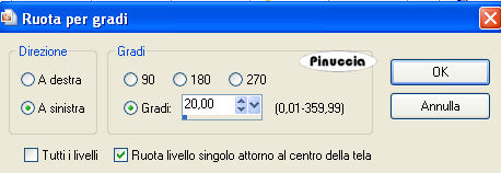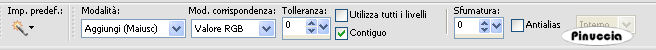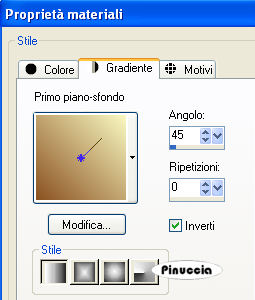 qui puoi trovare qualche risposta ai tuoi dubbi. Se l'argomento che ti interessa non è presente, ti prego di segnalarmelo. Questo tutorial è stato creato con PSP 9, ma può essere eseguito anche con le altre versioni di PSP. Per tradurlo, ho usato PSP X. Occorrente: Materiale qui Lo scrapkit usato per questo tutorial è "My Family Tree" di BluedreamDesigns. Apri i tubes in PSP. Duplicali usando sulla tastiera la combinazione di tasti shift(maiuscola)+D e chiudi gli originali. 1. Apri una nuova immagine trasparente 700 x 600 pixels. Selezione>Seleziona tutto. Dallo scrapkit apri "BD-My Family Tree-Paper 2" e vai a Modifica>Copia. Torna al tuo lavoro e vai a Modifica>Incolla nella selezione. Livelli>Nuovo livello raster. Effetti>Effetti 3D>Ritaglio: ![]() Selezione>Deseleziona. 2. Dallo scrapkit, apri "BD-My Family Tree-Paper3" e vai a Modifica>Copia. Torna al tuo lavoro e vai a Modifica>Incolla come nuovo livello. Immagine>Ridimensiona, all'80%, tutti i livelli non selezionato. ![]() Effetti>Effetti 3D>Sfalsa ombra: ![]() Ripeti l'Effetto Sfalsa ombra, cambiando verticale e orizzontale con -5. Immagine>Ruota per gradi - 20 gradi a sinistra: ![]() Sposta questo livello in alto a sinistra.Livelli>Duplica. Immagine>Rifletti. Immagine>Ridimensiona, all'80%, tutti i livelli non selezionato. Sposta le due carte come nell'esempio.![]() 3. Dallo scrapkit apri "BD-My Family Tree-Frame 5" e vai a Modifica>copia. Torna al tuo lavoro e vai a Modifica>Incolla come nuovo livello. Immagine>Ridimensiona, al 60%, tutti i livelli non selezionato. Regola>Messa a fuoco>Metti a fuoco. Effetti>Effetti 3D>Smusso a incasso. ![]() 4. Scegli due colori dal tube. Imposta il colore chiaro come colore di primo piano e il colore scuro come colore di sfondo. Passa il colore di primo piano a Gradiente di primo piano/sfondo, con i seguenti settaggi. ![]() Attiva lo strumento Bacchetta magica con i seguenti settaggi:![]() clicca all'interno della cornice di sinistra per selezionarla. Selezione>Modifica>Espandi - 3 pixels. Livelli>Nuovo livello raster. Riempi la selezione con il gradiente.Apri il tube con il viso "kwr525" e vai a Modifica>Copia. Torna al tuo lavoro e vai a Modifica>Incolla come nuovo livello. Immagine>Ridimensiona, al 70%, tutti i livelli non selezionato. Sistema il tube nella selezione.![]() Cambia la modalità di miscelatura di questo livello in Luminanza (esistente). Selezione>Inverti. Premi sulla tastiera il tasto CANC ![]() Selezione>Deseleziona. Livelli>Unisci>Unisci giù. Nella paletta dei livelli trascina questo livello sotto il livello della cornice. ![]() Attiva nuovamente il livello superiore. Clicca con la bacchetta magica sulla cornice a destra.Selezione>Modifica>Espandi - 3 pixels. Livelli>Nuovo livello raster. Riempi la selezione con il gradiente.Apri il tube con il paesaggio "M.Sandritter 08_T_M_373" e vai a Modifica>Copia. Torna al tuo lavoro vai a Modifica>Incolla come nuovo livello. Immagine>Ridimensiona, al 40%, tutti i livelli non selezionato. Posiziona il tube nella selezione.Cambia la modalità di miscelatura in luminanza (esistente). Selezione>Inverti. Premi sulla tastiera il tasto CANC. Selezione>Deseleziona. Livelli>Unisci>Unisci giù. Nella paletta dei livelli trascina questo livello sotto il livello della cornice. Attiva il livello della cornice. Livelli>Unisci>Unisci giù, 2 volte, e avrai cornice e tubes in un unico livello. ![]() Effetti>Effetti 3D>Sfalsa ombra, con i settaggi precedenti (compresa la ripetizione con -5). Immagine>Ruota per gradi - 20 gradi a sinistra: ![]() Regola>Messa a fuoco>Metti a fuoco. Sposta le cornici come nel mio esempio.5. Apri il tube "BD-My Family Tree-Lace" e vai a Modifica>copia. Torna al tuo lavoro e vai a Modifica>Incolla come nuovo livello. Immagine>Ridimensiona, al 40%, tutti i livelli non selezionato. Immagine>Ruota per gradi - 20 gradi a sinistra. ![]() Regola>Messa a fuoco>Metti a fuoco. Effetti>Effetti 3D>Sfalsa ombra, con i settaggi precedenti (compresa la ripetizione a -5). Livelli>Duplica. Posiziona i due nastri ai lati delle cornici.Attiva il livello superiore. Livelli>Unisci>Unisci giù, 2 volte. 6. Dallo scrapkit apri il tube "BD-My Family Tree-Wrap" e vai a Modifica>Copia. Torna al tuo lavoro e vai a Modifica>Incolla come nuovo livello. Immagine>Capovolgi. Sposta il tube in basso.Attiva lo strumento Puntatore ![]() deformazione se stai usando PSP 9,e allarga il nastro per tutta la larghezza della tela. Effetti>Effetti 3D>Sfalsa ombra, con i settaggi precedenti. 7. Dallo scrapkit apri "BD-My Family Tree-Flower1" e vai a Modifica>copia. Torna al tuo lavoro e vai a Modifica>Incolla come nuovo livello. Immagine>Ridimensiona, al 40%, tutti i livelli non selezionato. Regola>Messa a fuoco>Metti a fuoco. Effetti>Effetti 3D>Sfalsa ombra, con i settaggi precedenti. Sposta il fiore sopra il fiocco del nastro.8. Aggiungi altri ornamenti al tuo lavoro, usando le foglie e gli altri tube dello scrapkit. Ridimensiona, se e quanto necessario, e ricordati di aggiungere l'Effetto Sfalsa ombra. Per concludere, aggiungi un testo e il tuo watermark. Quando hai finito: Livelli>Unisci>Unisci tutto. Immagine>Aggiungi bordatura, 1 pixel, simmetriche, con il colore scuro di sfondo. Salva in formato jpg. Se hai problemi o dubbi, o trovi un link non funzionante, o anche soltanto per un saluto, scrivimi. 15 Ottobre 2008 |
