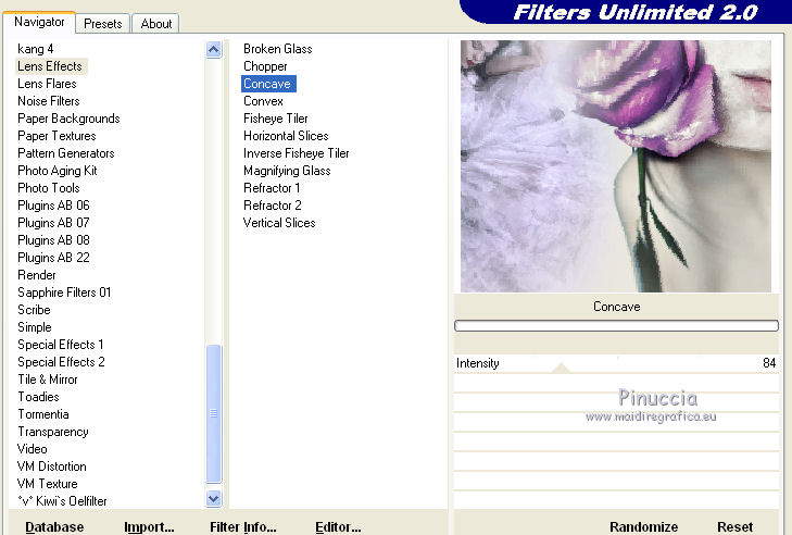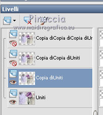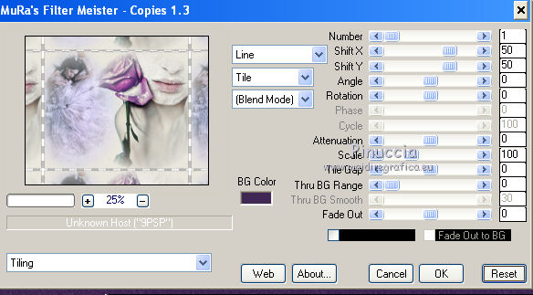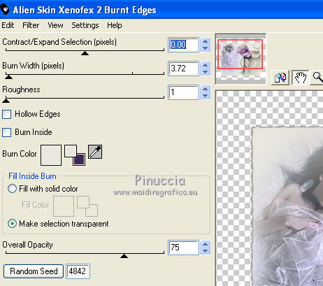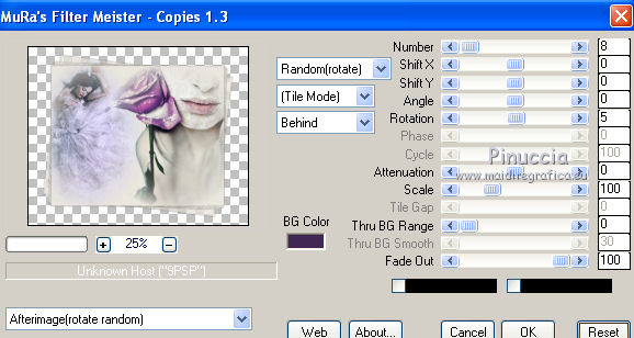 Se intendi usare il font, aprilo e minimizzalo. Lo troverai nella lista dei font disponibili quando ti servirà. ![]() 1. Apri una nuova immagine trasparente 800 x 650 pixels. Scegli due colori delle tue immagini. Per il mio esempio: colore di primo piano #eae7de; colore di sfondo #402754. Riempi l'immagine trasparente con uno dei due colori.Per il mio esempio ho usato il colore di primo piano. Apri il tube "elliwoman167" e vai a Modifica>Copia. Torna al tuo lavoro e vai a Modifica>Incolla come nuovo livello. Livelli>Carica/Salva maschera>Carica maschera da disco. Cerca e carica la maschera 20-20. ![]() Livelli>Unisci>Unisci gruppo. Sposta il viso a destra, contro il bordo.![]() Poichè il tube ha un colore troppo pallido (ma è una questione di gusto: è facoltativa la scelta di questo passaggio): Livelli>Duplica. Livelli>Unisci>Unisci giù. 2. Apri il tube "Sweet Dreams2 Asuka-misted tube of a PSP Devil" e vai a Modifica>Copia. Torna al tuo lavoro e vai a Modifica>Incolla come nuovo livello. Livelli>Carica/Salva maschera>Carica maschera da disco. Carica nuovamente la maschera 20-20 con i settaggi precedenti. Livelli>Unisci>Unisci gruppo. Immagine>Rifletti. Sposta il tube a sinistra.Livelli>Disponi>Sposta giù. Livelli>Unisci>Unisci visibile. ![]() 3. Livelli>Duplica. Immagine>Ridimensiona, all'80%, tutti i livelli non selezionato, dimensione ottimale. ![]() Regola>Messa a fuoco>Metti a fuoco. 4. Attiva il livello inferiore. Effetti>Plugins>Filters Unlimited 2.0 - Lens Effects - Concave. ![]() 5. Attiva nuovamente il livello superiore. Effetti>Plugins>Alien Skin Xenofex 2 - Burnt Edges. ![]() Livelli>Duplica - 2 volte. 6. Chiudi i livelli superiori e attiva il livello "copia di Uniti". ![]() Effetti>Plugins>Mura's Meister - Copies. ![]() ricorda che "Random" significa "casuale" per questo motivo il tuo risultato sarà sicuramente diverso dal mio 7. Apri e attiva il livello successivo - Copia 2 di Uniti. Immagine>Ridimensiona, al 50%, tutti i livelli non selezionato. ![]() Regola>Messa a fuoco>Metti a fuoco. Immagine>Ruota per gradi - 15 gradi a destra. ![]() Sposta l'immagine nell'angolo in basso a sinistra.Regola>Messa a fuoco>Metti a fuoco. Effetti>Effetti 3D>Sfalsa ombra: ![]() 8. Apri e attiva il livello successivo - Copia 3 di Uniti. Effetti>Plugins>Mura's Meister - Copies. ![]() Attiva lo strumento Selezione , rettangolo,e seleziona l'interno dell'immagine. ![]() Premi sulla tastiera il tasto CANC. Selezione>Deseleziona. Immagine>Ridimensiona, al 115%, tutti i livelli non selezionato. ![]() Regola>Messa a fuoco>Metti a fuoco. Effetti>Effetti 3D>Sfalsa ombra: ![]() 9. Apri il tube del fiocco "Deco_027" e vai a Modifica>Copia. Torna al tuo lavoro e vai a Modifica>Incolla come nuovo livello. Immagine>Ridimensiona, al 70%, tutti i livelli non selezionato, dimensione ottimale. ![]() Regola>Messa a fuoco>Metti a fuoco. Effetti>Effetti 3D>Sfalsa ombra. ![]() Spostalo nell'angolo in basso a destra.Livelli>Duplica. Immagine>Rifletti. Sposta questo fiocco nell'angolo in alto a sinistra.10. Aggiungi il tuo nome e/o il tuo watermark su un nuovo livello. 11. Attiva lo strumento Testo , font Windsong.regola la dimensione in base al tuo testo e alla versione di PSP che stai usando. ![]() Chiudi il colore di primo piano e scrivi il tuo testo. Posizionalo e/o ruotalo come preferisci. Livelli>Duplica, e attiva il livello sottostante dell'originale. Immagine>Ridimensiona, al 105%, tutti i livelli non selezionato, dimensione ottimale. ![]() Effetti>Plugins>Alien Skin Xenofex 2 - Constellation, attenzione è selezionato Make selection transparent. ![]() Modifica>Copia Unione. Apri Animation Shop e vai a Modifica>Incolla>Incolla come nuova animazione. Torna in PSP. Modifica>Annulla azione Constellation. Ripeti l'Effetto Constellation, con gli stessi settaggi, ma cliccando una volta su Random Seed. Modifica>Copia Unione. Torna in Animation Shop e vai a Modifica>Incolla>Incolla dopo il fotogramma corrente. Di nuovo in PSP. Modifica>Annulla azione Constellation. Ripeti l'Effetto Constellation, cliccando una volta su Random Seed. Modifica>Copia Unione. In Animation Shop: Modifica>Incolla>Incolla dopo il fotogramma corrente. Controlla il risultato cliccando su Visualizza e salva in formato gif.