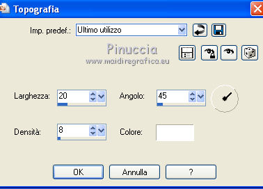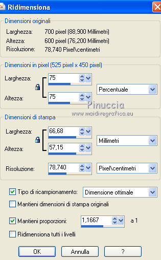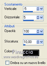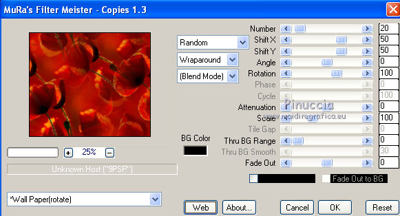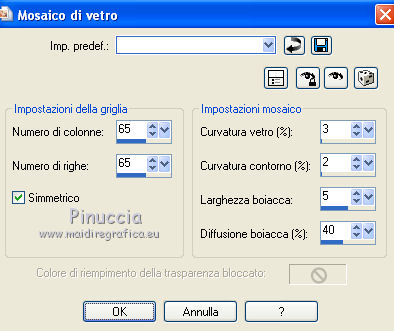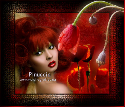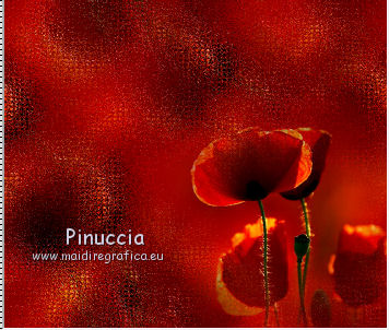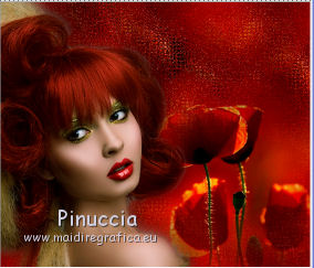 Se intendi usare il font, aprilo e minimizzalo. Lo troverai nella lista dei font disponibili quando ti servirà. ![]() 1. Apri una nuova immagine trasparente 700 x 600 pixels. Scegli dai tuoi tubes due colori e imposta il colore chiaro come colore di primo piano (il mio #9a0000), e il colore scuro come colore di sfondo (il mio #000000). Riempi l'immagine trasparente con il colore nero di sfondo (tasto destro del mouse).Chiudi questo livello. Livelli>Nuovo livello raster. Selezione>Seleziona tutto. Apri la tua immagine di sfondo - la mia k@rine_dreams_Misted_Flowers_1068_AVRIL_2010" e vai a Modifica>Copia. Torna al tuo lavoro e vai a Modifica>Incolla nella selezione. Selezione>Deseleziona. Effetti>Plugins>Mura's Meister - Copies. ![]() Effetti>Effetti artistici>Topografia. ![]() Effetti>Effetti di trama>Mosaico di vetro. ![]() 2. Modifica>Incolla come nuovo livello (il tube dei fiori è ancora in memoria). Immagine>Ridimensiona, all'80%, tutti i livelli non selezionato. Sposta il tube in basso a destra.![]() 3. Apri il tube della donna e vai a Modifica>Copia. Torna al tuo lavoro e vai a Modifica>Incolla come nuovo livello. (Se stai usando un altro tube, se necessario, ridimensiona; per quello fornito non è necessario). Sposta il tube a sinistra.![]() Livelli>Duplica, e attiva il livello sottostante dell'originale. Regola>Sfocatura>Sfocatura gaussiana - raggio 20. ![]() Attiva il livello superiore. Livelli>Unisci>Unisci giù. 4. Livelli>Unisci>Unisci visibile. (il livello di sfondo è ancora chiuso, mantienilo chiuso). Sei sempre posizionato sul livello Uniti. Immagine>Ridimensiona, al 75%, tutti i livelli non selezionato. ![]() Regola>Messa a fuoco>Metti a fuoco. Livelli>Duplica. Effetti>Effetti 3D>Sfalsa ombra. ![]() Ripeti l'Effetto Sfalsa ombra cambiando verticale e orizzontale con -5%5. ![]() Attiva il livello inferiore dell'originale. Effetti>Effetti di trama>Mosaico di vetro. ![]() Immagine>Ridimensiona, al 110%, tutti i livelli non selezionato. Rinomina questo livello "Cross Shadow". Adesso puoi riaprire il livello di sfondo. 5. Attiva il livello superiore. Apri il tube con il secondo fiore - il mio "calguiscoquelicot23310" - e vai a Modifica>Copia. Torna al tuo lavoro e vai a Modifica>Incolla come nuovo livello. Immagine>Rifletti. Immagine>Ridimensiona, al 90%, tutti i livelli non selezionato. Regola>Messa a fuoco>metti a fuoco. Sposta il tube in alto a destra, come nel mio esempio.![]() Livelli>Duplica, e attiva il livello sottostante dell'originale. Regola>Sfocatura>Sfocatura gaussiana - raggio 20. ![]() Attiva nuovamente il livello superiore della copia. Livelli>Unisci>Unisci giù. 6. Livelli>Nuovo livello raster. Selezione>Seleziona tutto. Riempi la selezione con il colore di primo piano.Selezione>Modifica>Contrai - 5 pixels. ![]() Premi sulla tastiera il tasto CANC. Selezione>Inverti. Effetti>Plugins>Graphics Plus - Cross Shadow, con i settaggi standard. ![]() Effetti>Effetti 3D>Smusso a incasso. ![]() Selezione>Deseleziona. 7. Attiva lo strumento Testo , scegli un font o usa quello fornito,e scrivi un testo sull'immagine (in alternativa, puoi usare il file di testo fornito con il materiale). Aggiungi il tuo nome e/o il tuo watermark su un nuovo livello. 8. Modifica>Copia Unione. Apri Animation Shop e vai a Modifica>Incolla>Incolla come nuova animazione. Torna in PSP. Attiva il livello "cross shadow". Effetti>Plugins>Graphics Plus - Cross Shadow. ![]() Modifica>Copia Unione. Torna in Animation Shop e vai a Modifica>Incolla>Incolla dopo il fotogramma corrente. Modifica>Seleziona tutto. Animazione>Proprietà fotogramma, e imposta la velocità a 15. ![]() Controlla il risultato cliccando su Visualizza e salva in formato gif.