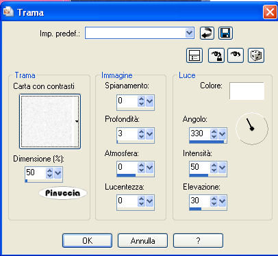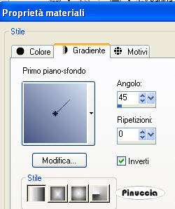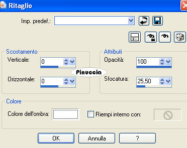 qui puoi trovare qualche risposta ai tuoi dubbi. Se l'argomento che ti interessa non è presente, ti prego di segnalarmelo. Questo tutorial è stato creato con PSP 9, ma può essere eseguito anche con le altre versioni di PSP. Per tradurlo, ho usato PSP X. Questo tutorial è una creazione di ©Sille e non può essere copiato su altri siti nè essere offerto per il download. Lo stesso vale per la mia traduzione. Grazie ai creatori dei tubes che mettono a disposizione il loro lavoro in vari gruppi di condivisione. Rispetta il lavoro degli autori, non cambiare il nome del file e non cancellare il watermark. Occorrente: Materiale qui Filtri: Graphics Plus - Cross Shadow qui Xero - Porcelain qui 1. Apri una nuova immagine trasparente 650 x 500 pixels. Scegli due colori dai tuoi tubes. Imposta il colore chiaro come colore di primo piano, e il colore scuro come colore di sfondo. Passa il colore di primo piano a Gradiente. ![]() Riempi l'immagine trasparente con il gradiente.2. Livelli>Nuovo livello raster. Selezione>Seleziona tutto. Apri il tube di sfondo "MaryAlice_MorningTea" e vai a Modifica>Copia. Torna al tuo lavoro e vai a Modifica>Incolla nella selezione. Abbassa l'opacità di questo livello al 35%. Selezione>Deseleziona. 3. Apri il tube "nv lpr MB diary1996" e vai a Modifica>Copia. Torna al tuo lavoro e vai a Modifica>Incolla come nuovo livello. Immagine>Ridimensiona, al 70%, tutti i livelli non selezionato. Regola>Messa a fuoco>Metti a fuoco. Effetti>Effetti 3D>Sfalsa ombra: ![]() Ripeti l'Effetto Sfalsa ombra, cambiando verticale e orizzontale con -2. Sposta la corona in alto a sinistra.Effetti>Plugins>Xero - Porcelain, con i settaggi standard. ![]() 4. Apri il tube del nastrino "Ac_FStapledGreenRibbon" e vai a Modifica>Copia. Torna al tuo lavoro e vai a Modifica>Incolla come nuovo livello. Immagine>Ridimensiona, 4 volte al 70%, tutti i livelli non selezionato. Regola>Messa a fuoco>Metti a fuoco. Prendi nota dei valori di Tonalità (H) e Saturazione (S) del colore scuro. Il mio: ![]() Regola>Tonalità e Saturazione>Viraggio, e annota i valori annotati nelle rispettive caselle: ![]() Posiziona il nastro sulla corona.Effetti>Effetti 3D>Sfalsa ombra, con i settaggi precedenti. 5. Apri il tube della donna "Cherokee FRBDandilion" e vai a Modifica>Copia. Torna al tuo lavoro e vai a Modifica>Incolla come nuovo livello. Sposta il tube nell'angolo in alto a destra.Aggiungi il tuo nome e/o il tuo watermark su un nuovo livello. 6. Immagine>Aggiungi bordatura, simmetriche non selezionato, con un colore qualsiasi purchè contrastante con quelli del tuo lavoro. ![]() Livelli>Innalza livello di sfondo. Attiva lo strumento Bacchetta magica ![]() e clicca sul bordo per selezionarlo. Riempi la selezione con il gradiente.Effetti>Effetti di trama>Trama - seleziona la trama Carta con contrasti: ![]() Livelli>Nuovo livello Raster. Effetti>Effetti 3D>Ritaglio: ![]() Selezione>inverti. Livelli>Nuovo livello raster. Ripeti l'Effetto Ritaglio con gli stessi settaggi. Selezione>Deseleziona. Immagine>Aggiungi bordatura, 1 pixel, simmetriche, con un colore scuro scelto dallo sfondo. 7. Attiva lo strumento Testo e scrivi un testo sul bordo inferiore.Aggiungi un Effetto Sfalsa ombra, a tua scelta, con il colore dell'ombra bianco. Livelli>Unisci>Unisci tutto e salva in formato jpg. Se hai problemi o dubbi, o trovi un link non funzionante, o anche soltanto per un saluto, scrivimi. 14 Febbraio 2009 |