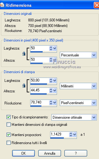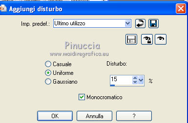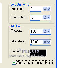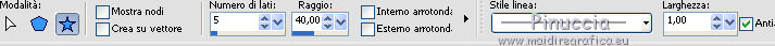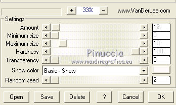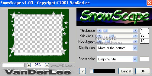 Se intendi usare il font, aprilo e minimizzalo. Lo troverai nella lista dei font disponibili, quando ti servirà. ![]() 1. Apri una nuova immagine trasparente 800 x 700 pixels. Scegli due colori dai tuoi tubes. Per il mio esempio ho usato come colore di primo piano il colore chiaro #7e0c0e, e come colore di sfondo il colore scuro #044a02. Riempi l'immagine trasparente con il colore chiaro di primo piano.2. Apri il tube "Merydesign_navidad12" e vai a Modifica>Copia. Torna al tuo lavoro e vai a Modifica>Incolla come nuovo livello. Spostalo un po' più in alto a sinistra.3. Apri il tube "stephygraff tube sapin(deco)" e vai a Modifica>Copia. Torna al tuo lavoro e vai a Modifica>Incolla come nuovo livello. Immagine>Rifletti. Spostalo a destra.Non preoccuparti adesso per la posizione. Più tardi potrai sistemarlo meglio. 4. Apri, copia e incolla le tre palline di natale. Per la pallina verde: Immagine>Ruota per gradi - 25 gradi a sinistra. ![]() Lascia la rossa come sta. Per la pallina gialla: Immagine>Ruota per gradi - 25 gradi a destra. ![]() Per le palline ruotate: Regola>Messa a fuoco>Metti a fuoco. Per tutte le palline: Effetti>Effetti 3D>Sfalsa ombra. ![]() Attiva il livello superiore. Apri il tube del nastro "cajoline_christmasCU9_14" e vai a Modifica>Copia. Torna al tuo lavoro e vai a Modifica>Incolla come nuovo livello. Immagine>Ridimensiona, al 50%, tutti i livelli non selezionato. ![]() Immagine>Ruota per gradi - 25 gradi a destra. Regola>Messa a fuoco>Metti a fuoco. Spostalo sulla pallina gialla.Effetti>Effetti 3D>Sfalsa ombra, con i settaggi precedenti. 5. Livelli>Nuovo livello raster. Riempi con il colore scuro di sfondo (tasto destro del mouse).Attiva lo strumento Selezione , rettangolo,e traccia un rettangolo pressappoco come nell'esempio. ![]() Premi sulla tastiera il tasto CANC. Effetti>Plugins>Alien Skin Xenofex 2.0 - Burnt Edges: ![]() Selezione>Deseleziona. Adesso puoi sistemare l'albero, che sembra un po' "corto". Attiva lo strumento Deformazione (tasto D sulla tastiera), posizionalo correttamente e allungalo un po'. ![]() Dovresti avere qualcosa di simile. ![]() 6. Attiva il livello superiore. Livelli>Nuovo livello raster. Attiva lo strumento Forme simmetriche stella ![]() ![]() Chiudi il colore di sfondo. Traccia intorno alla cornice delle stelle di diverse misure; queste le prime tre;. ![]() Quando hai disegnato tutte le stelle, attiva lo strumento Bacchetta magica e clicca al centro dell'immagine.Selezione>Inverti. Attiva il livello sottostante del bordo. Premi sulla tastiera il tasto CANC. Adesso puoi eliminare il livello superiore che ti è servito per disegnare le stelle. Selezione>Deseleziona. Effetti>Effetti 3D>Sfalsa ombra, ombra su nuovo livello selezionato. ![]() Rimani sul livello dell'ombra. Livelli>Nuovo livello raster, rinomina questo livello "neve" e chiudilo. Attiva il livello superiore. Regola>Aggiungi/Rimuovi disturbo>Aggiungi disturbo. ![]() Effetti>Plugins>VDL Adrenaline - Snowscape. ![]() 7. Aggiungi tutti i tubes accessori che preferisci, applicando un leggero effetto Sfalsa ombra. Se utilizzi i tubes forniti con il materiale, lo Sfalsa ombra non è necessario. 8. Scrivi un testo sull'etichetta. Aggiungi il tuo nome e/o il tuo watermark. 9. Se vuoi, puoi usare il lavoro così come sta, se invece vuoi aggiungere un bordo: Livelli>Nuovo livello raster. Selezione>Seleziona tutto. Riempi la selezione con il colore di primo piano.Selezione>Modifica>Contrai - 5 pixels. ![]() Premi sulla tastiera il tasto CANC. Selezione>Deseleziona. 10. Apri e attiva il livello "neve". Effetti>Plugins>VanDerLee - Snowflakes: ![]() Modifica>Copia Unione. Apri Animation Shop e vai a Modifica>Incolla>Incolla come nuova animazione. Torna in PSP. Modifica>Annulla azione Snowflakes. Effetti>Plugins>VanDerLee - Snowflakes: ![]() Modifica>Copia Unione. Torna in Animation Shop e vai a Modifica>Incolla>Incolla dopo il fotogramma corrente. Di nuovo in PSP. Modifica>Annulla azione Snowflakes. Effetti>Plugins>VanDerLee - Snowflakes: ![]() Modifica>Copia Unione. In Animation Shop: Modifica>Incolla>Incolla dopo il fotogramma corrente. Modifica>Seleziona tutto. Animazione>Proprietà fotogramma, e imposta la velocità a 20. ![]() Controlla il risultato cliccando su Visualizza e salva in formato gif.