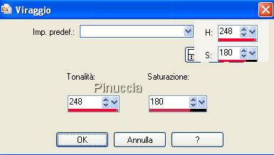 Regola>Tonalità e saturazione>Viraggio, con i valori corrispondenti al colore rosso.
