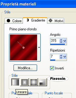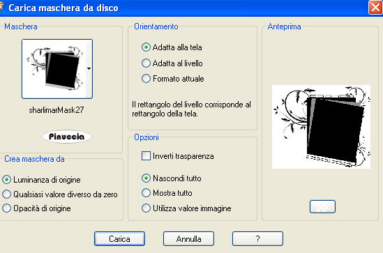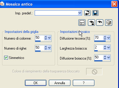 qui puoi trovare qualche risposta ai tuoi dubbi. Se l'argomento che ti interessa non è presente, ti prego di segnalarmelo. Questo tutorial è stato creato con PSP 9, ma può essere eseguito anche con le altre versioni di PSP. Per tradurlo, ho usato PSP X. Questo tutorial è una creazione di ©Sille e non può essere copiato su altri siti nè essere offerto per il download. Lo stesso vale per la mia traduzione. Occorrente: Materiale qui Filtri: Graphics Plus qui Metti la maschera nella cartella Maschere. 1. Apri una nuova immagine trasparente 700 x 600 pixels. Scegli due colori dai tuoi tubes. Imposta il colore chiaro come colore di primo piano, e il colore scuro come colore di sfondo. Passa il colore di primo piano a Gradiente di primo piano/sfondo, con i seguenti settaggi: ![]() Riempi l'immagine trasparente con questo gradiente.2. Livelli>Nuovo livello raster. Riempi il livello con il colore scuro di sfondo.Livelli>Carica/Salva maschera>Carica maschera da disco. Cerca e carica la maschera SharlimarMask27: ![]() Livelli>Unisci>Unisci gruppo. Effetti>Effetti 3D>Sfalsa ombra: ![]() Effetti>Plugins>Graphics Plus - Cross Shadow: ![]() 3. Apri il tube della donna e vai a Modifica>Copia. Torna al tuo lavoro e vai a Modifica>Incolla come nuovo livello. Attiva lo strumento Deformazione ![]() puntatore oppure premi sulla tastiera il tasto De adatta il tube nei limiti della maschera. ![]() ![]() Nella paletta dei livelli, porta questo livello sotto il livello della maschera. ![]() 4. Attiva il livello superiore. Apri il tube del fiore e vai a Modifica>Copia. Torna al tuo lavoro e vai a Modifica>Incolla come nuovo livello. Immagine>Ruota per gradi - 90 gradi a sinistra. ![]() Effetti>Effetti 3D>Sfalsa ombra: ![]() 5. Livelli>Unisci>Unisci visibile. Immagine>Ridimensiona, all'80%, tutti i livelli non selezionato. ![]() Regola>Messa a fuoco>Metti a fuoco. Immagine>ruota per gradi - 10 gradi a sinistra. ![]() Livelli>Duplica. Immagine>Rifletti. 6. Livelli>Nuovo livello raster. Livelli>Disponi>Porta sotto. Riempi con il colore scuro di sfondo.Effetti>Plugins>Graphics Plus - Cross Shadow, con i settaggi standard. 7. Attiva il livello originale (Uniti). Effetti>Effetti di trama>Mosaico antico. ![]() Effetti>Effetti di bordo>Aumenta di più. 8. Attiva il livello superiore (il livello duplicato). Effetti>Effetti 3D>Sfalsa ombra, come al punto 4. Ripeti l'Effetto Sfalsa ombra, cambiando verticale e orizzontale con -5. Livelli>Duplica. Immagine>Ridimensiona, al 50%, tutti i livelli non selezionato. Immagine>Rifletti. Posiziona questo livello come preferisci, o vedi il mio esempio.9. Livelli>Unisci>Unisci visibile. Livelli>Duplica. Immagine>Ridimensiona, al 90%, tutti i livelli non selezionato. Regola>Messa a fuoco>Metti a fuoco. Effetti>Effetti 3D>sfalsa ombra, come al punto 8, con la ripetizione a -5. 10. Attiva il livello inferiore. Effetti>Plugins>Graphics Plus - Cross Shadow, con i settaggi standard, 2 volte. Livelli>Duplica. Immagine>Rifletti. Abbassa l'opacità di questo livello al 50%. 10. Attiva lo strumento Testo e scrivi un testo sull'immagine, senza dimenticare di aggiungere il tuo nome e/o il tuo watermark.11. Livelli>Unisci>Unisci tutto. Immagine>Aggiungi bordatura, 1 pixel, simmetriche, con il colore nero. Hai finito. Puoi salvare in formato jpg. Se hai problemi o dubbi, o trovi un link non funzionante, o anche soltanto per un saluto, scrivimi. 18 Gennaio 2009 |