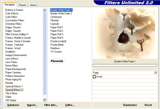 qui puoi trovare qualche risposta ai tuoi dubbi. Se l'argomento che ti interessa non è presente, ti prego di segnalarmelo. Questo tutorial è stato creato con PSP 9, ma può essere eseguito anche con le altre versioni di PSP. Per tradurlo, ho usato PSP X. Questo tutorial è una creazione di ©Sille e non può essere copiato su altri siti nè essere offerto per il download. Lo stesso vale per la mia traduzione. Occorrente: Materiale qui Filtri: FM Tile Tools - Blend Emboss qui Graphics Plus - Cross Shadow qui Filters Unlimited 2.0 qui 1. Apri una nuova immagine trasparente 600 x 500 pixels. Scegli due colori dai tuoi tubes. Imposta il colore chiaro come colore di primo piano, e il colore scuro come colore di sfondo. Riempi l'immagine trasparente con il colore di primo piano.Selezione>Seleziona tutto. Livelli>Nuovo livello raster. Apri il tube 102scenery e vai a Modifica>Copia. Torna al tuo lavoro e vai a Modifica>incolla nella selezione. Selezione>Deseleziona. Effetti>Effetti di immagine>Motivo unico: ![]() Cambia la modalità di miscelatura di questo livello in Luminanza. Effetti>Plugins>FM Tile Tools - Blend Emboss: ![]() 2. Apri il tube "christmist a kiss", e vai a Modifica>Copia. Torna al tuo lavoro e vai a Modifica>Incolla come nuovo livello. Sposta il tube a sinistra.Attiva lo strumento Gomma ![]() attiva il livello dello scenario (Raster 2) e cancella dal viso le tracce del tube. ![]() 3. Apri "mds7979Heart" e vai a Modifica>copia. Torna al tuo lavoro e vai a Modifica>Incolla come nuovo livello. Sposta il tube in alto a destra.Cambia la modalità di miscelatura di questo livello in Luminanza (esistente). Nel mio esempio ho applicato al tube un leggero effetto Sfalsa ombra. Decidi tu come ti sembra meglio. 4. Apri il tube delle chiavi "Manon_kuschelirmel_the key" e vai a Modifica>Copia. Torna al tuo lavoro e vai a Modifica>Incolla come nuovo livello. Immagine>Ridimensiona, all'80%, tutti i livelli non selezionato. Posiziona il tube a destra, come nel mio esempio.Livelli>Unisci>Unisci visibile. 5. Effetti>Plugins>Filters Unlimited 2.0 - Special Effects 2 - Border White Fade 1: ![]() 6. Apri il tube "borte" e vai a Modifica>Copia. Torna al tuo lavoro e vai a Modifica>Incolla come nuovo livello. Sposta il nastro contro il bordo a sinistra.Livelli>Duplica. Immagine>Rifletti. Livelli>Duplica. Immagine>Ruota per gradi - 90 gradi a sinistra: ![]() Sposta questo nastro contro il bordo in alto.Attiva lo strumento Puntatore ![]() Deformazione se stai usando PSP 9,e "tira" il nastro per coprire tutta la larghezza dell'immagine. Livelli>Duplica. Immagine>Capovolgi. 7. Chiudi il livello di sfondo e vai a Livelli>Unisci>Unisci visibile. Effetti>Plugins>Graphics Plus - Cross Shadow: ![]() 8. Effetti>Plugins>FM Tile Tools - Blend Emboss, con i settaggi standard, 2 volte. ![]() Riapri il livello di sfondo. Aggiungi il tuo nome e/o il tuo watermark. Livelli>Unisci>Unisci tutto. Immagine>Aggiungi bordatura, 1 pixel, simmetriche, con il colore scuro di sfondo. Se hai problemi o dubbi, o trovi un link non funzionante, o anche soltanto per un saluto, scrivimi. 22 Novembre 2008 |