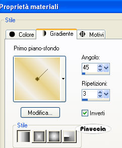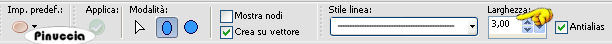 qui puoi trovare qualche risposta ai tuoi dubbi. Se l'argomento che ti interessa non è presente, ti prego di segnalarmelo. Questo tutorial è stato creato con PSP 9, ma può essere eseguito anche con le altre versioni di PSP. Per tradurlo, ho usato PSP X. Questo tutorial è una creazione di ©Sille e non può essere copiato su altri siti nè essere offerto per il download. Lo stesso vale per la mia traduzione. Occorrente: Materiale qui Filtri: Xero - Porcelain qui Apri i tubes in PSP, duplicali usando sulla tastiera la combinazione di tasti shift(maiuscola)+D e chiudi gli originali. Metti il file krisbigdot nella cartella Linee di stile. 1. Apri una nuova immagine trasparente 600 x 500 pixels. Scegli due colori dai tuoi tubes. Imposta il colore chiaro come colore di primo piano, e il colore scuro come colore di sfondo. Passa il colore di primo piano a Gradiente di primo piano/sfondo, con i seguenti settaggi: ![]() Riempi l'immagine trasparente con il gradiente.Regola>Sfocatura>Sfocatura gaussiana - raggio 25. ![]() 2. Apri il tube della prima donna MMC MAE2008_040 e vai a Modifica>Copia. Torna al tuo lavoro e vai a Modifica>Incolla come nuovo livello. Immagine>Ridimensiona, all'80%, tutti i livelli non selezionato. Attiva lo strumento Forme predefinite-ellisse ![]() e seleziona la linea di stile Krisbigdot, ![]() con i seguenti settaggi: ![]() Imposta il colore di primo piano con il bianco (o il colore che preferisci) e chiudi il colore di sfondo. Traccia un'ellisse intorno al tube della donna. ![]() Livelli>Converti in livello raster. Attiva lo strumento Bacchetta magica ![]() e clicca sull'area esterna all'ellisse per selezionarla. ![]() Attiva il livello della donna e premi sulla tastiera il tasto CANC. Attiva il livello dell'ellisse. Effetti>Effetti 3D>Sfalsa ombra: ![]() Livelli>Unisci>Unisci giù. 3. Ripeti tutto il passaggio precedente con il tube della seconda donna MMC MAE2008_040 (ridimensionandolo quanto necessario). 4. Attiva il livello di sfondo. Apri il tube del fiore Alliances-marti-2008 e vai a Modifica>Copia. Torna al tuo lavoro e vai a Modifica>Incolla come nuovo livello. Immagine>Ridimensiona, all'80%, tutti i livelli non selezionato. Posiziona il fiore tra le due donne.Apri il tube del fazzoletto "krajka1" e vai a Modifica>copia. Torna al tuo lavoro e vai a Modifica>Incolla come nuovo livello. Immagine>Ridimensiona, come ti sembra meglio (nel mio esempio ho ridimensionato 2 volte al 50%). Posiziona il fazzoletto sotto la donna a destra, o come preferisci.se parte del fazzoletto dovesse essere visibile sullo sfondo dell'ellisse a sinistra, attiva lo strumento gomma e cancella questa parte. ![]() 5. Attiva il livello superiore. Apri GL Lace e scegli un pizzo per il tuo bordo. Posizionati sul livello corrispondente e vai a Modifica>Copia. Torna al tuo lavoro e vai a Modifica>Incolla come nuovo livello. Attiva lo strumento Deformazione ,puntatore se stai usando PSP X, oppure premi sulla tastiera il tasto D, e allunga il pizzo per tutta l'altezza della tela. ![]() Regola>Messa a fuoco>Metti a fuoco. Sposta il pizzo a sinistra.Livelli>Duplica. Immagine>Rifletti. Ancora Livelli>Duplica e sposta il pizzo al centro (altrimenti nel prossimo passaggio non lo vedresti). Immagine>Ruota per gradi - 90 gradi a destra: ![]() Tasto D sulla tastiera e allarga il pizzo per tutta la larghezza della tela. Regola>Messa a fuoco>Metti a fuoco. Sposta il pizzo in basso sopra il bordo.![]() Livelli>Duplica. Immagine>Capovolgi. 6. Controlla che tutti i tubes siano al posto giusto. Eventualmente puoi ancora spostarli per sistemarli meglio.7. Apri il tube del fiocco SS-Elegance-Bow 1. Regola>Tonalità e saturazione>Viraggio: ![]() Modifica>Copia. Torna al tuo lavoro e vai a Modifica>Incolla come nuovo livello. Immagine>Ridimensiona quanto ti sembra meglio (per il mio esempio ho ridimensionato 2 volte al 60%). Regola>Messa a fuoco>Metti a fuoco. Posiziona il fiocco sull'ellisse a sinistra.Livelli>Duplica. Immagine>Ridimensiona, quando necessario per posizionare il fiocco sull'ellisse a destra.Regola>Messa a fuoco>Metti a fuoco. Attiva lo strumento Testo e scrivi un testo sull'immagine, senza dimenticare di aggiungere il tuo nome e/o il tuo watermark.8. Livelli>Unisci>Unisci visibile. Immagine>Aggiungi bordatura, 1 pixel, simmetriche, con il colore bianco. Effetti>Plugins>Xero - Porcelain, con i settaggi standard. ![]() Regola>Messa a fuoco>Metti a fuoco. Hai finito. Puoi salvare in formato jpg. Se hai problemi o dubbi, o trovi un link non funzionante, o anche soltanto per un saluto, scrivimi. 12 Gennaio 2009 |