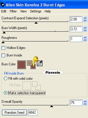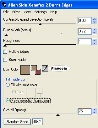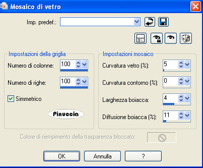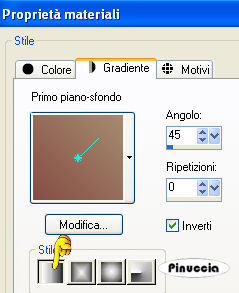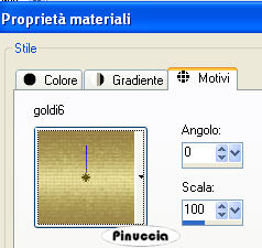 qui puoi trovare qualche risposta ai tuoi dubbi. Se l'argomento che ti interessa non è presente, ti prego di segnalarmelo. Questo tutorial è stato creato con PSP 9, ma può essere eseguito anche con le altre versioni di PSP. Per tradurlo, ho usato PSP X. Questo tutorial è una creazione di ©Sille e non può essere copiato su altri siti nè essere offerto per il download. Lo stesso vale per la mia traduzione. Occorrente: Materiale qui Filtri: Graphics Plus - Cross Shadow qui FM Tile Tools - Blend Emboss qui Alien Skin Xenofex 2 - Burnt Edges qui Metti il motivo oro "goldi6" nella cartella Motivi. 1. Apri una nuova immagine trasparente 700 x 600 pixels. Scegli due colori dai tuoi tubes. Imposta il colore di primo piano con il colore chiaro (il mio #a58b70), e il colore di sfondo con il colore scuro (il mio #864d44). Passa il colore di primo piano a Gradiente di primo piano/sfondo, con i seguenti settaggi. ![]() Riempi l'immagine trasparente con il gradiente.Selezione>Seleziona tutto. Dalla cartella dello scrap apri "BG_throneupholstery" e vai a Modifica>Copia. Torna al tuo lavoro e vai a Modifica>Incolla nella selezione. Selezione>Deseleziona. Effetti>Plugins>FM Tile Tools - Blend Emboss, con i settaggi standard. ![]() Effetti>Plugins>Alien Skin Xenofex 2 - Burnt Edges: clicca sulla piccola palettina del colore per impostare il colore di sfondo. ![]() 2. Dalla cartella dello scrap apri "BG_goldorganza" e vai a Modifica>Copia. Torna al tuo lavoro e vai a Modifica>Incolla come nuovo livello. Immagine>Ridimensiona, al 20%, tutti i livelli non selezionato. Effetti>Plugins>FM Tile Tools - Blend Emboss, con i settaggi standard. ![]() Effetti>Plugins>Alien Skin Xenofex 2 - Burnt Edges: clicca sulla piccola palettina del colore per impostare il colore di primo piano. ![]() Immagine>Ruota per gradi - 3 gradi a sinistra: ![]() Regola>Messa a fuoco>Metti a fuoco. Effetti>Effetti 3D>Sfalsa ombra: ![]() Ripeti l'Effetto Sfalsa ombra, cambiando verticale e orizzontale con -3. Livelli>Duplica, e attiva il livello sottostante. Effetti>Effetti di trama>Mosaico di vetro: ![]() Posiziona i due livelli pressappoco come nell'esempio.![]() 3. Dalla cartella dello scrap apri "Element_goldenframe" e vai a Modifica>Copia. Torna al tuo lavoro e vai a Modifica>Incolla come nuovo livello. non preoccuparti se non vedi niente; il tube ha dimensioni tali da uscire dalla tua tela Immagine>Ridimensiona, al 27%, tutti i livelli non selezionato. Regola>Messa a fuoco>Metti a fuoco. Effetti>Plugins>Graphics Plus - Cross Shadow: ![]() Effetti>Effetti 3D>Sfalsa ombra: ![]() Attiva lo strumento Bacchetta magica ![]() e clicca all'interno della cornice. ![]() Selezione>Modifica>Espandi - 1 pixel. Livelli>Nuovo livello raster. Riempi la selezione con il gradiente.Apri il tube della donna. Prima di copiarlo: Immagine>Rifletti. Modifica>Copia. Torna al tuo lavoro e vai a Modifica>Incolla come nuovo livello. Immagine>Ridimensiona, al 55%, tutti i livelli non selezionato. Sistema il tube nella selezione.Regola>Messa a fuoco>Metti a fuoco. Selezione>Inverti. Premi sulla tastiera il tasto CANC ![]() Selezione>Deseleziona. Livelli>Unisci>Unisci giù (per unire il livello del tube con il livello del gradiente). Livelli>Disponi>Sposta giù (per spostare il livello sotto il livello della cornice. Attiva il livello della cornice e vai a Livelli>Unisci>Unisci giù, per unire il livello della cornice con il livello del tube. 4. Adesso puoi aggiungere gli elementi decorativi allo scrap (tranne il pizzo e il divisorio). Se vuoi seguire il mio esempio: Dalla cartella dello scrap apri "Element rubybrad" e vai a Modifica>Copia. Torna al tuo lavoro e vai a Modifica>Incolla come nuovo livello. Immagine>Ridimensiona, al 60%, tutti i livelli non selezionato. Regola>Messa a fuoco>Metti a fuoco. Effetti>Effetti 3D>Sfalsa ombra: ![]() Ripeti l'Effetto Sfalsa ombra, cambiando verticale e orizzontale con -2. Spostalo in basso a destra.Apri Element_largebutterfly e vai a Modifica>Copia. Torna al tuo lavoro e vai a Modifica>Incolla come nuovo livello. Immagine>Ridimensiona, al 40%, tutti i l ivelli non selezionato. Regola>Messa a fuoco>Metti a fuoco. Effetti>Effetti 3D>Sfalsa ombra, come al punto 4. Sposta il tube in alto a destra.Dalla cartella dello scrap apri Element_stiching e vai a Modifica>Copia. Torna al tuo lavoro e vai a Modifica>Incolla come nuovo livello. Immagine>Ridimensiona, all'80%, tutti i livelli non selezionato. Immagine>Ruota per gradi - 90 gradi a destra. Regola>Messa a fuoco>Metti a fuoco. Effetti>Effetti 3D>Sfalsa ombra, come al punto 4. Spostalo a sinistra come nel mio esempio.Dalla cartella dello scrap apri "Element skeletonleaves" e vai a Modifica>Copia. Torna al tuo lavoro e vai a Modifica>Incolla come nuovo livello. Immagine>Ridimensiona, al 50%, tutti i l ivelli non selezionato. Immagine>Ruota per gradi - 45 gradi a destra. Regola>Messa a fuoco>Metti a fuoco. Effetti>Effetti 3D>Sfalsa ombra, come al punto 4. Nella paletta dei livelli sposta questo livello sotto il livello della cornice. Sposta la foglia nell'angolo in alto a sinistra della cornice.![]() Attiva il livello inferiore. Immagine>Dimensione tela: ![]() Clicca con la bacchetta magica nello spazio trasparente.Passa il colore di primo piano a Motivi e seleziona il motivo oro. ![]() Regola>Sfocatura>Sfocatura gaussiana - raggio 10. ![]() Mantieni selezionato. Effetti>Effetti di trama>Mosaico di vetro. ![]() Selezione>Deseleziona. 5. Attiva il livello superiore. Dalla cartella dello scrap, apri Element_goldensshawl e vai a Modifica>Copia. Torna al tuo lavoro e vai a Modifica>Incolla come nuovo livello. Immagine>Ridimensiona, al 35%, tutti i livelli non selezionato. Sposta il pizzo contro il bordo superiore.Regola>Messa a fuoco>Metti a fuoco. Effetti>Effetti 3D>Sfalsa ombra, come al punto 4. 6. Dalla cartella dello scrap apri "Element_swirlywire" e vai a Modifica>Copia. Torna al tuo lavoro e vai a Modifica>Incolla come nuovo livello. Immagine>Ridimensiona, al 35%, tutti i l