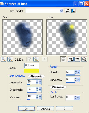Effetti>Effetti di illuminazione - Sprazzo di luce, con i seguenti settaggi: