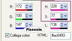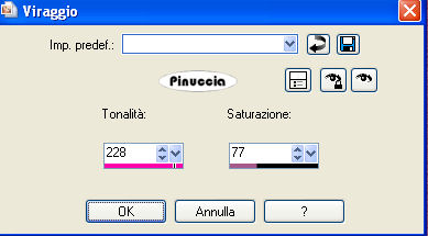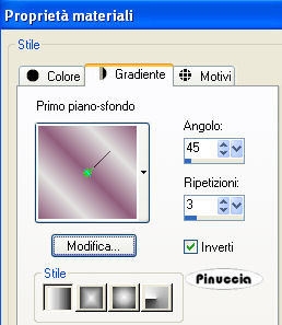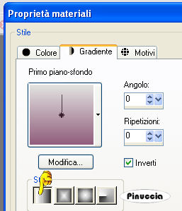 qui puoi trovare qualche risposta ai tuoi dubbi. Se l'argomento che ti interessa non è presente, ti prego di segnalarmelo. Questo tutorial è stato creato con PSP 9, ma può essere eseguito anche con le altre versioni di PSP. Per tradurlo, ho usato PSP X. Questo tutorial è una creazione di ©Sille e non può essere copiato su altri siti nè essere offerto per il download. Lo stesso vale per la mia traduzione. Occorrente: Materiale qui Filtri: Graphics Plus - Cross Shadow qui FM Tile Tools - Blend Emboss qui Toadies - Blast'n Blur qui 1. Apri una nuova immagine trasparente 600 x 500 pixels. Scegli due colori dai tuoi tubes. Imposta il colore chiaro come colore di primo piano, e il colore scuro come colore di sfondo. Passa il colore di primo piano a Gradiente: ![]() Riempi l'immagine trasparente con il gradiente.2. Apri il tube della donna "MC370" e vai a Modifica>copia. Torna al tuo lavoro e vai a Modifica>Incolla come nuovo livello. Livelli>Carica/Salva maschera>Carica maschera da disco. Cerca e carica la maschera 20-20: ![]() se non hai la maschera clicca qui Livelli>Unisci>Unisci gruppo. Livelli>Duplica. Livelli>Unisci>Unisci giù. 3. Livelli>Nuovo livello raster. Selezione>Seleziona tutto. Apri il tube "5061084-lg" e vai a Modifica>copia. Torna al tuo lavoro e vai a Modifica>Incolla nella selezione. Selezione>Deseleziona. Cambia la modalità di miscelatura di questo livello in Luce diffusa. Immagine>Capovolgi. Sistema il tube come ti sembra meglio, o vedi il mio esempio.4. Livelli>Nuovo livello raster. Selezione>Seleziona tutto. Apri il tube "AH_Glass_broken" e vai a Modifica>copia. Torna al tuo lavoro e vai a Modifica>Incolla nella selezione. Selezione>Deseleziona. Prendi nota dei valori di tonalità (H) e Saturazione (S) del tuo colore scuro. ![]() Regola>Tonalità e saturazione>Viraggio e trascrivi i valori annotati nelle rispettive caselle. ![]() Immagine>Ridimensiona, al 130%, tutti i livelli non selezionato. ![]() Regola>Messa a fuoco>Metti a fuoco. Effetti>Plugins>Graphics Plus - Cross Shadow: ![]() Effetti>Plugins>FM Tile Tools - Blend Emboss, con i settaggi standard. ![]() Effetti>Effetti 3D>Sfalsa ombra: ![]() Ripeti l'Effetto Sfalsa ombra, cambiando verticale e orizzontale con -10. Controlla che tutto sia al posto giusto e vai a Livelli>Unisci>Unisci tutto. ![]() Immagine>Aggiungi bordatura, 1 pixel, simmetriche, con il colore di sfondo. 5. Livelli>Innalza livello di sfondo. Immagine>Dimensione tela - 700 x 600 pixels: ![]() Livelli>Nuovo livello raster. Livelli>Disponi>Porta sotto. Cambia i settaggi del gradiente. ![]() Riempi il livello con questo gradiente.Effetti>Toadies - Blast'n Blur: ![]() Effetti>Plugins>FM Tile Tools - Blend Emboss, con i settaggi standard. Effetti>Plugins>Graphics Plus - Cross Shadow, con i settaggi precedenti: ![]() 6. Attiva il livello superiore. Effetti>Effetti 3D>sfalsa ombra, come al punto 4, con la ripetizione a -10. Apri il tube della cucitura "MisfitsScrapz Purple Passion Ribbon Eyelet" e vai a Modifica>Copia. Torna al tuo lavoro e vai a Modifica>Incolla come nuovo livello. Immagine>Ridimensiona, al 70%, tutti i livelli non selezionato. Regola>Tonalità e saturazione>Viraggio, con i settaggi precedenti. Effetti>Effetti 3D>Sfalsa ombra. ![]() Livelli>Duplica. Immagine>Rifletti. Chiudi il livello di sfondo e vai a Livelli>Unisci>Unisci visibile. Riapri il livello di sfondo. Sposta il livello Uniti in alto a destra (vedi il mio esempio).7. Apri il tube del fiore Katussia_kta011 e vai a Modifica>Copia. Torna al tuo lavoro e vai a Modifica>Incolla come nuovo livello. Immagine>Ridimensiona, all'80%, tutti i livelli non selezionato. Effetti>Effetti 3D>Sfalsa ombra, come al punto 6. Spostalo nell'angolo in basso a sinistra.Apri il tube della collana "MisfitsScrapz_PurplePassion Beads" e vai a Modifica>copia. Torna al tuo lavoro e vai a Modifica>Incolla come nuovo livello. Immagine>Ruota per gradi - 45 gradi a destra. ![]() Effetti>Effetti 3D>Sfalsa ombra, con i settaggi precedenti. Sposta la collanina come ti sembra meglio o vedi il mio esempio.Nella paletta dei livelli porta questo livello sotto il livello del fiore. 8. Apri il tube a-dozi's-metal-badges. E' già selezionata la targhetta "Memories". Modifica>Copia. Torna al tuo lavoro e vai a Modifica>Incolla come nuovo livello. Regola>Tonalità e saturazione>Viraggio, con i settaggi precedenti. Effetti>Effetti 3D>Sfalsa ombra, con i settaggi precedenti. ![]() Immagine>Ruota per gradi - 15 gradi a destra: ![]() Sposta la targhetta in basso a destra.Aggiungi il tuo nome e/o il tuo watermark. Immagine>Aggiungi bordatura, 1 pixel, simmetriche, con il colore di sfondo. Salva in formato jpg. Se hai problemi o dubbi, o trovi un link non funzionante, o anche soltanto per un saluto, scrivimi. 18 Gennaio 2009 |
