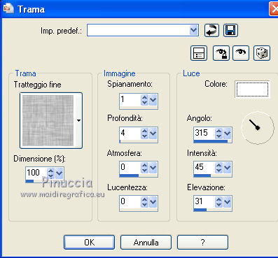 Effetti>Effetti di trama>Trama - seleziona la trama Tratteggio fine, con i seguenti settaggi: