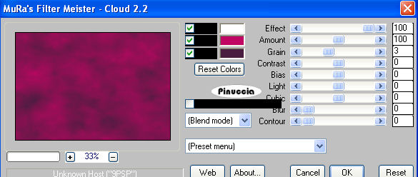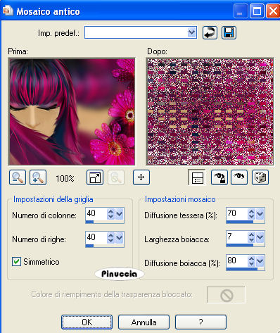 qui puoi trovare qualche risposta ai tuoi dubbi. Se l'argomento che ti interessa non è presente, ti prego di segnalarmelo. Questo tutorial è stato creato con PSP 9, ma può essere eseguito anche con le altre versioni di PSP. Per tradurlo, ho usato PSP X. Questo tutorial è una creazione di ©Sille e non può essere copiato su altri siti nè essere offerto per il download. Lo stesso vale per la mia traduzione. Occorrente: Materiale qui Filtri: FM Tile Tools - Blend Emboss qui Graphics Plus - Cross Shadow qui Xero - Porcelain qui Mura's Meister - Cloud qui 1. Apri una nuova immagine trasparente 650 x 450 pixels. Scegli due colori dai tuoi tubes. Imposta il colore chiaro come colore di primo piano, e il colore scuro come colore di sfondo. Effetti>Plugins>Mura's Meister - Cloud: ![]() 2. Livelli>Nuovo livello raster. Selezione>Seleziona tutto. Apri il tube della donna e vai a Modifica>Incolla nella selezione. Selezione>Deseleziona. Effetti>Effetti di immagine>Motivo unico, con i settaggi standard. ![]() Regola>Sfocatura>Sfocatura gaussiana - raggio 10. ![]() 3. Modifica>Incolla come nuovo livello (il tube della donna è ancora in memoria). Immagine>Ridimensiona, all'80%, tutti i livelli non selezionato. Sposta il tube a destra.Effetti>Plugins>FM Tile Tools - Blend Emboss, con i settaggi standard. ![]() Effetti>Effetti 3D>Sfalsa ombra. ![]() 4. Apri il tube del fiore e vai a Modifica>copia. Torna al tuo lavoro e vai a Modifica>Incolla come nuovo livello. Immagine>Ruota per gradi - 90 gradi a sinistra: ![]() Immagine>Ridimensiona, all'80%, tutti i livelli non selezionato. Sposta il tube contro il bordo a sinistra.Cambia la modalità di miscelatura di questo livello in Luce netta, e abbassa l'opacità all'80%. Effetti>Plugins>FM Tile Tools - Blend Emboss, con i settaggi standard. Livelli>Unisci>Unisci visibile. 5. Livelli>Duplica. Immagine>ridimensiona, all'80%, tutti i livelli non selezionato. Effetti>Effetti 3D>sfalsa ombra: ![]() Ripeti l'Effetto Sfalsa ombra, cambiando verticale e orizzontale con -5. Sposta questo livello in alto a sinistra, come nel mio esempio.![]() 6. Ancora una volta Livelli>Duplica. Immagine>Rifletti. Sposta anche questo livello in alto a sinistra, un po' discosto dal precedente.![]() 7. Di nuovo Livelli>Duplica. Immagine>Ridimensiona, al 50%, tutti i livelli non selezionato. Sposta questo livello a destra.![]() Ancora una volta Livelli>Duplica, e attiva il livello inferiore della piccola immagine. Effetti>Effetti di trama>Mosaico antico: ![]() Sposta ora il livello superiore un po' più in basso e a destra,in modo che rimanga visibile parte dell'effetto Mosaico (vedi il mio esempio). ![]() 8. Attiva lo strumento Testo , scegli un font e scrivi un testo sull'immagine,senza dimenticare il tuo nome e/o il tuo watermark. Livelli>Unisci>Unisci visibile. Effetti>Plugins>Xero - Porcelain, con i settaggi standard. ![]() Immagine>Aggiungi bordatura, 1 pixel, simmetriche, con il colore di sfondo. Hai finito. Puoi salvare in formato jpg. Se hai problemi o dubbi, o trovi un link non funzionante, o anche soltanto per un saluto, scrivimi. 22 Novembre 2008 |
