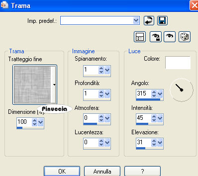 Effetti>Effetti di trama>Trama - seleziona Tratteggio fine con i seguenti settaggi: