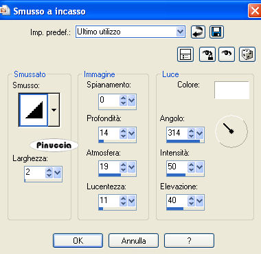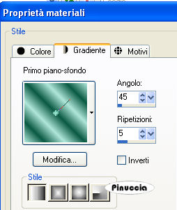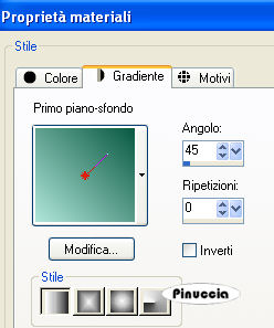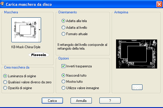qui puoi trovare qualche risposta ai tuoi dubbi. Se l'argomento che ti interessa non č presente, ti prego di segnalarmelo. Questo tutorial č stato creato con PSP 9, ma puņ essere eseguito anche con le altre versioni di PSP. Per tradurlo, ho usato PSP X. Questo tutorial č una creazione di ©Sille e non puņ essere copiato su altri siti nč essere offerto per il download. Lo stesso vale per la mia traduzione. Occorrente: Materiale qui Per il tube grazie Margit. Filtri: Graphics Plus - Cross Shadow qui Metti la maschera nella cartella Maschere. Apri i tubes in PSP, duplicali usando la combinazione di tasti shift(maiuscola)+D e chiudi gli originali. Apri il pennello agiseetheworld ed esportalo. Come fare vedi qui 1. Apri una nuova immagine trasparente 700 x 550 pixels. Scegli due colori dai tuoi tubes, imposta il colore chiaro come colore di primo piano, e il colore scuro come colore di sfondo. Passa il colore di primo piano a Gradiente di primo piano/sfondo con i seguenti settaggi: ![]() Riempi l'immagine trasparente con il gradiente.2. Livelli>Nuovo livello raster. Selezione>Seleziona tutto. Apri il tube di sfondo "adn-the-heavens-opened2", e vai a Modifica>Copia. Torna al tuo lavoro e vai a Modifica>incolla nella selezione. Cambia la modalitą di miscelatura di questo livello in Sovrapponi. Selezione>Deseleziona. 3. Livelli>Nuovo livello raster. Cambia i settaggi del gradiente, togliendo la selezione a Inverti: ![]() Riempi il livello con il gradiente.Livelli>Carica/Salva maschera>Carica maschera da disco. Cerca e carica la maschera KB-Mask-China-Style: ![]() Livelli>Unisci>Unisci gruppo. Effetti>Plugins>Graphics Plus - Cross Shadow. ![]() Effetti>Effetti 3D>Sfalsa ombra: ![]() 4. Apri il tube della donna "MMDesignz nov08_006si", e vai a Modifica>copia. Torna al tuo lavoro e vai a Modifica>Incolla come nuovo livello. Immagine>Ridimensiona, al 65%, tutti i livelli non selezionato. Regola>Messa a fuoco>Metti a fuoco. Effetti>Effetti 3D>Sfalsa ombra: ![]() Sposta il tube a sinistra.5. Apri il tube del fiore "two-magnolias-and...", e vai a Modifica>Copia. Torna al tuo lavoro e vai a Modifica>Incolla come nuovo livello. Immagine>Ridimensiona. Spostalo nell'angolo in basso a destra.Attiva il livello della Maschera. Attiva lo strumento Gomma ![]() e cancella le tracce della maschera dal tube del fiore: ![]() 6. Livelli>Nuovo livello raster. Attiva lo strumento Pennello ![]() cerca e seleziona il pennello agiseetheworld, e applicalo cliccando con il tasto destro del mouse per usare il colore di sfondo. 7. Livelli>Nuovo livello raster. Cambia nuovamente i settaggi del gradiente. ![]() Selezione>Seleziona tutto. Selezione>Modifica>Contrai - 10 pixels. ![]() Selezione>inverti. Riempi la selezione con il gradiente.Effetti>Plugins>Graphics Plus - Cross Shadow. ![]() Effetti>Effetti 3D>Smusso a incasso. ![]() Selezione>Deseleziona. 8. Aggiungi il tuo nome e/o il tuo watermark. Livelli>Unisci>Unisci tutto e salva in formato jpg. Se hai problemi o dubbi, o trovi un link non funzionante, o anche soltanto per un saluto, scrivimi. 4 Novembre 2008 |